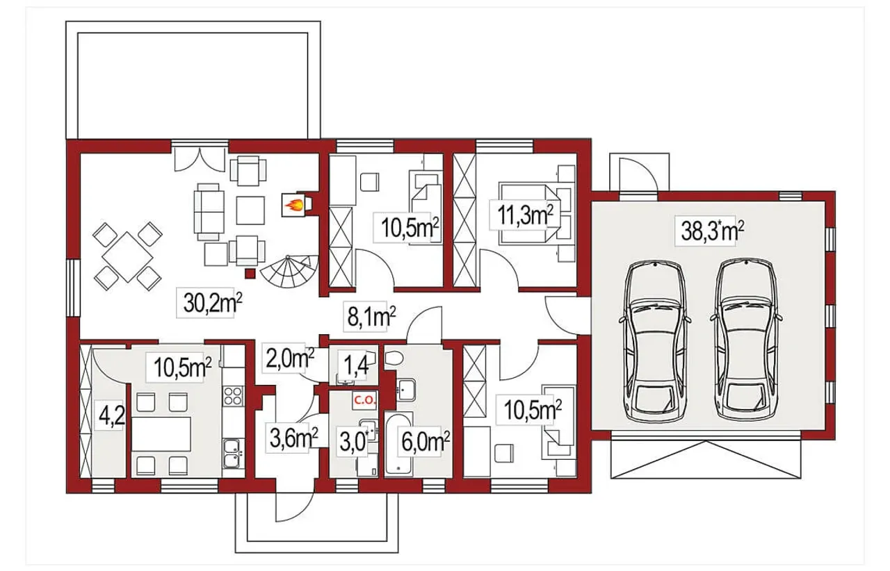 Wypełnij formularz i otrzymaj rysunki w pdf z dokładnymi wymiarami budynku i pomieszczeń (długość, szerokość, wysokość) dla projektu Gienia E z poddaszem do adaptacji z garażem dwustanowiskowym