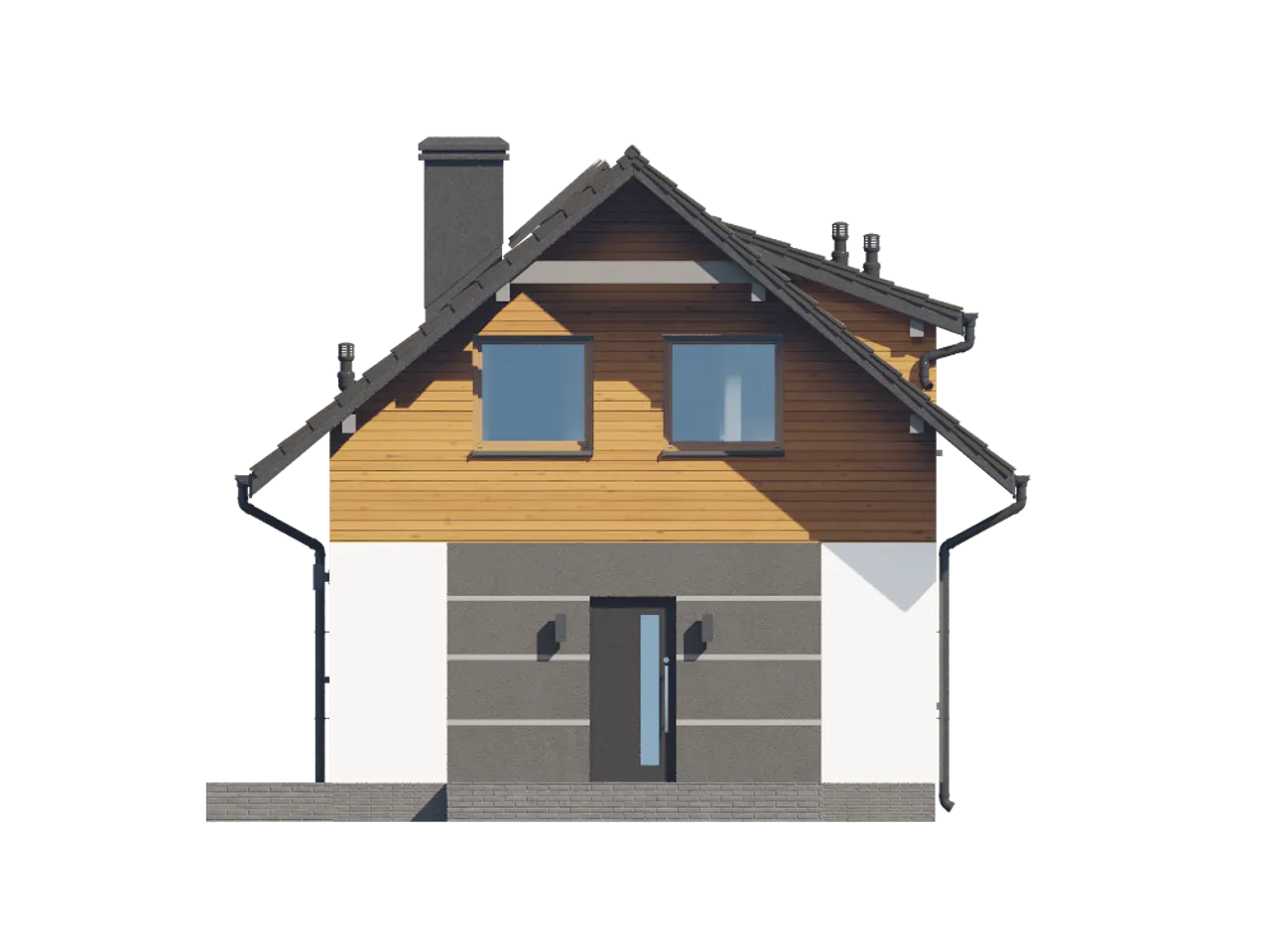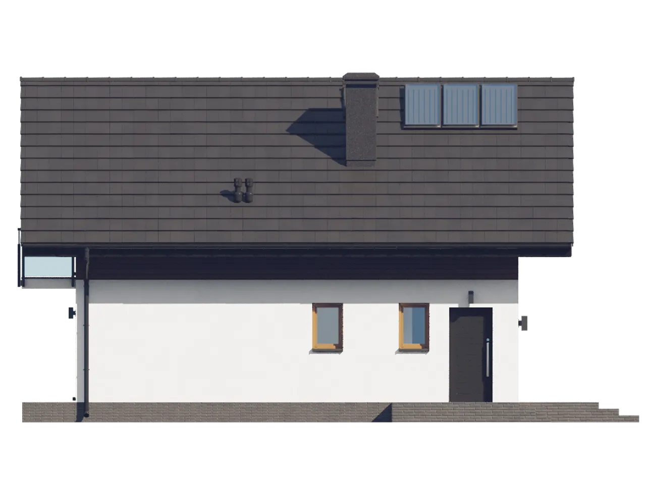 Kąt nachylenia dachu 40° oraz kalenica prostopadła do drogi podkreślają nowoczesną linię domu. Brak garażu pozwala w pełni wykorzystać powierzchnię mieszkalną, a przemyślana kondygnacja w formie parteru i poddasza daje bardzo duże możliwości aranżacji. Cztery przestronne pokoje oraz dodatkowa spiżarnia umożliwiają swobodne przechowywanie zapasów lub przetworów. Duża kotłownia sprawdzi się zarówno przy kotle gazowym, jak i na paliwo stałe.