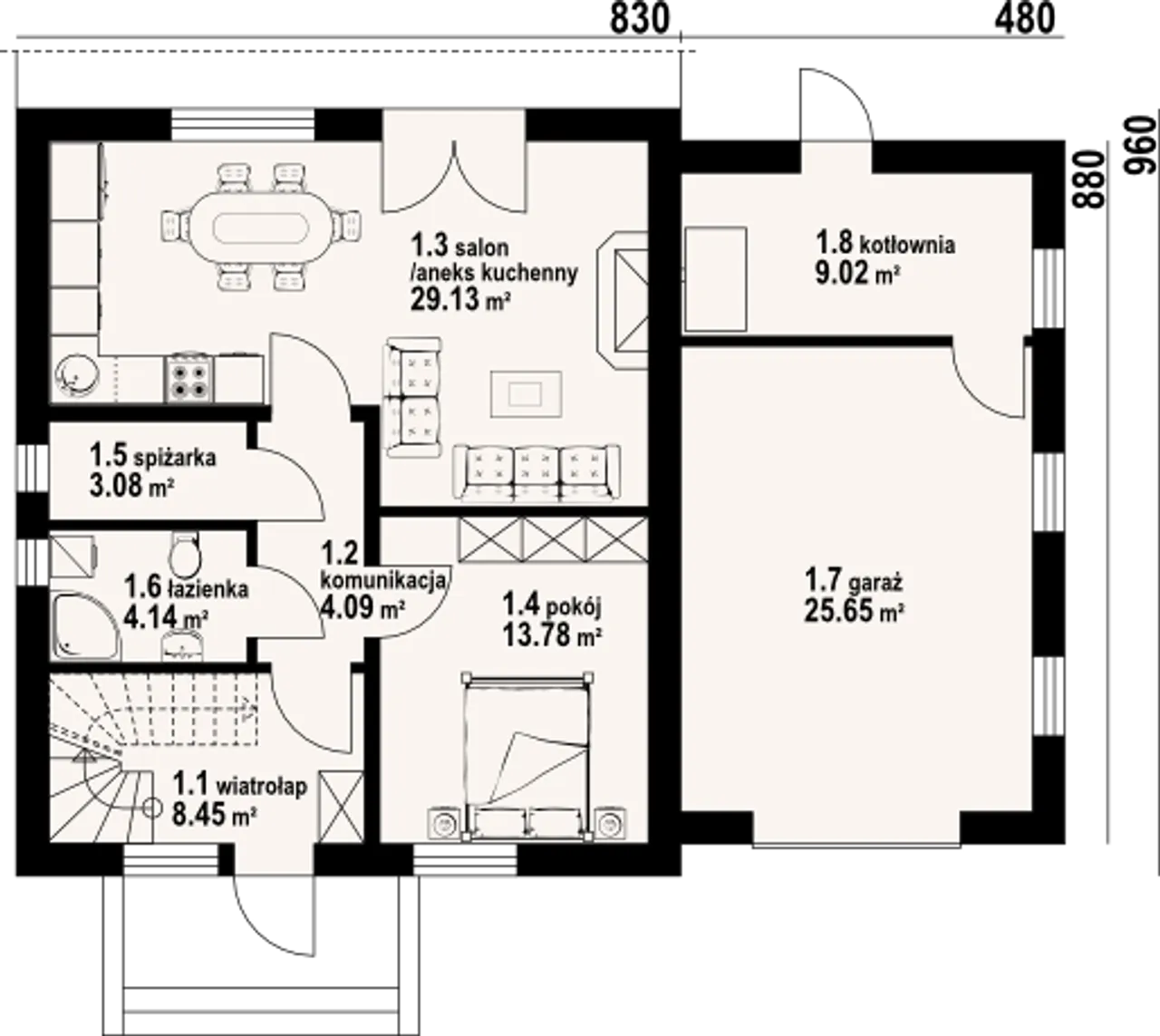 3. Salon z aneksem kuchennym | 29,13 m² |