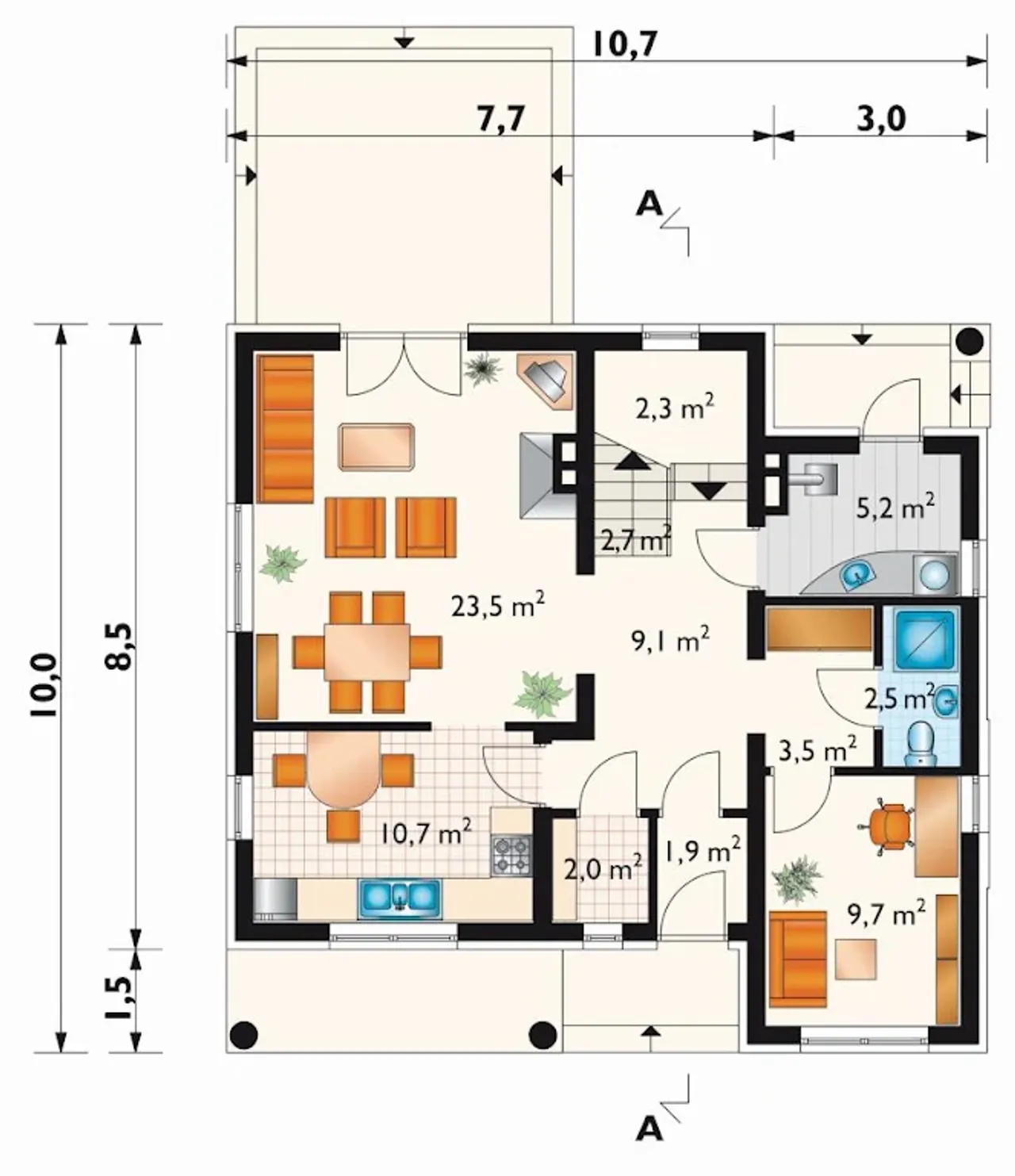 - elewacje - pokazują dokładny wygląd domu od frontu, z tyłu i z boków