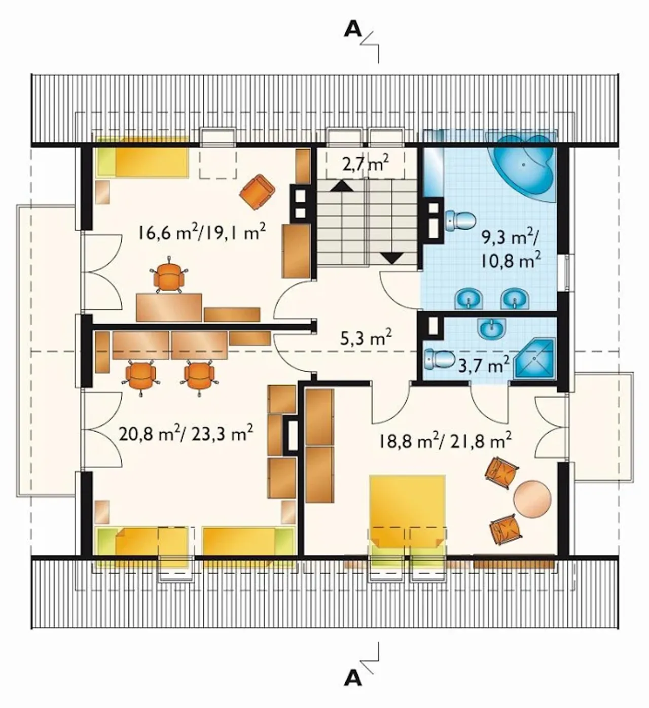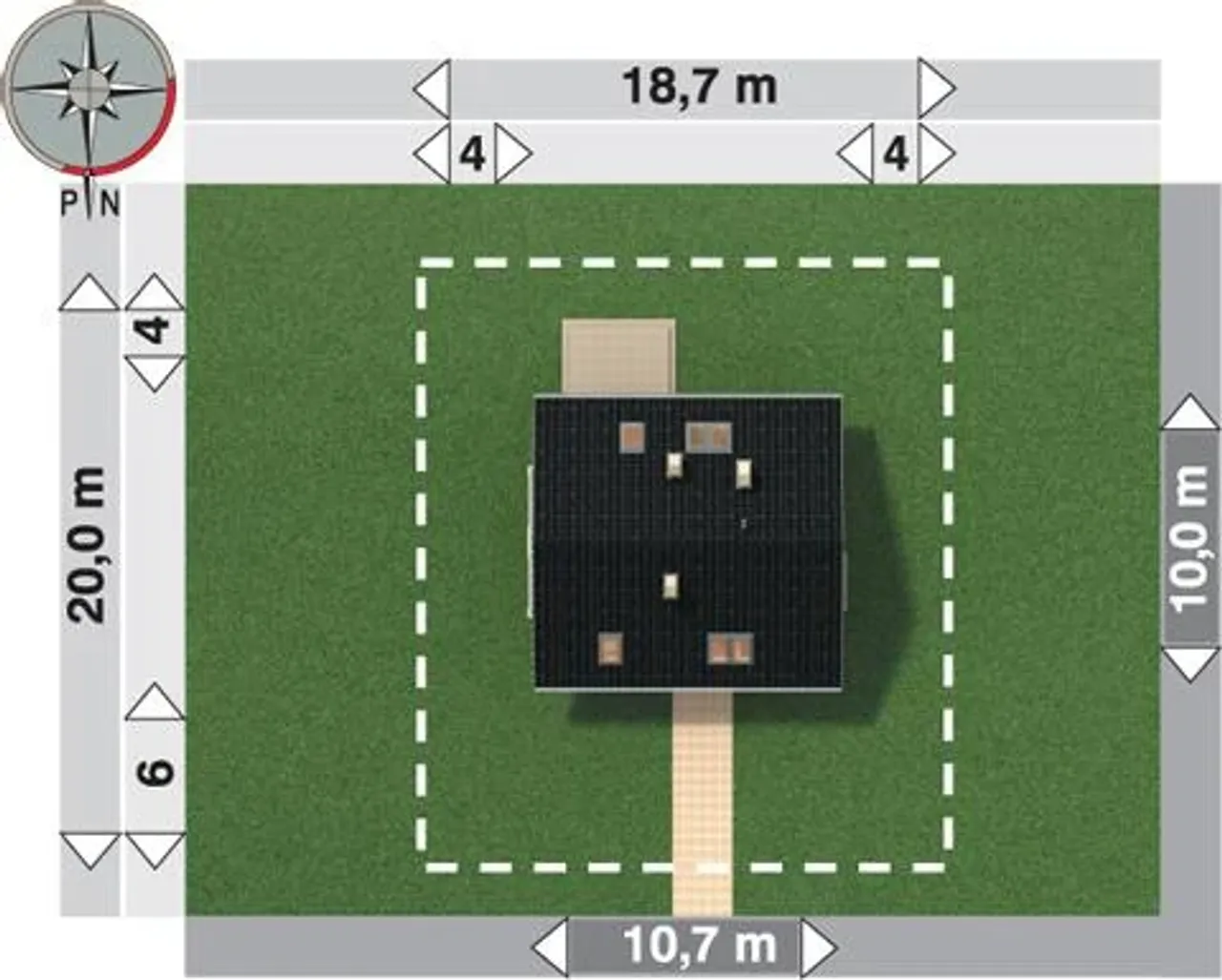 - rzut dachu - ukazuje jego kształt, wymiary, kąt nachylenia połaci, rozmieszczenie okien połaciowych, lukarn, świetlików i rur spustowych, pokazuje rozmieszczenie kominów i informuje o sposobie odwodnienia: rozmieszczeniu i rozmiarach rynien