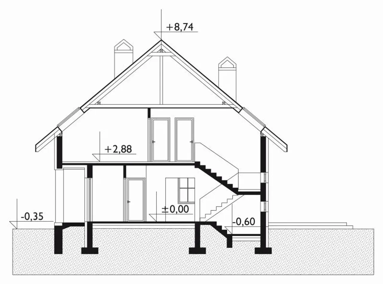 - przekroje - pokazują wszystkie elementy budynku po przecięciu go wzdłuż lub w poprzek od dachu do fundamentów tj. warstwy podłogi, stropów i dachu