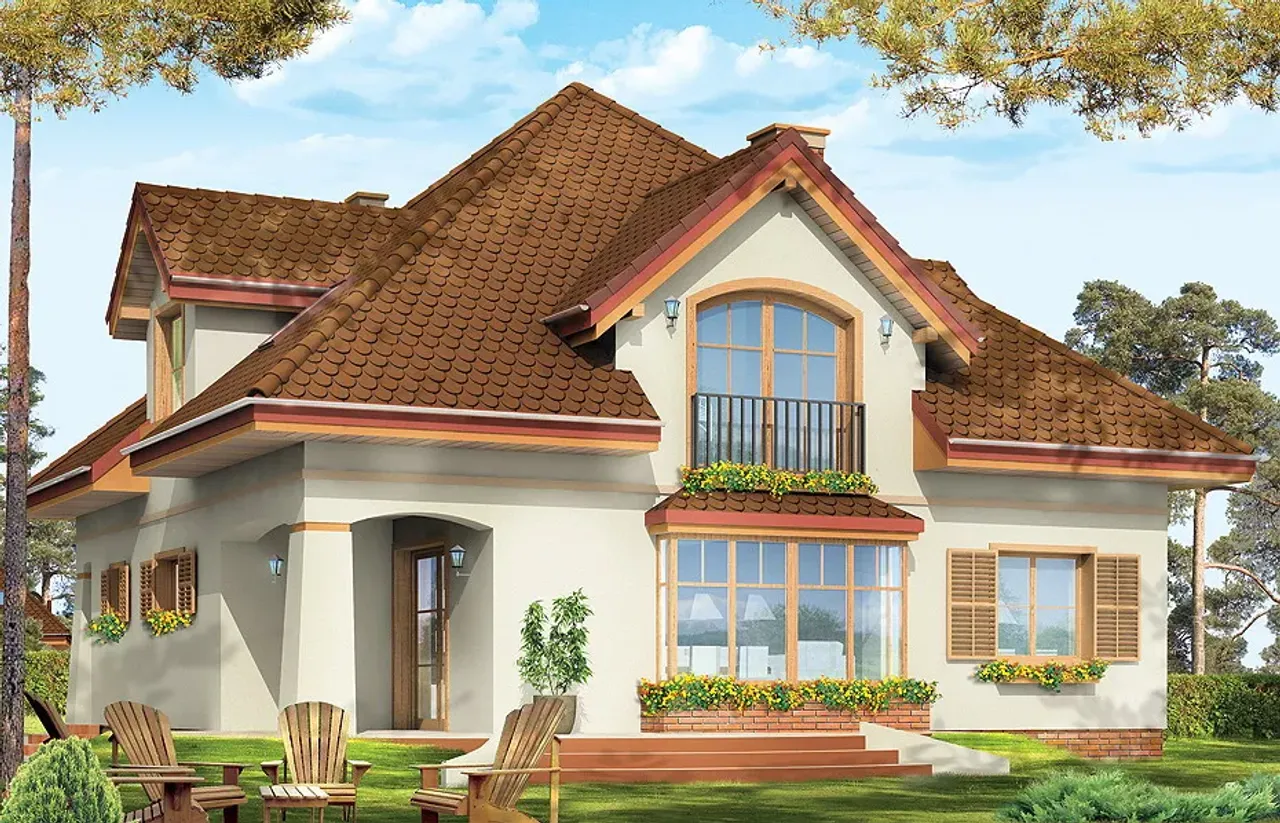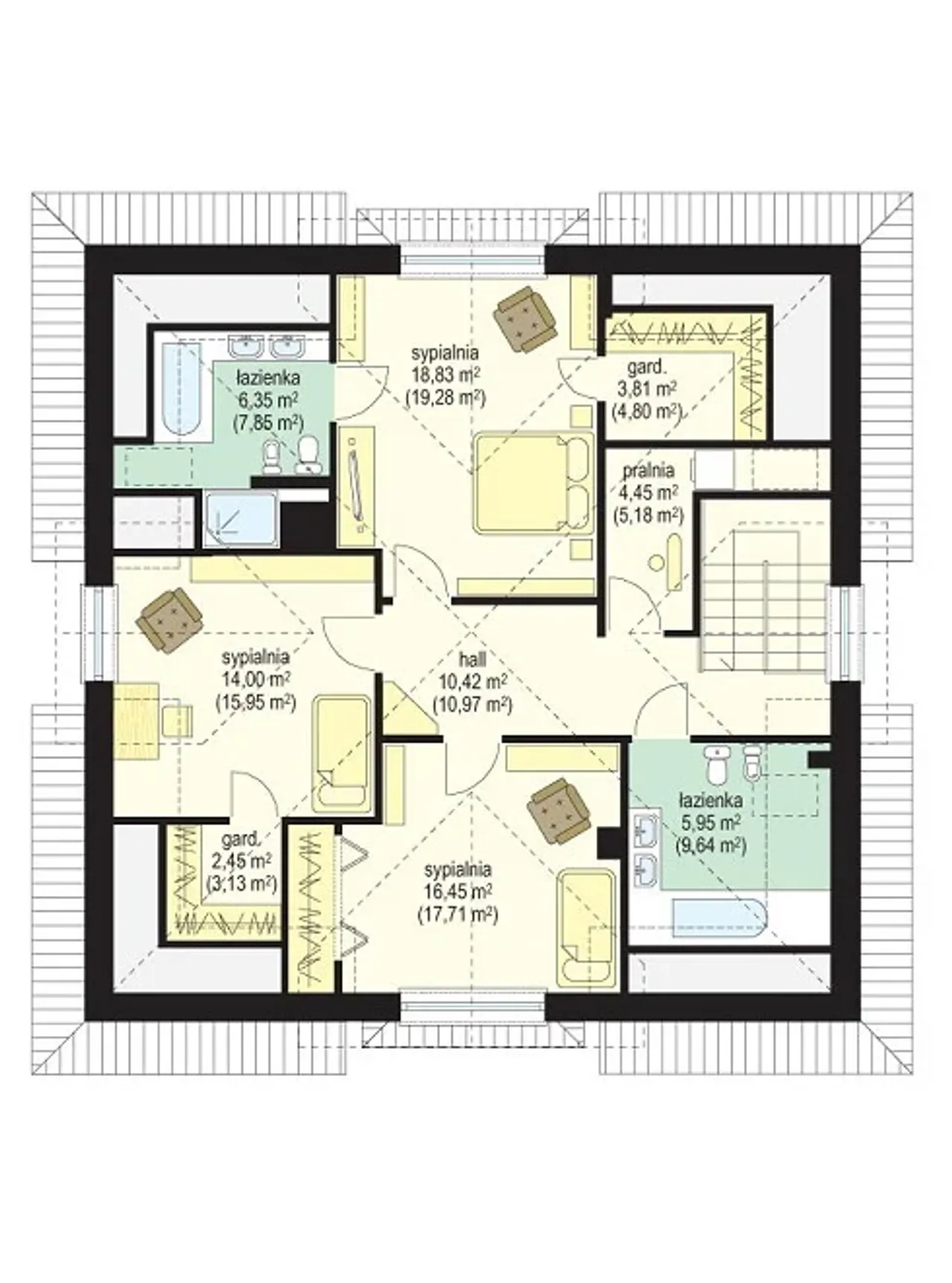 Projekt domu Gwiazda to dom w stylu dworku polskiego dla 5-6 osobowej rodziny. Budynek przykryty prostym, kopertowym dachem z dwiema lukarnami, parterowy, z poddaszem użytkowym, niepodpiwniczony, z jednostanowiskowym garażem. Powierzchnia użytkowa: 154,65 m2. Budynek może być posadowiony na działce od 500 m2. Projekt przewiduje ogrzewanie wodne zasilane piecem gazowym zainstalowanym w kotłowni za garażem. Dodatkowo można uzyskać ogrzewanie na bazie kominka. Projekt domu Gwiazda przewiduje na parterze salon z kominkiem, doświetlony dużym, prostokątnym wykuszem okiennym z bocznym, dwuskrzydłowym wyjściem na taras i centralnie położoną jadalnią. Obok częściowo otwarta kuchnia ze spiżarnią i łazienka. Z holu schody na poddasze. Poddasze użytkowe to sypialnia małżeńska z garderobą i łazienką, dwie sypialnie (jedna z garderobą) i łazienka oraz pralnia. Charakterystyka Energetyczna dla tego projektu jest zgodna z aktualnie obowiązującymi przepisami prawa budowlanego.