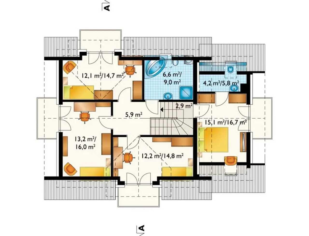- rzut dachu - ukazuje jego kształt, wymiary, kąt nachylenia połaci, rozmieszczenie okien połaciowych, lukarn, świetlików i rur spustowych, pokazuje rozmieszczenie kominów i informuje o sposobie odwodnienia: rozmieszczeniu i rozmiarach rynien