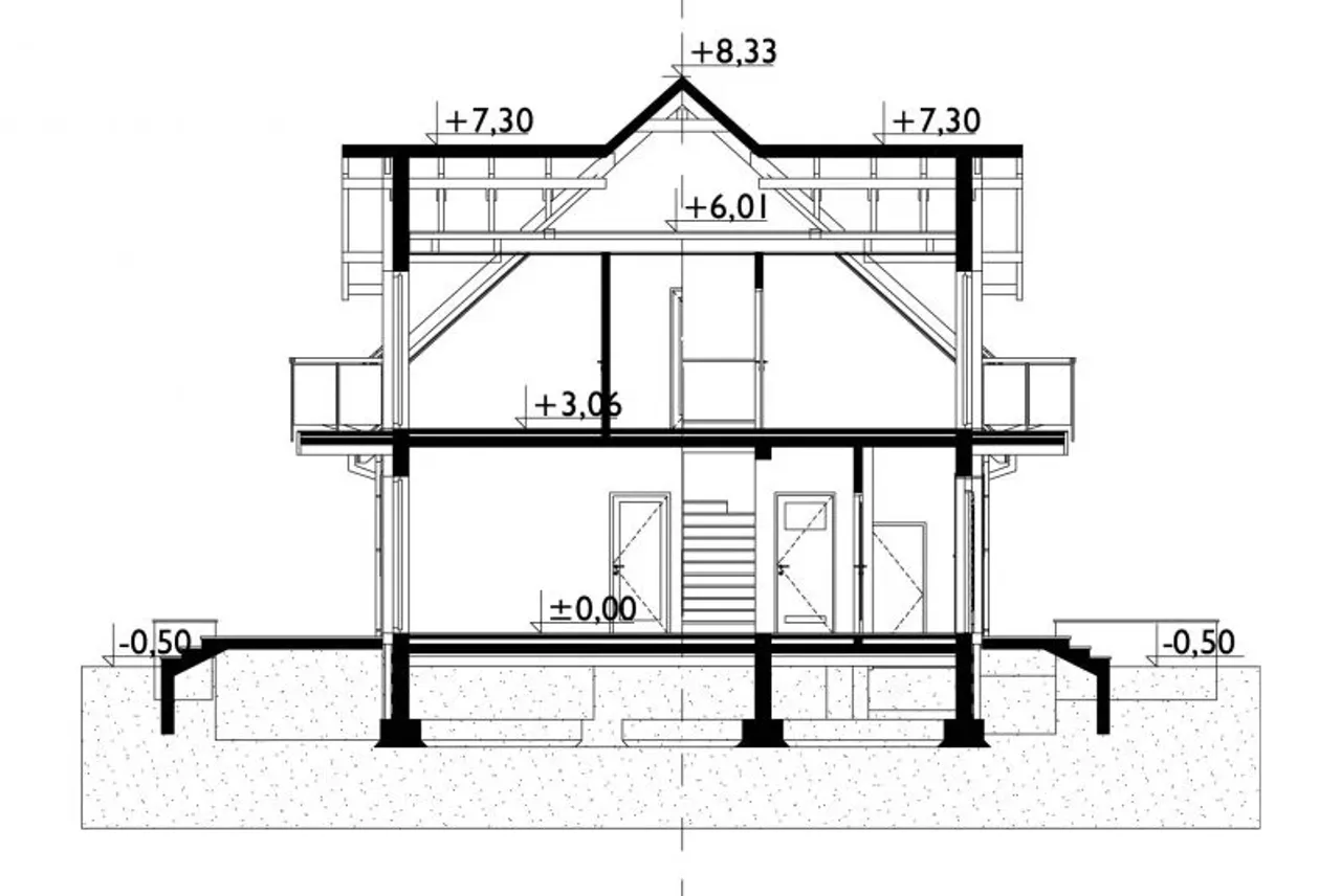 - przekroje - pokazują wszystkie elementy budynku po przecięciu go wzdłuż lub w poprzek od dachu do fundamentów tj. warstwy podłogi, stropów i dachu