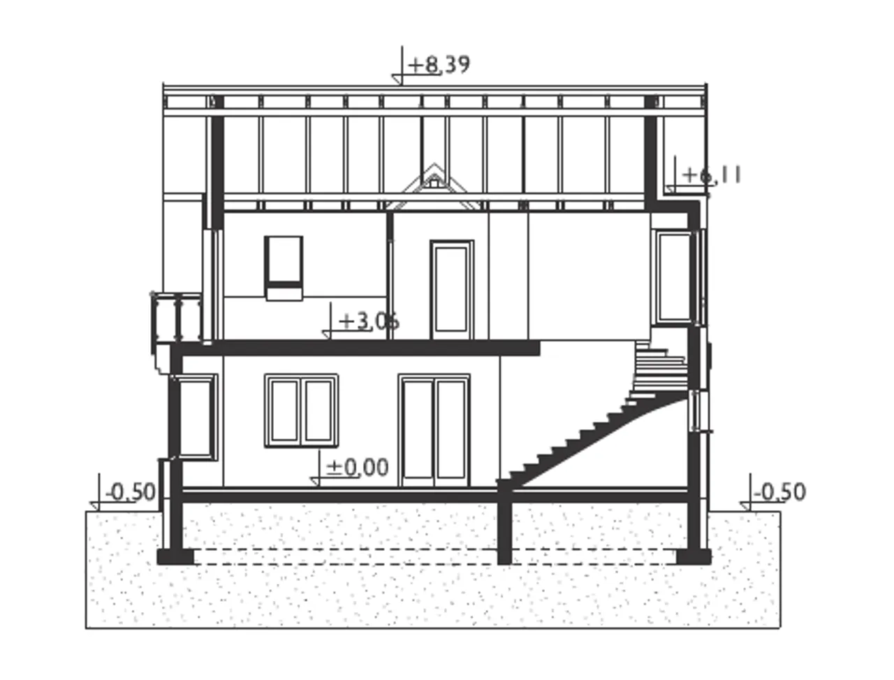 - przekroje - pokazują wszystkie elementy budynku po przecięciu go wzdłuż lub w poprzek od dachu do fundamentów tj. warstwy podłogi, stropów i dachu