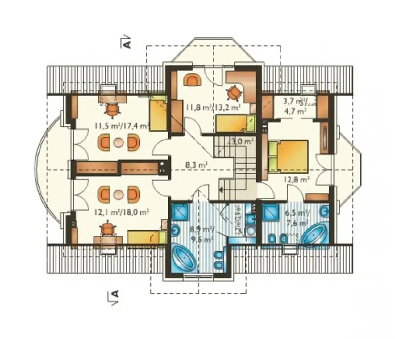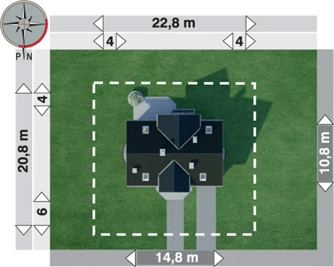 - rzut dachu - ukazuje jego kształt, wymiary, kąt nachylenia połaci, rozmieszczenie okien połaciowych, lukarn, świetlików i rur spustowych, pokazuje rozmieszczenie kominów i informuje o sposobie odwodnienia: rozmieszczeniu i rozmiarach rynien