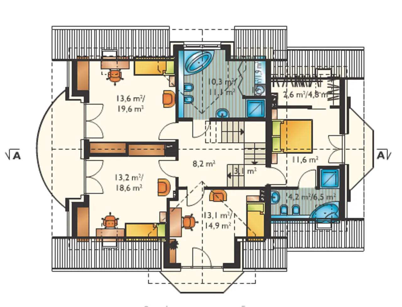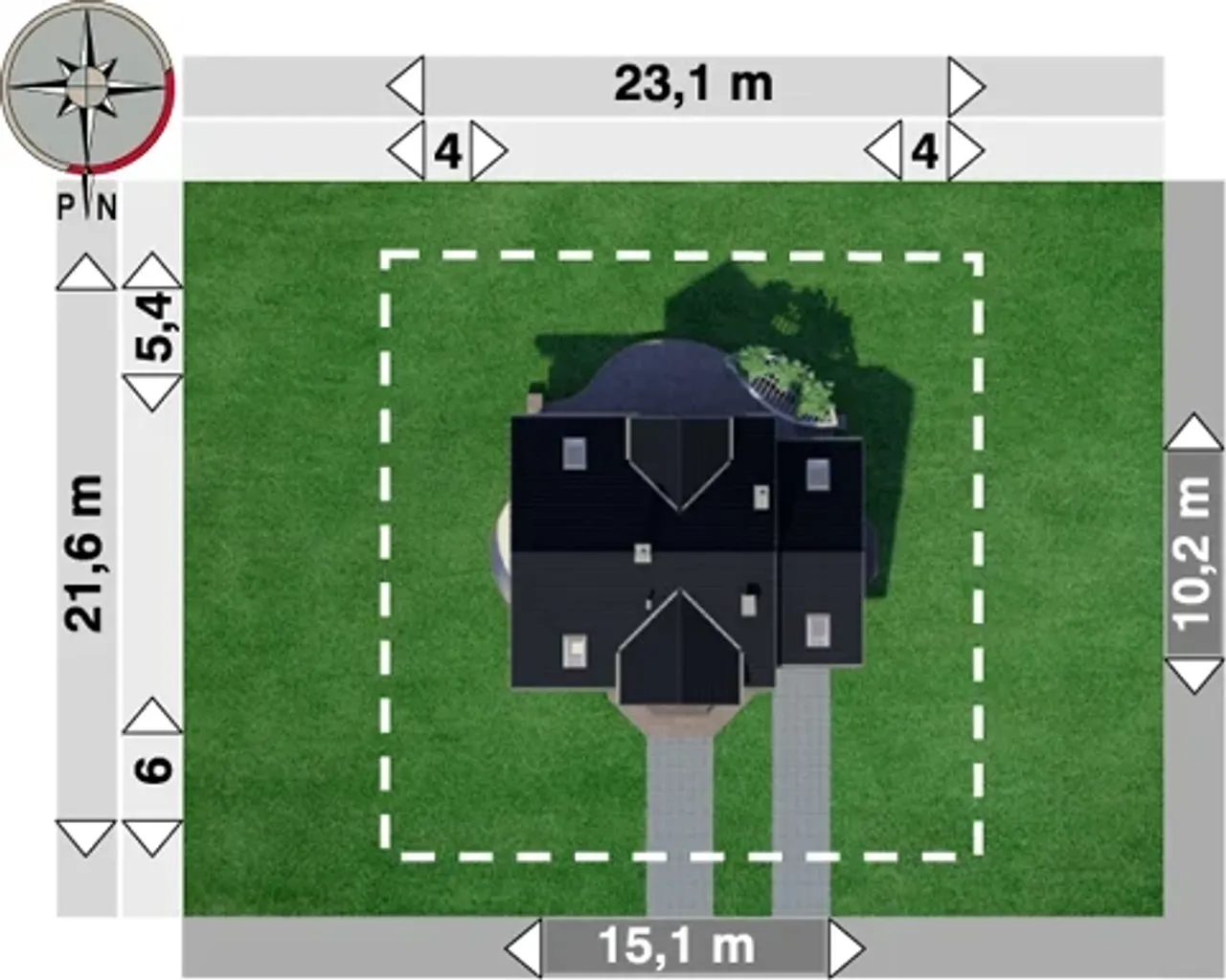 - rzut dachu - ukazuje jego kształt, wymiary, kąt nachylenia połaci, rozmieszczenie okien połaciowych, lukarn, świetlików i rur spustowych, pokazuje rozmieszczenie kominów i informuje o sposobie odwodnienia: rozmieszczeniu i rozmiarach rynien