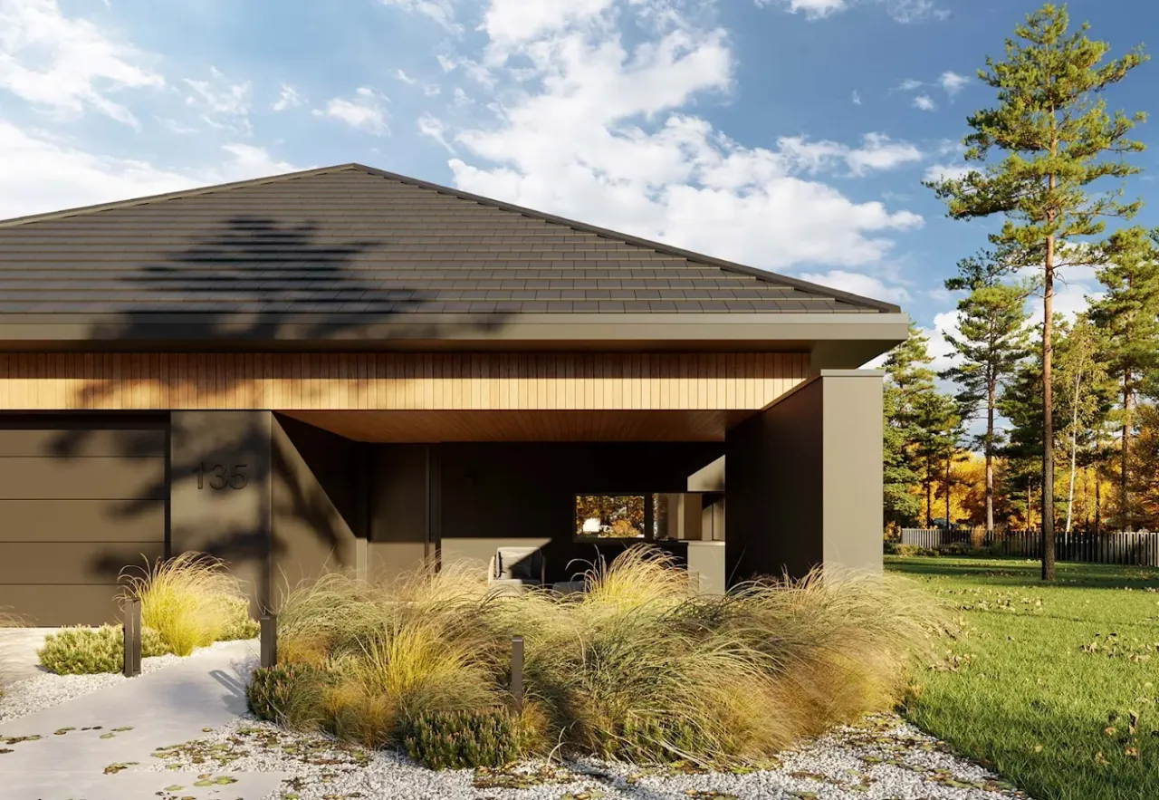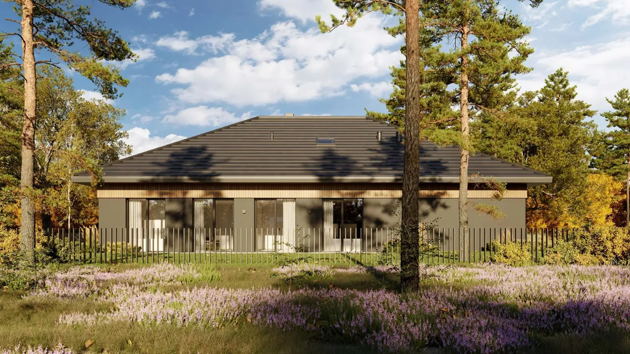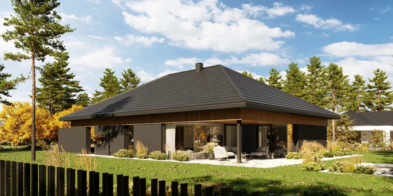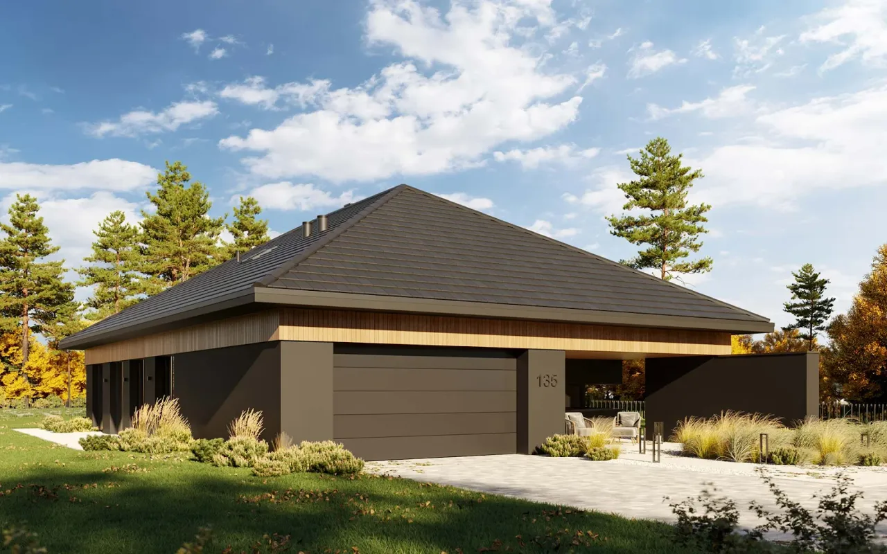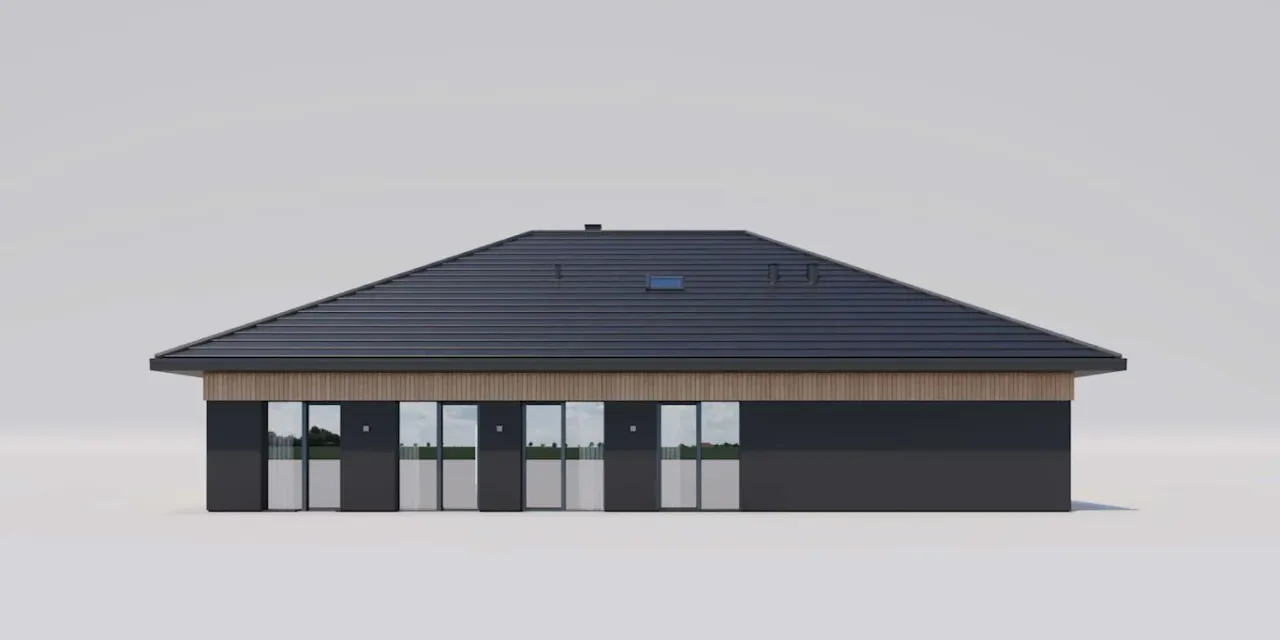 - Elewacja: tynk silikonowy połączony z deskami elewacyjnymi.