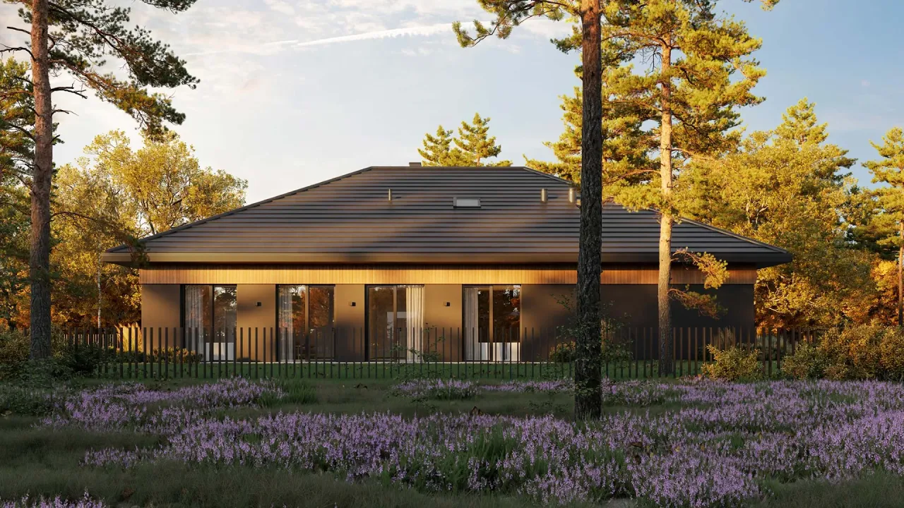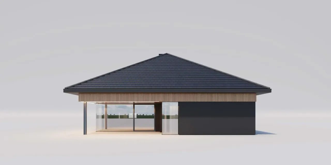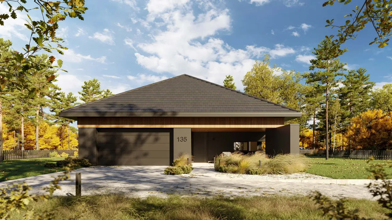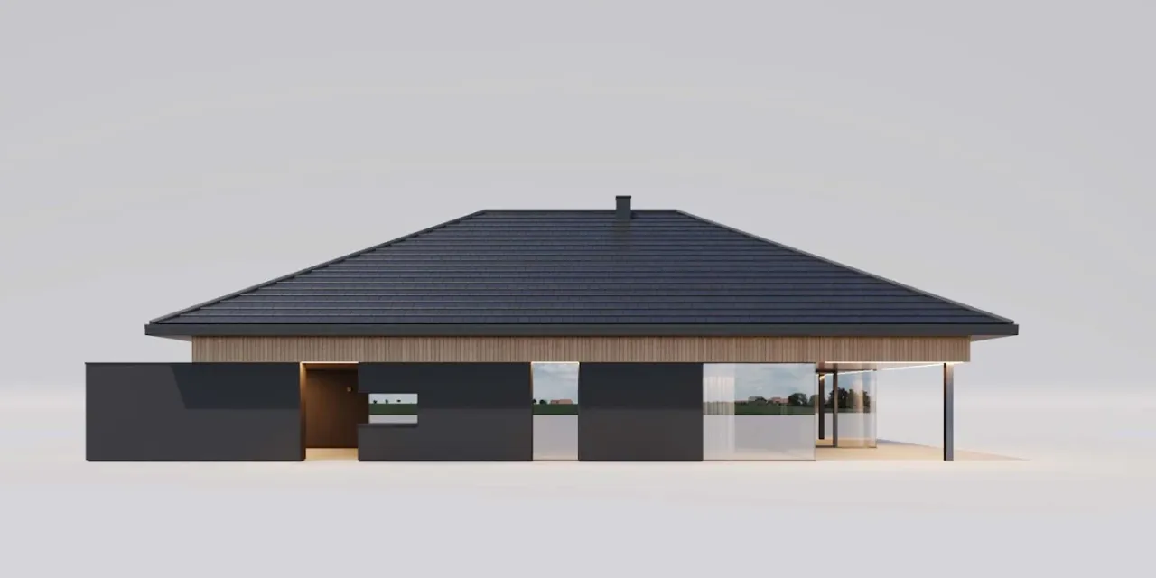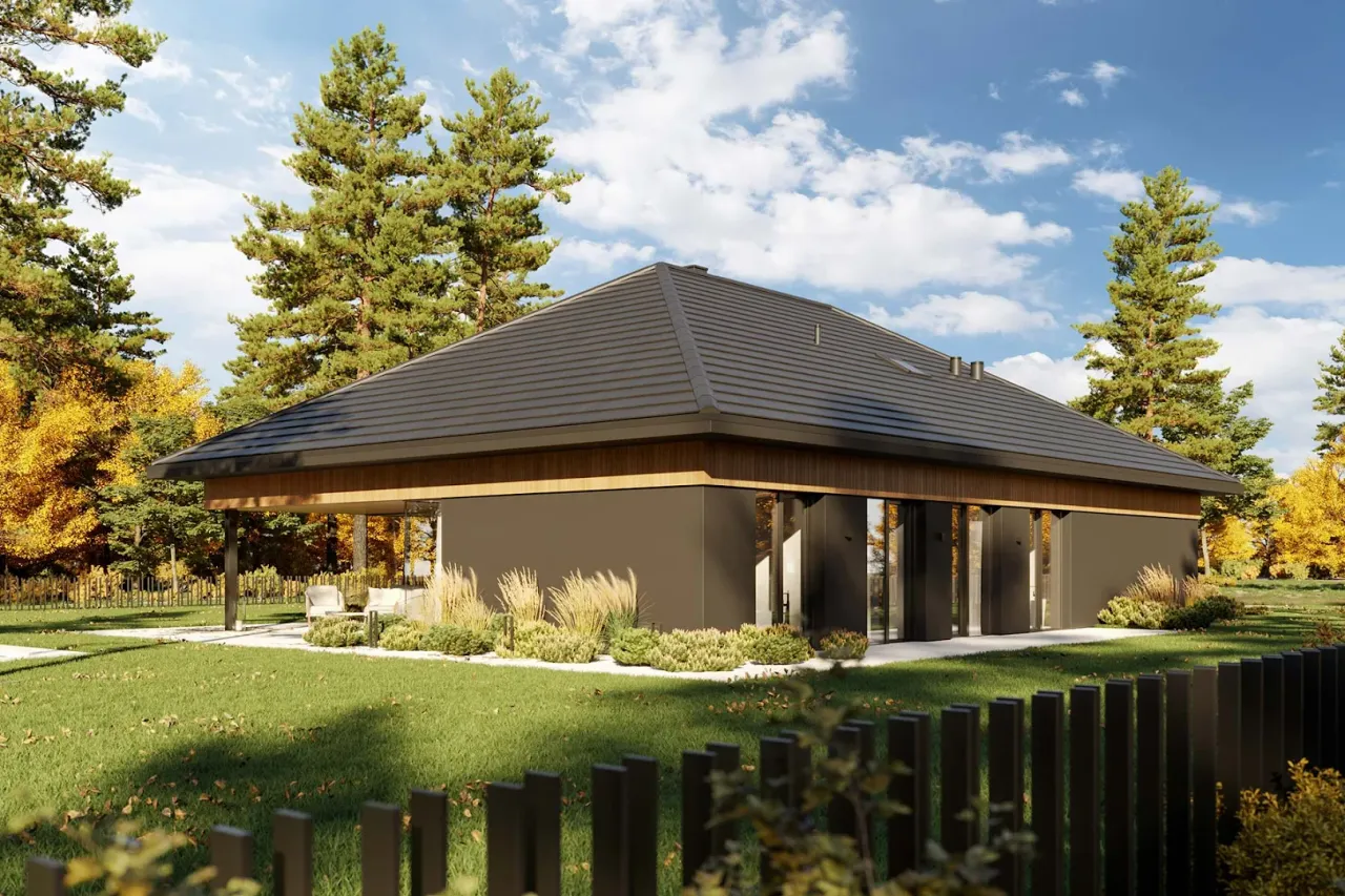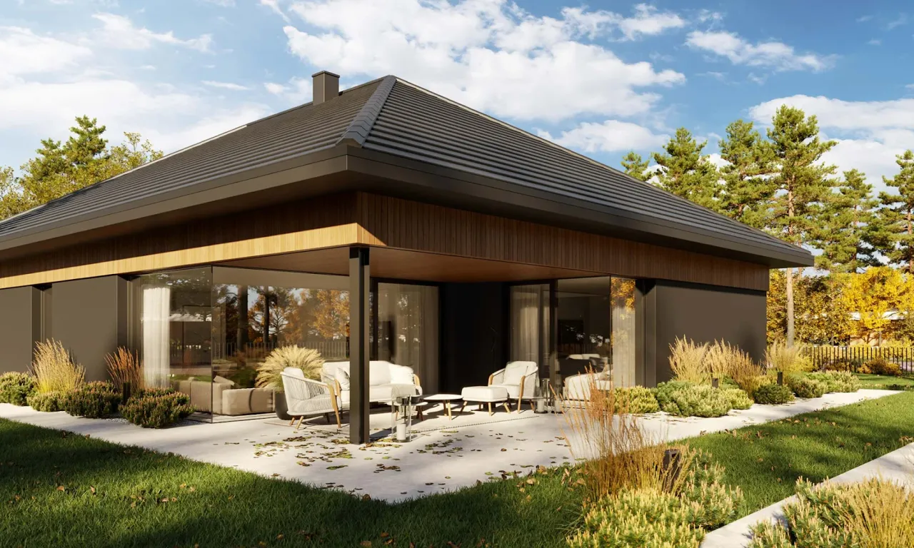 - Elewacja: tynk silikonowy połączony z deskami elewacyjnymi.