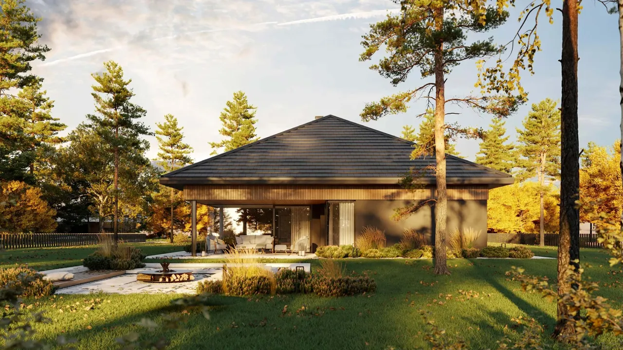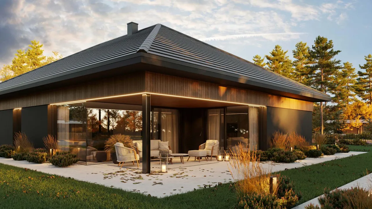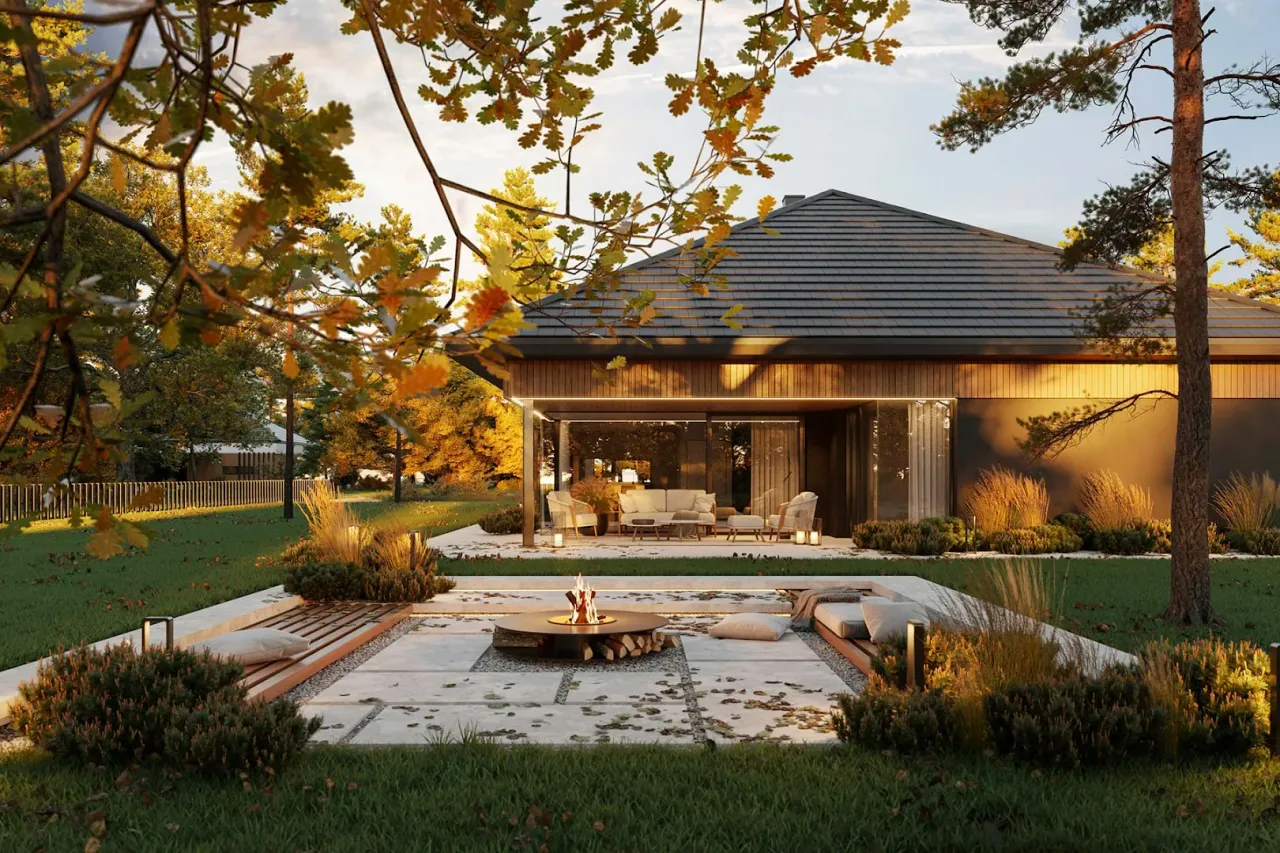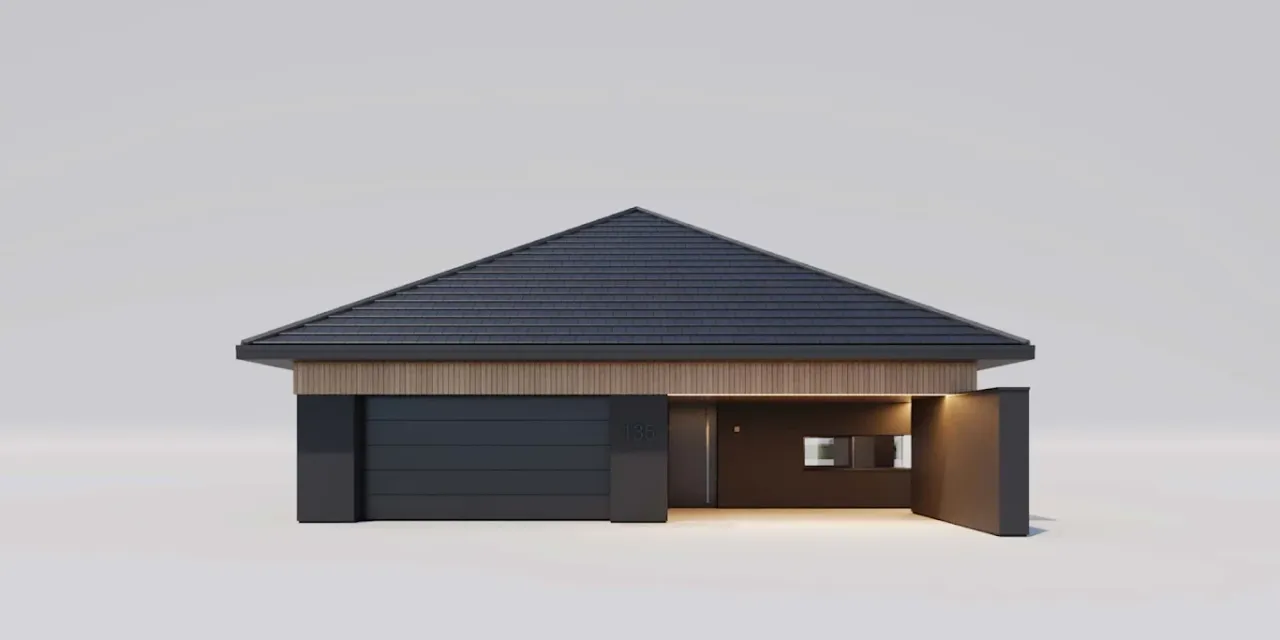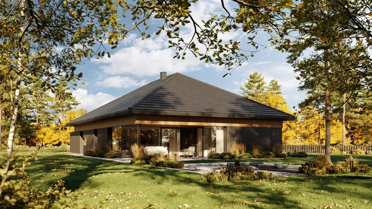 - Elewacja: tynk silikonowy połączony z deskami elewacyjnymi.