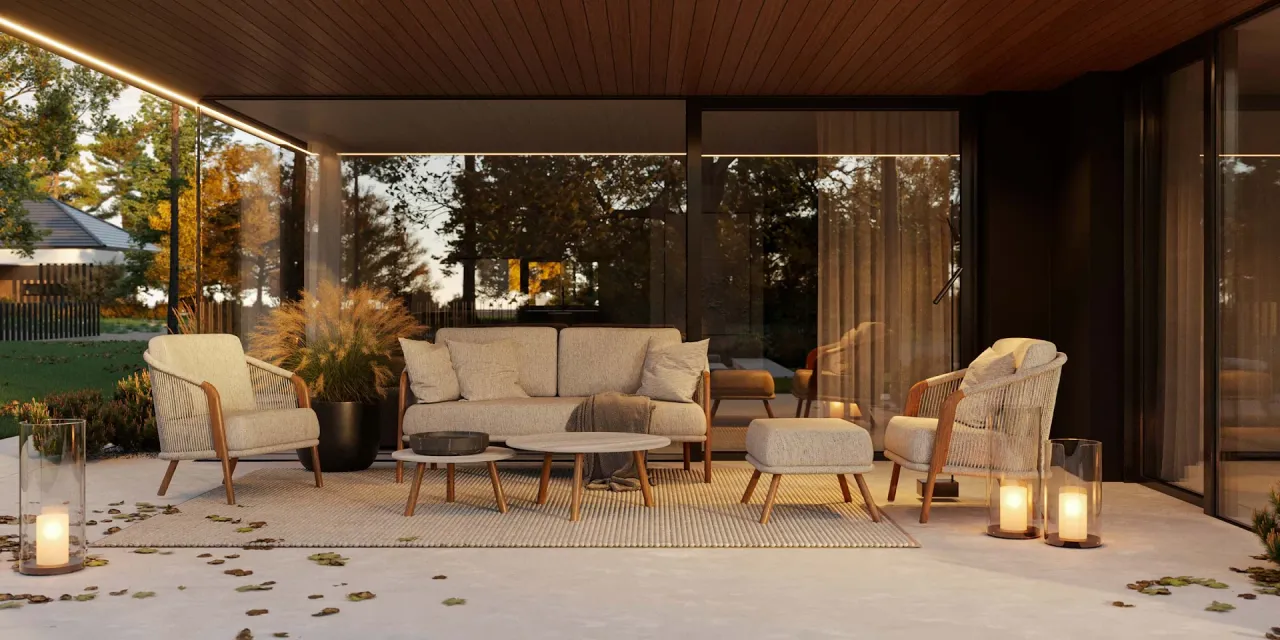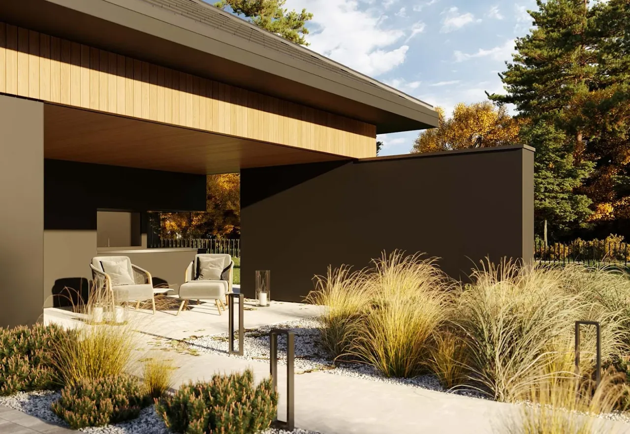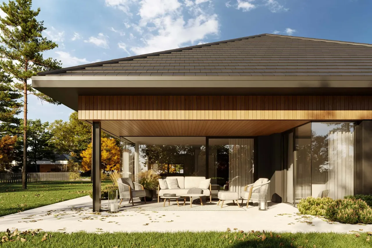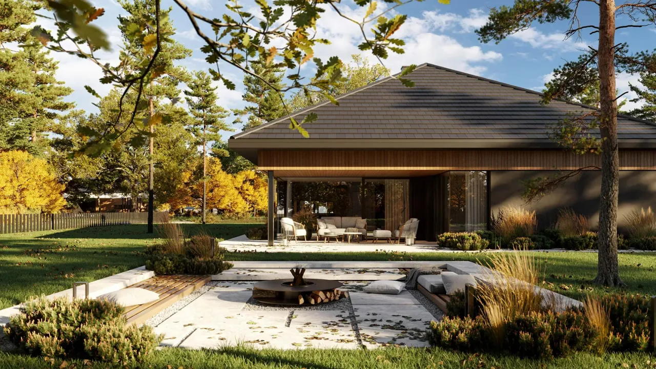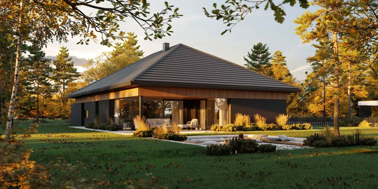 - Elewacja: tynk silikonowy połączony z deskami elewacyjnymi.