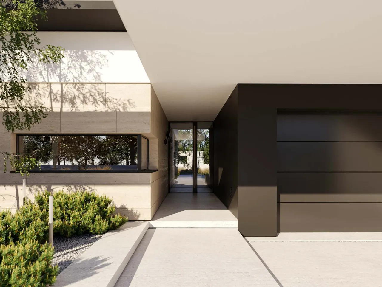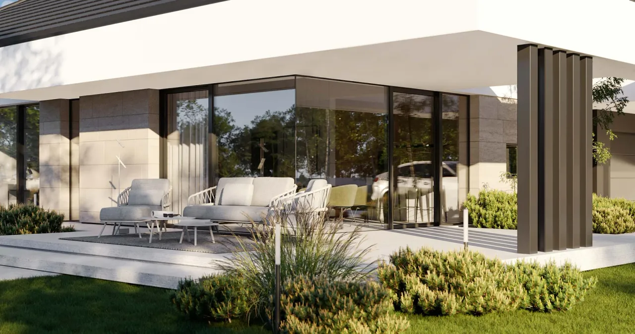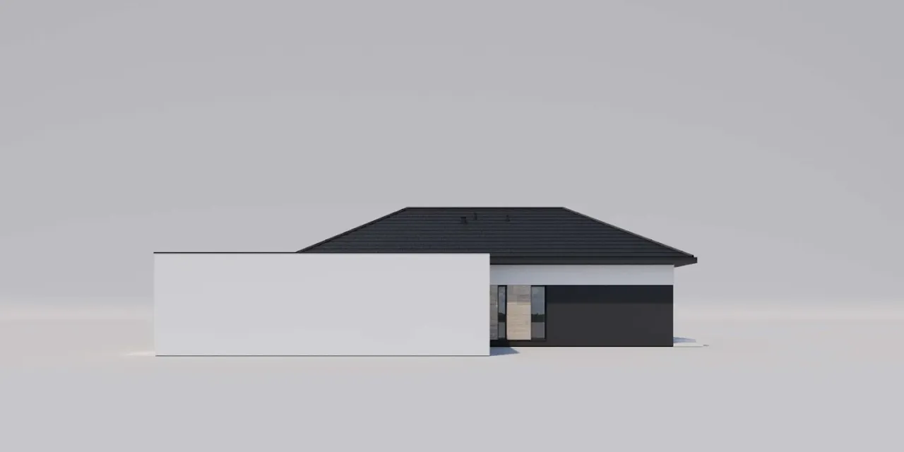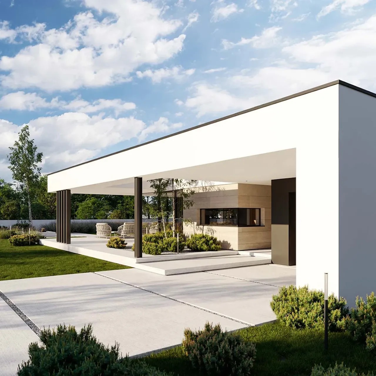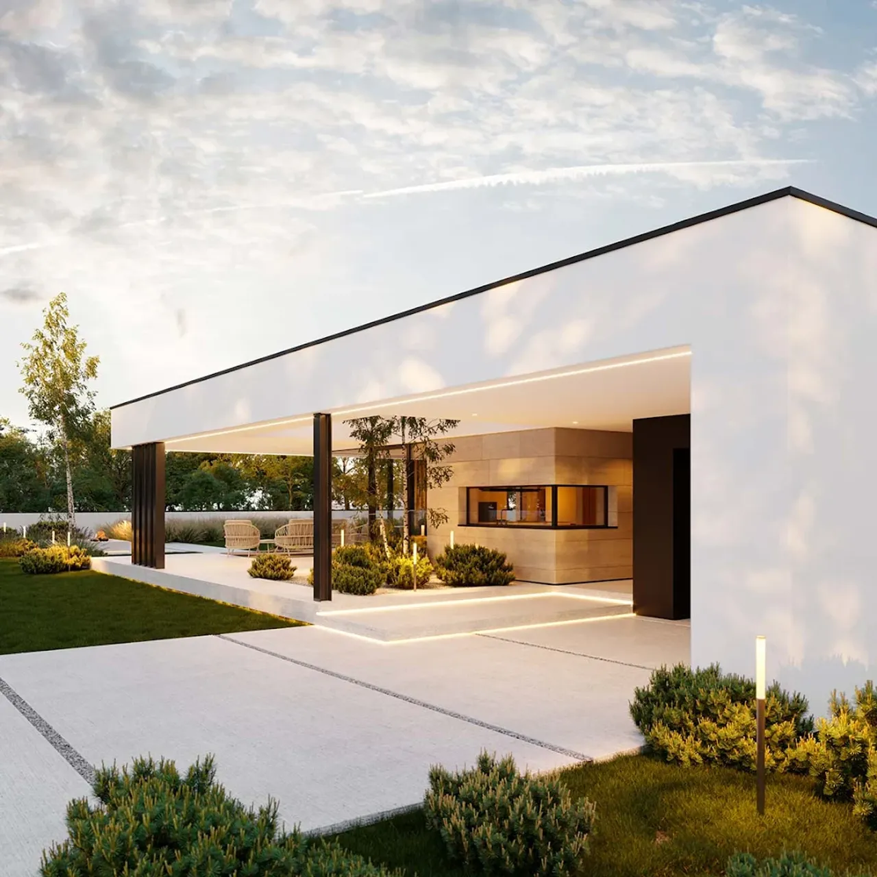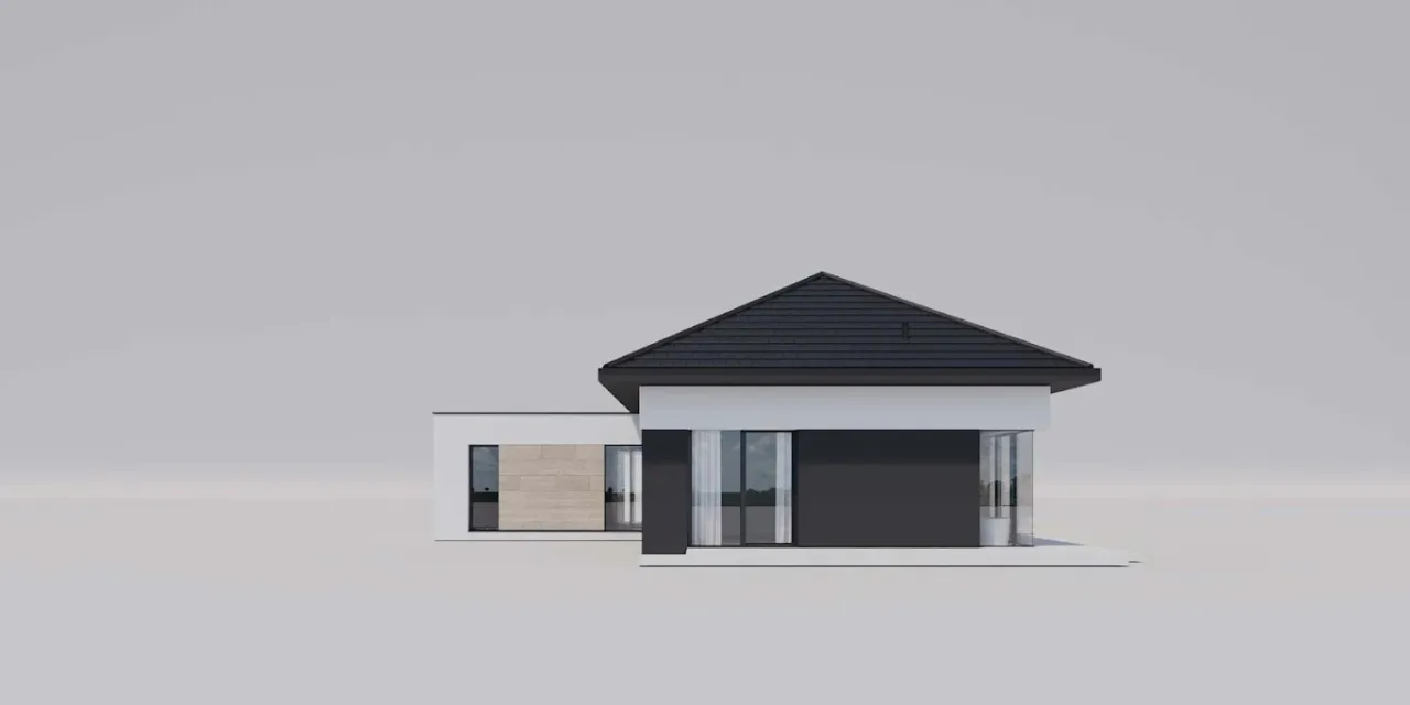 - Elewacja: tynk silikonowy połączony z płytką trawertynową.