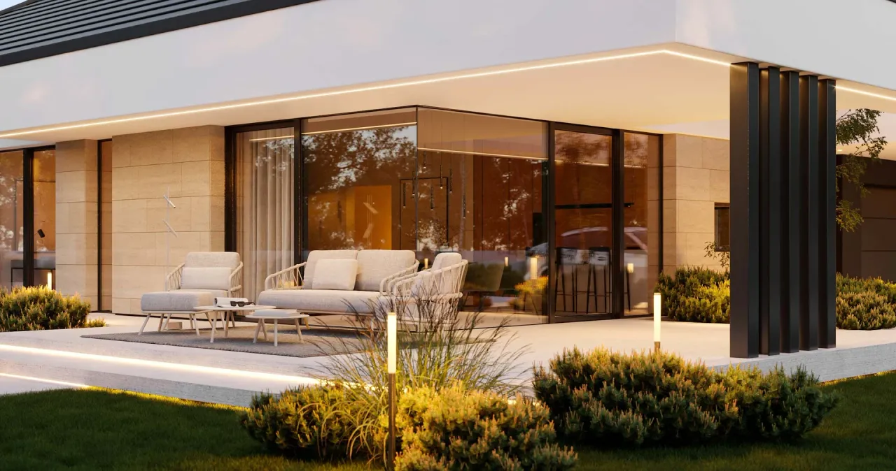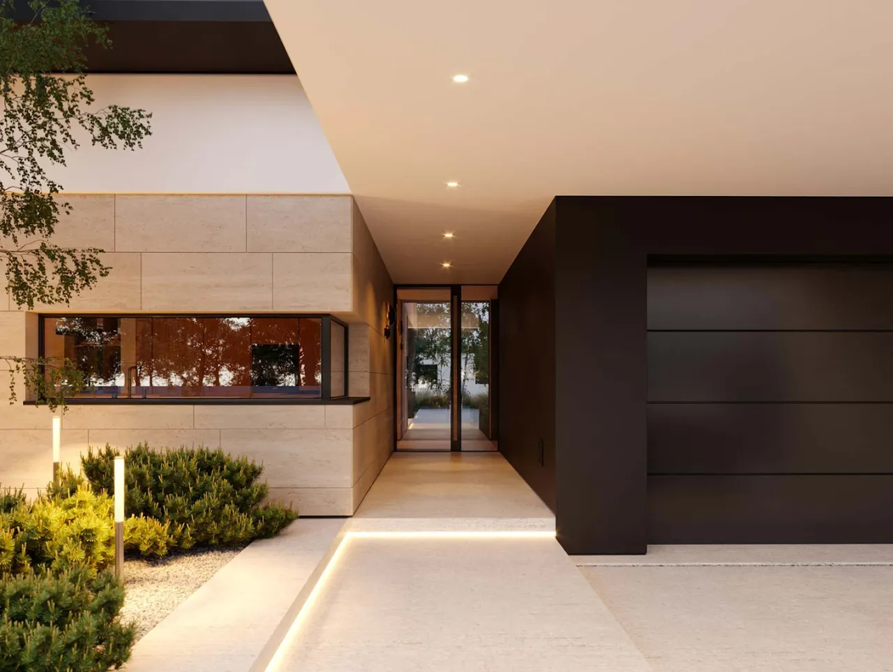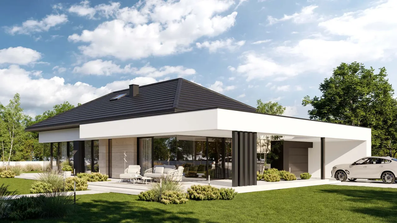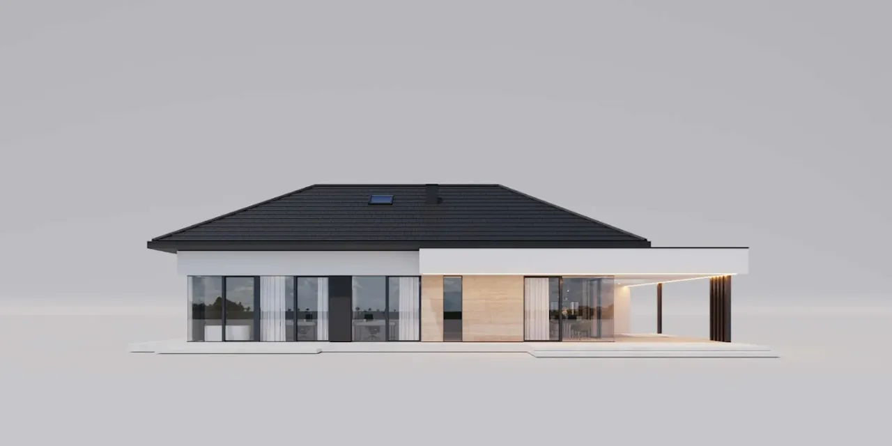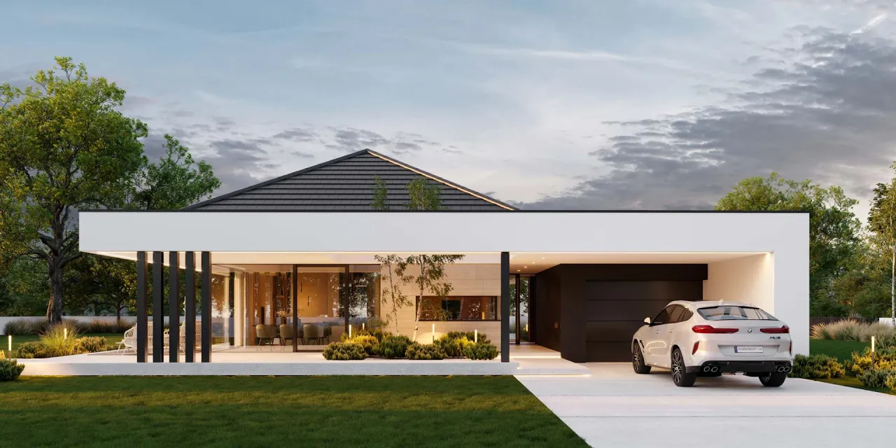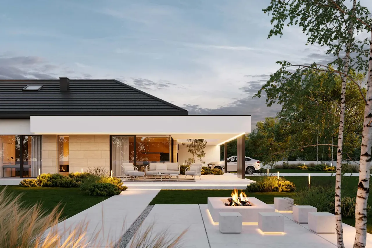 - Elewacja: tynk silikonowy połączony z płytką trawertynową.