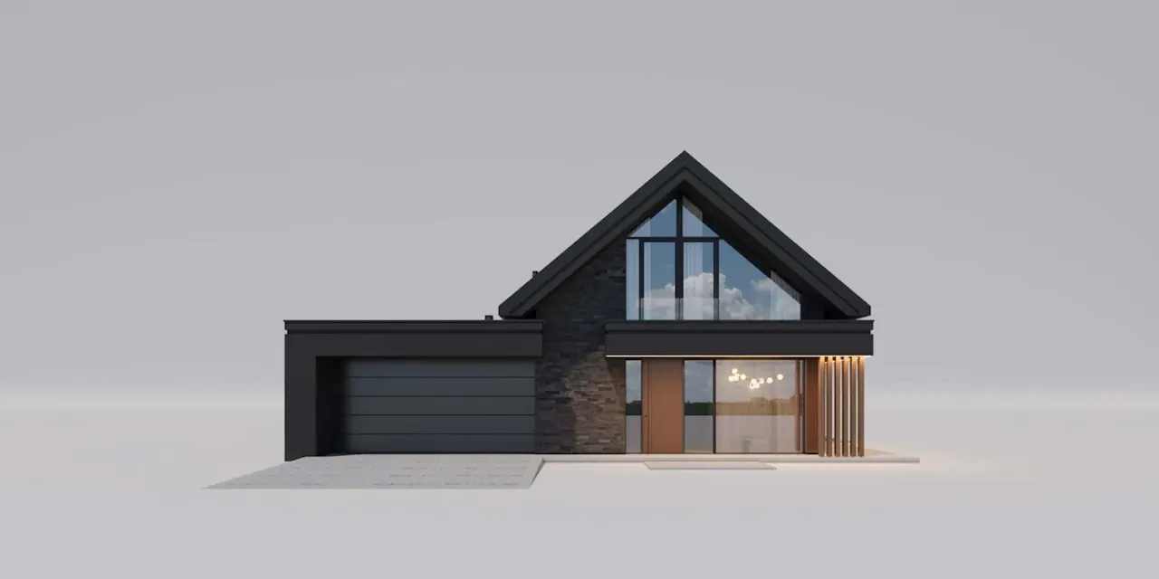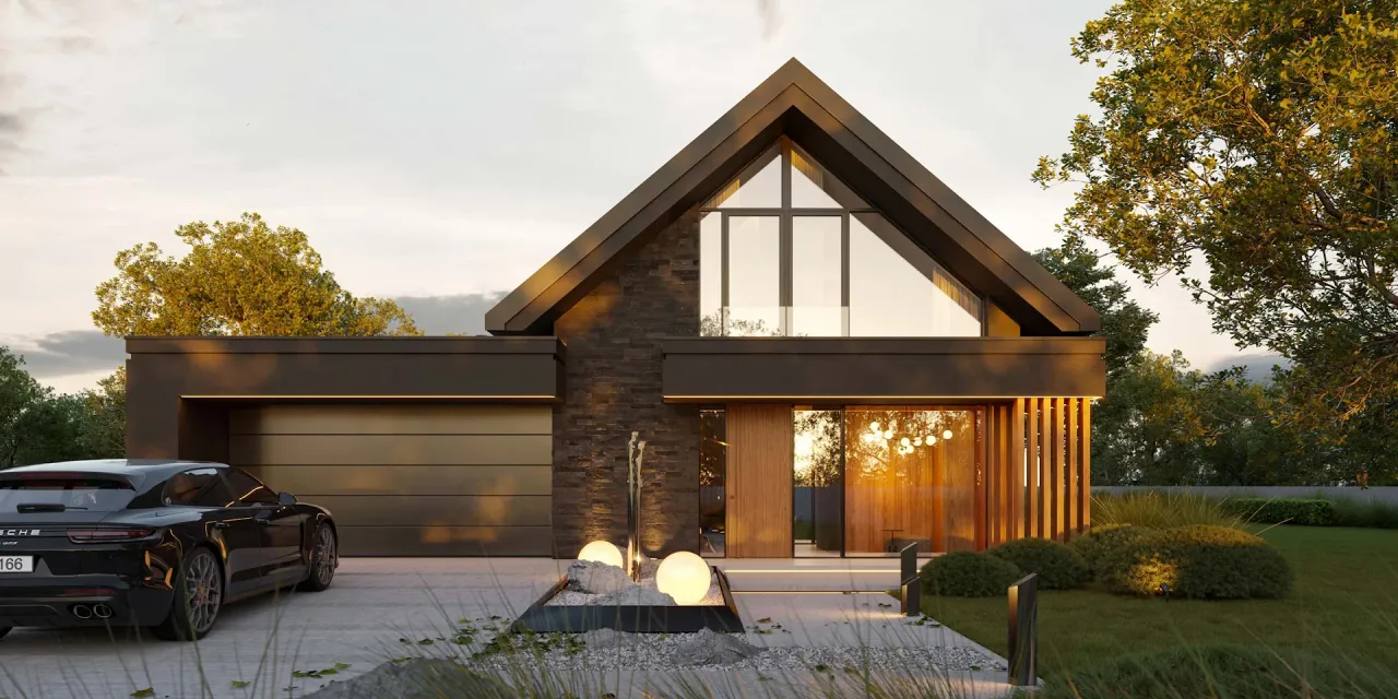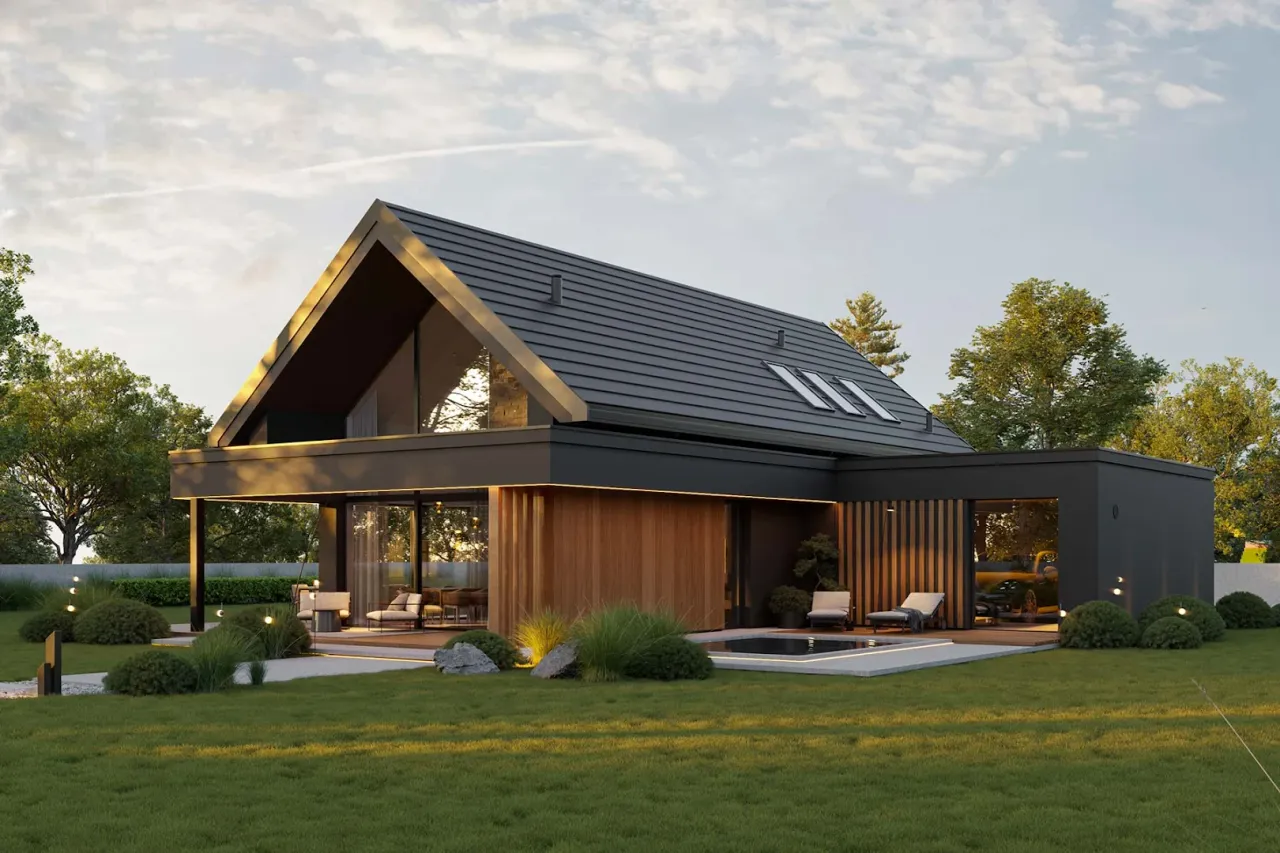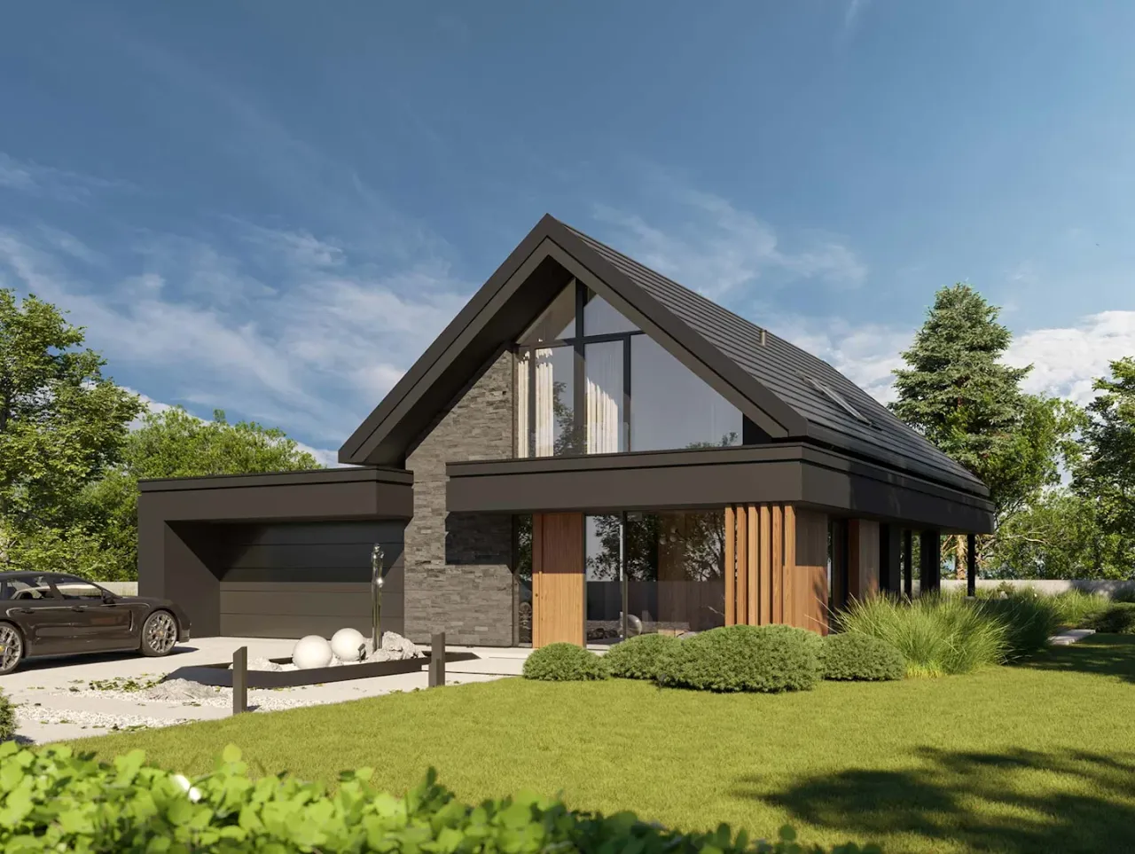 - Elewacja: tynk silikonowy w połączeniu z deską elewacyjną lamelową oraz kamieniem elewacyjnym.
