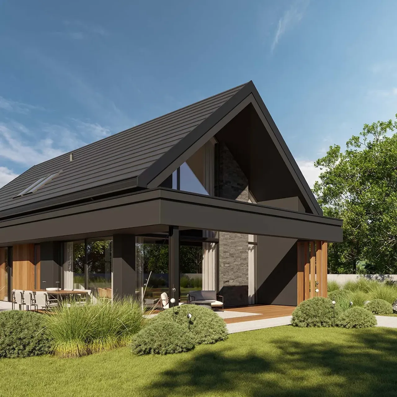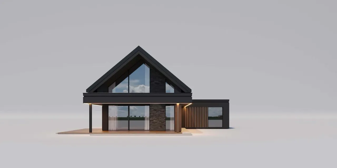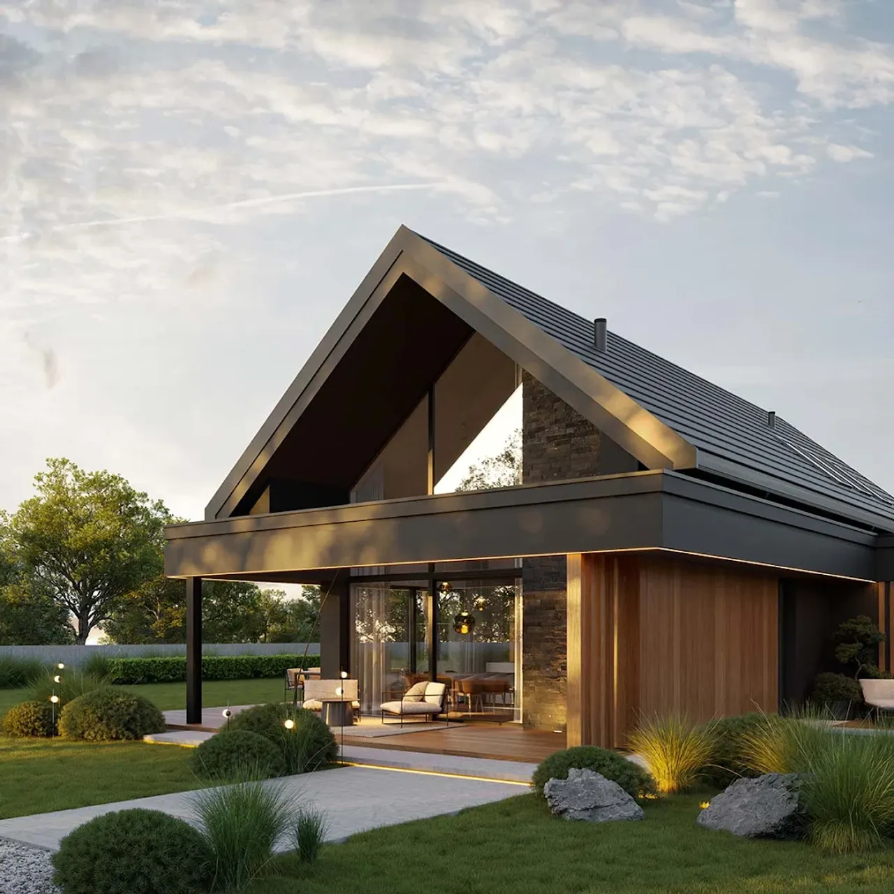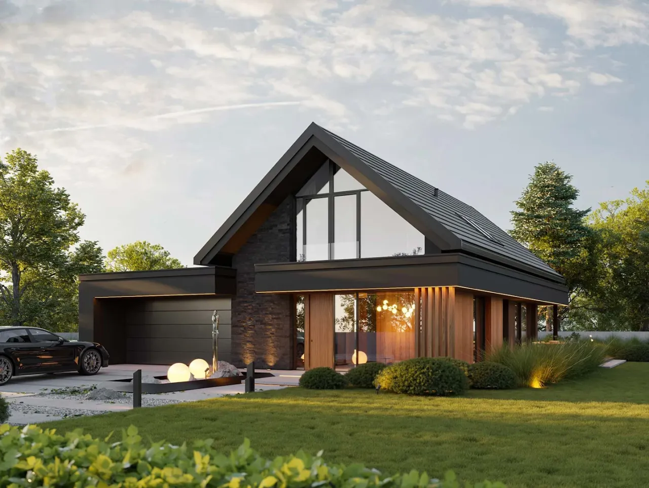 - Elewacja: tynk silikonowy w połączeniu z deską elewacyjną lamelową oraz kamieniem elewacyjnym.