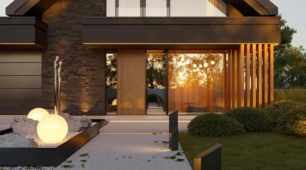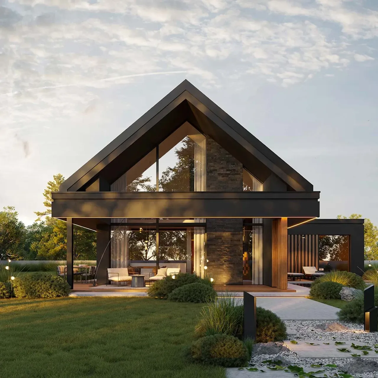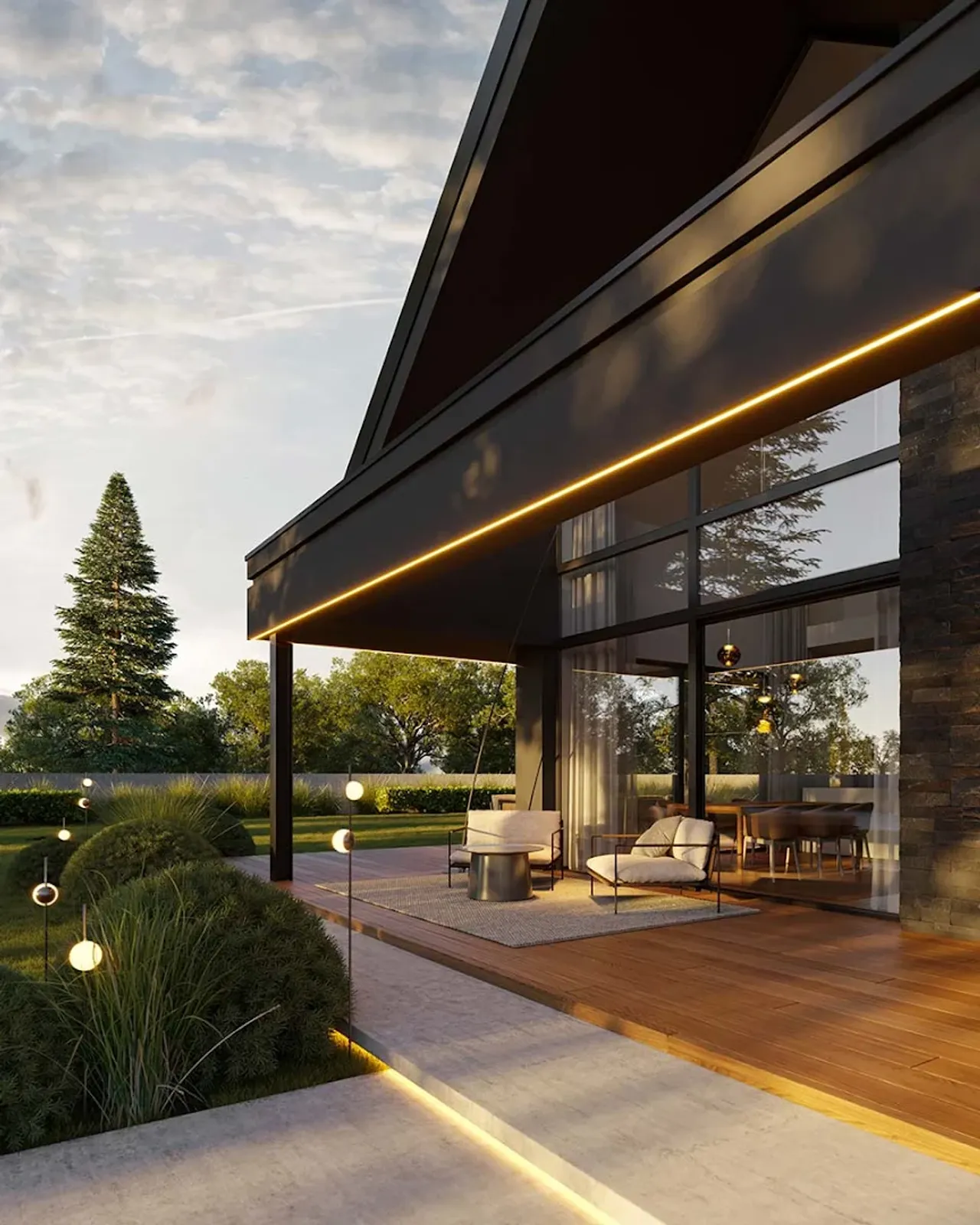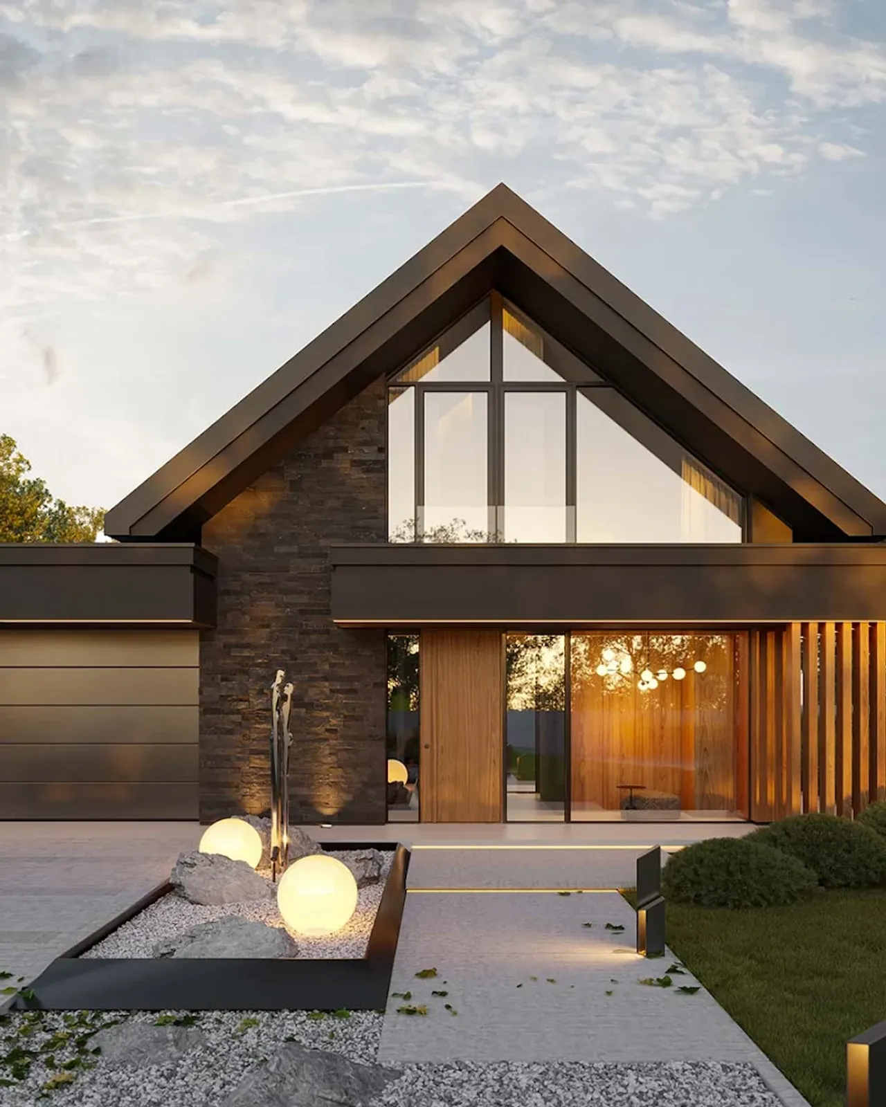 - Elewacja: tynk silikonowy w połączeniu z deską elewacyjną lamelową oraz kamieniem elewacyjnym.