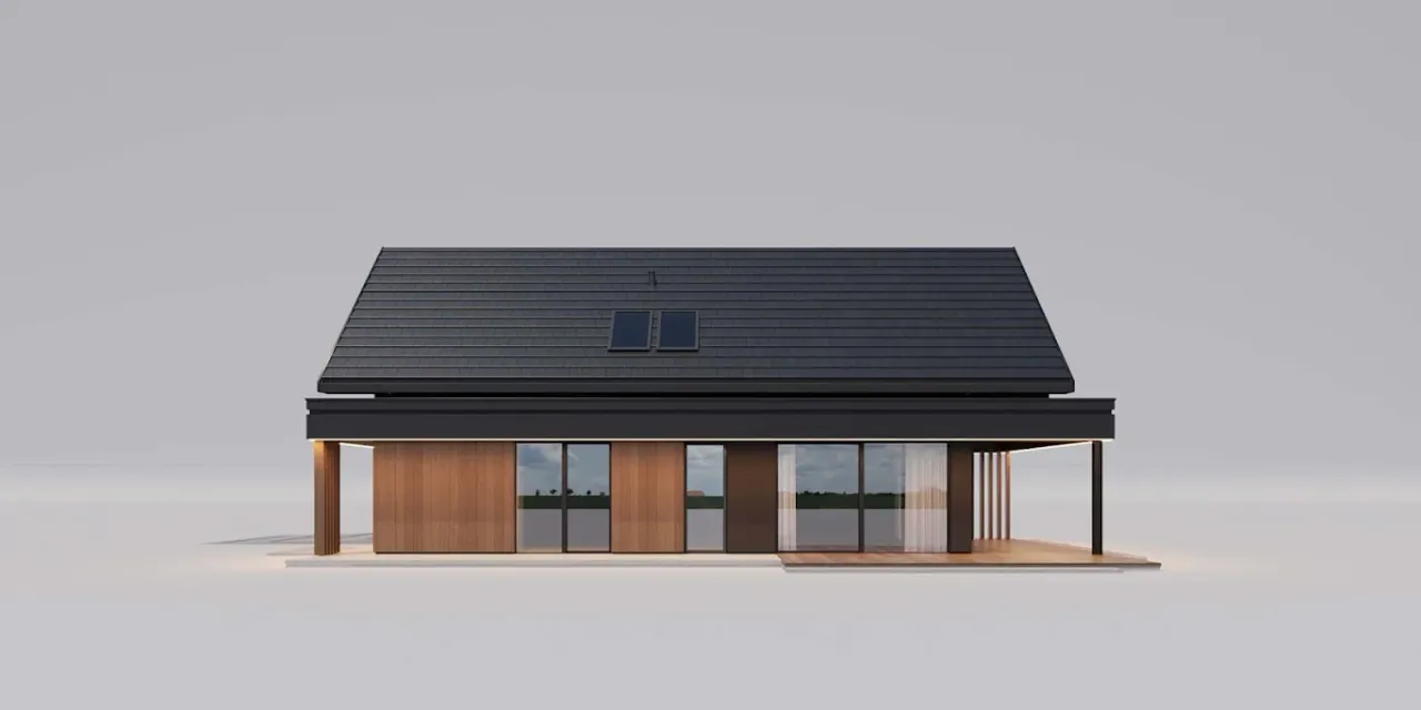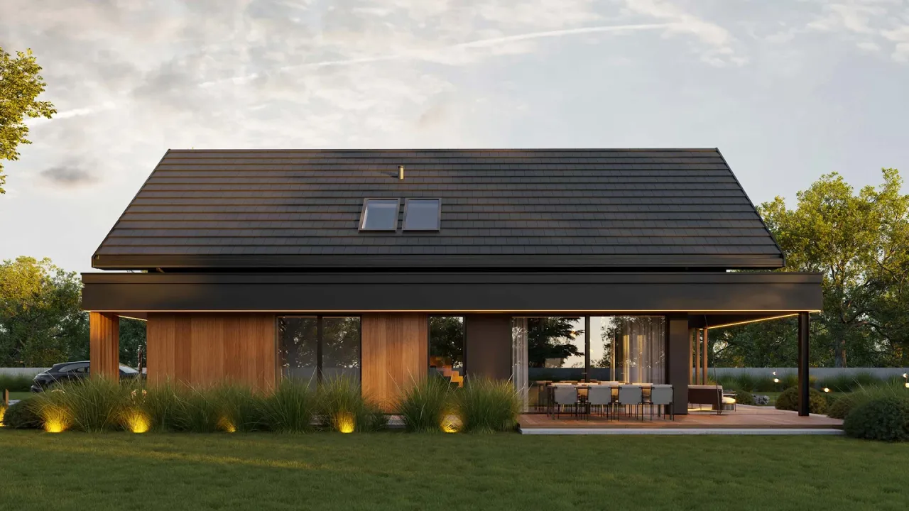 - Dach: dwuspadowy kryty dachówką ceramiczną lub cementową swissporTON, stropodach pełny kryty membraną EPDM, okna dachowe FAKRO.