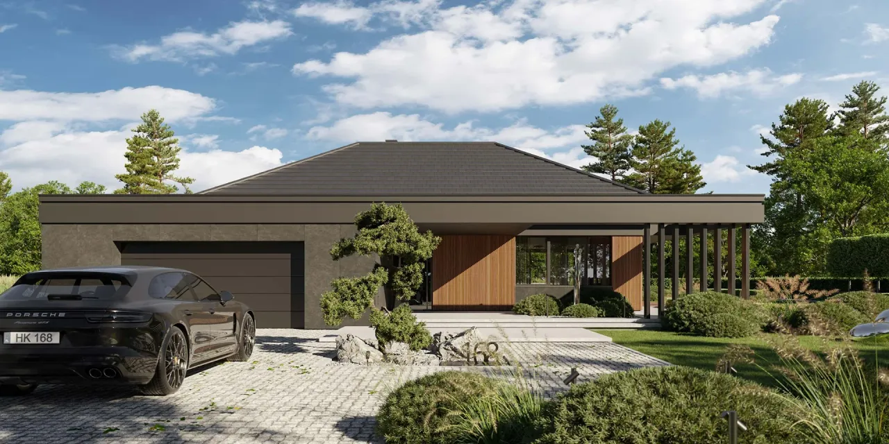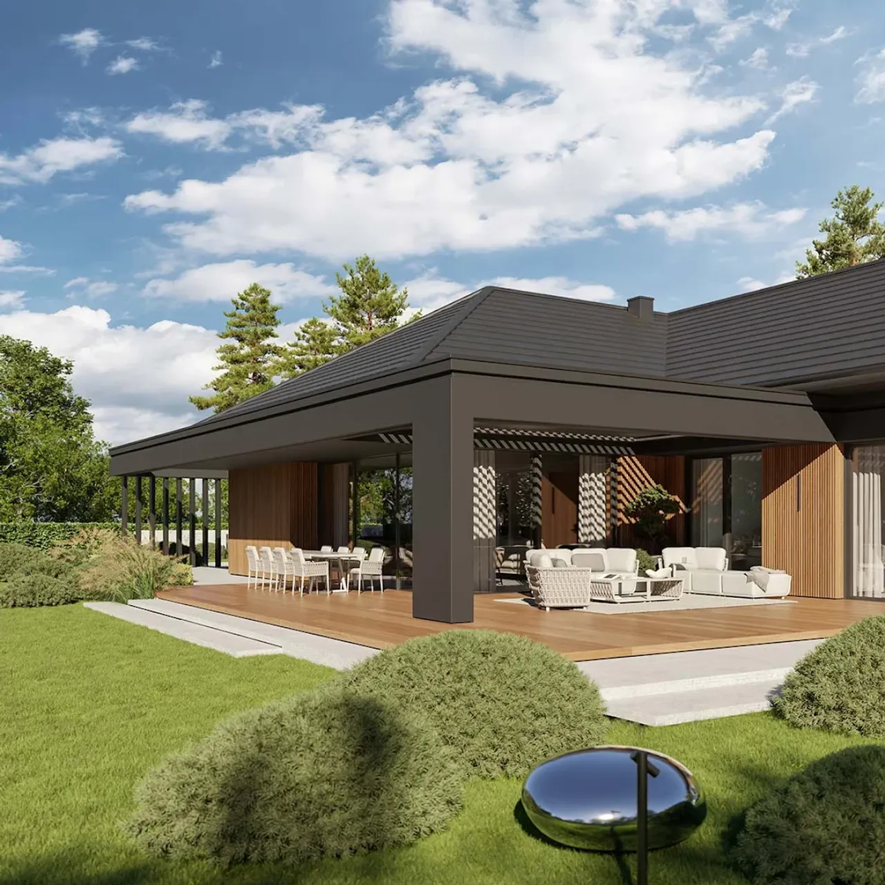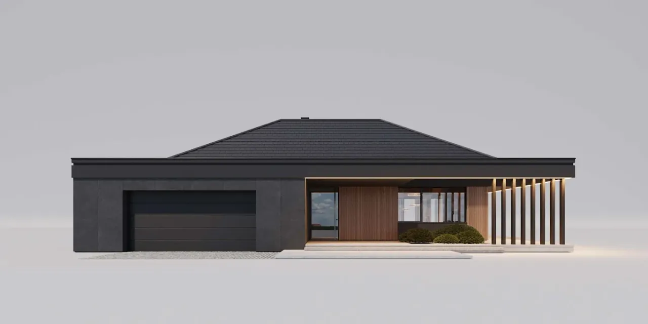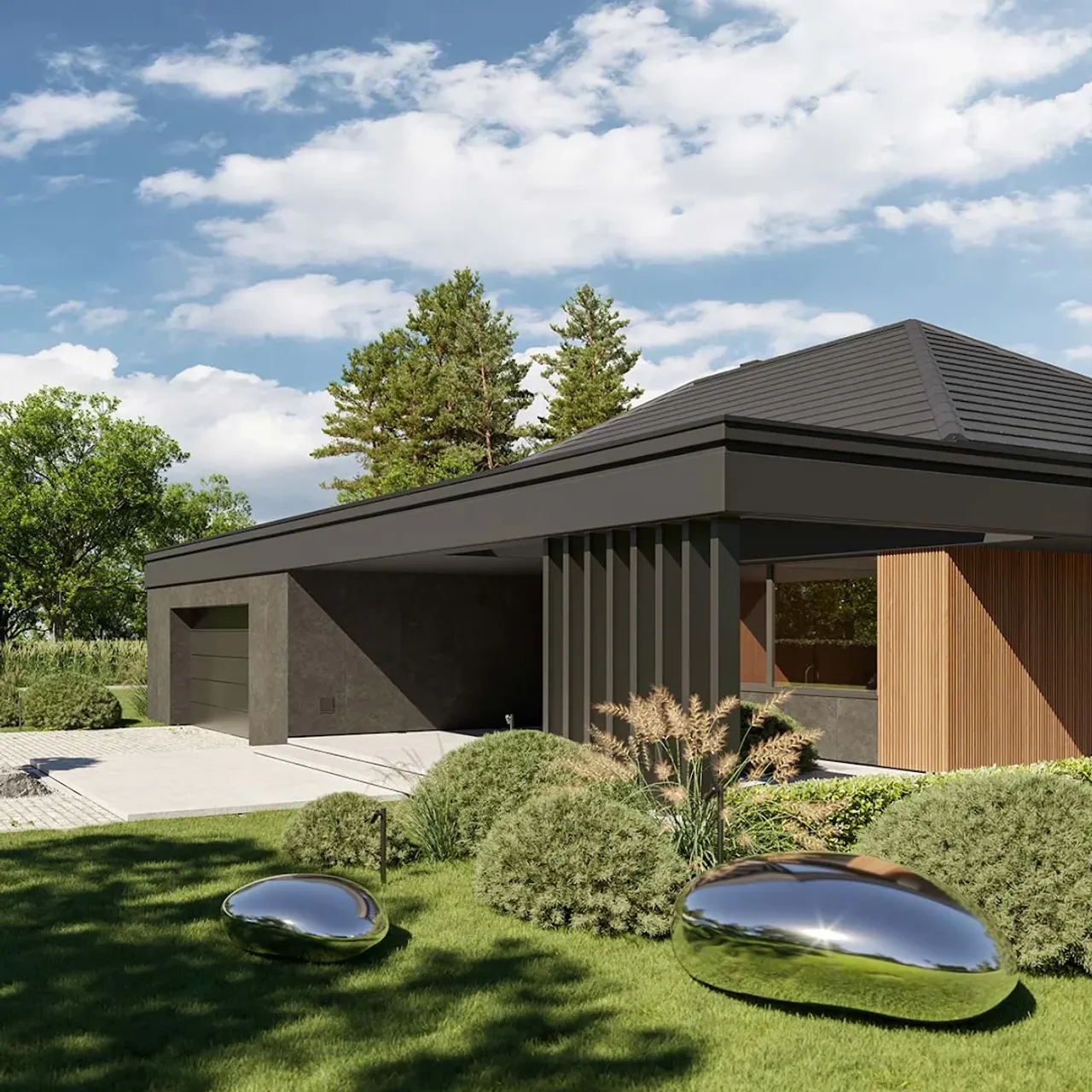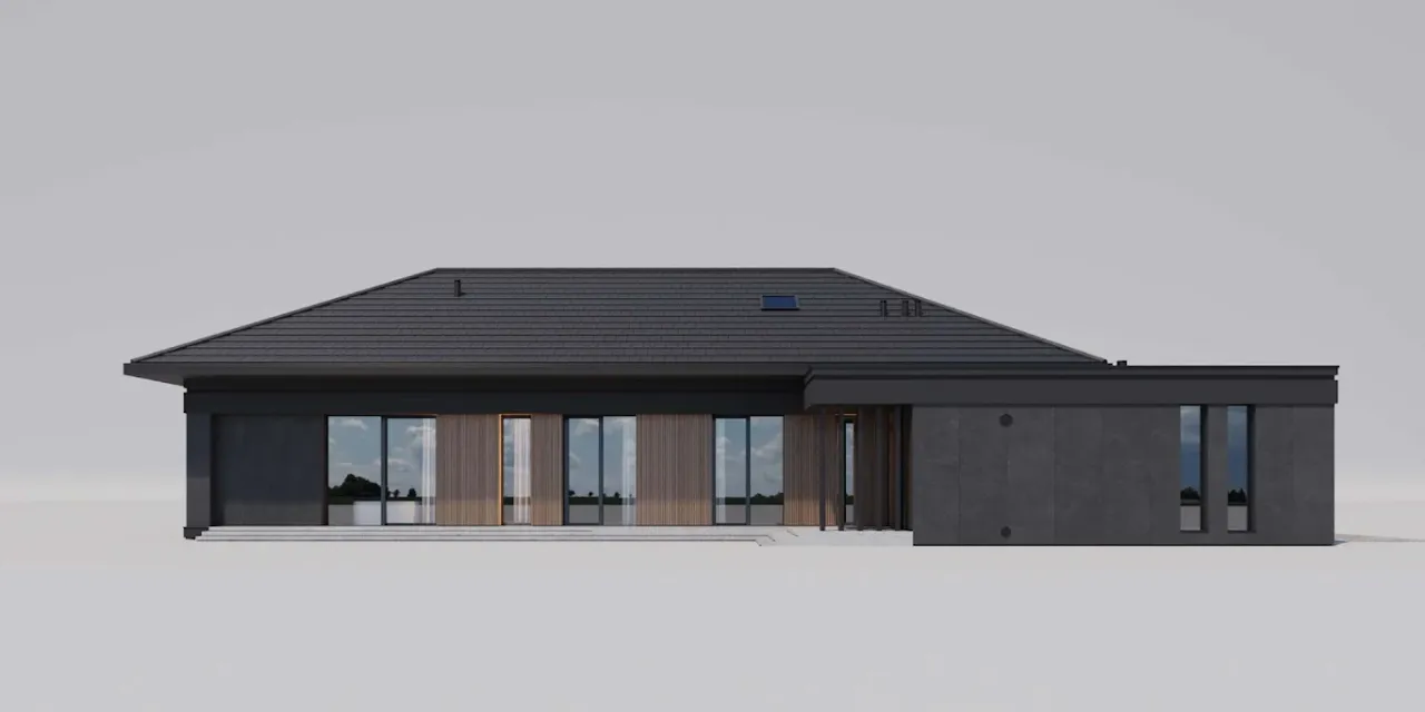 - Elewacja: tynk silikonowy połączony z deskami elewacyjnymi lamelowymi oraz spiekiem kwarcowym.