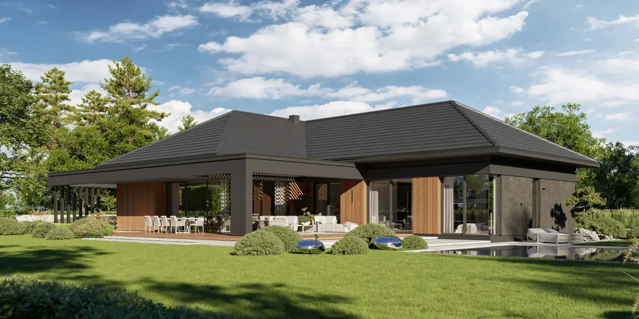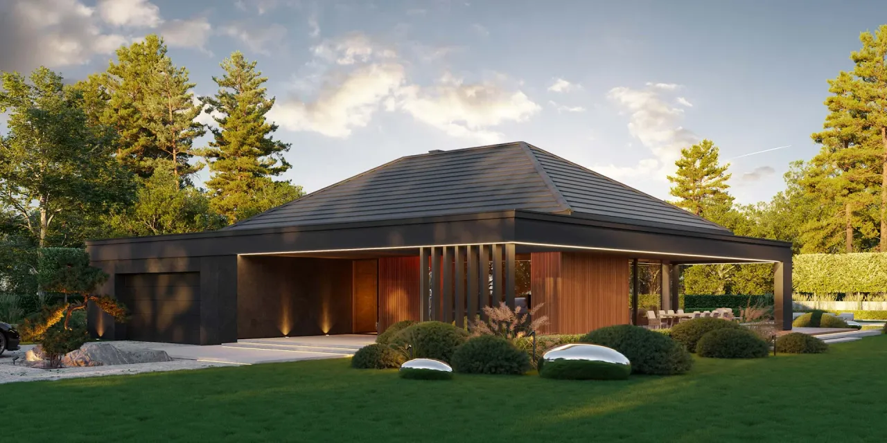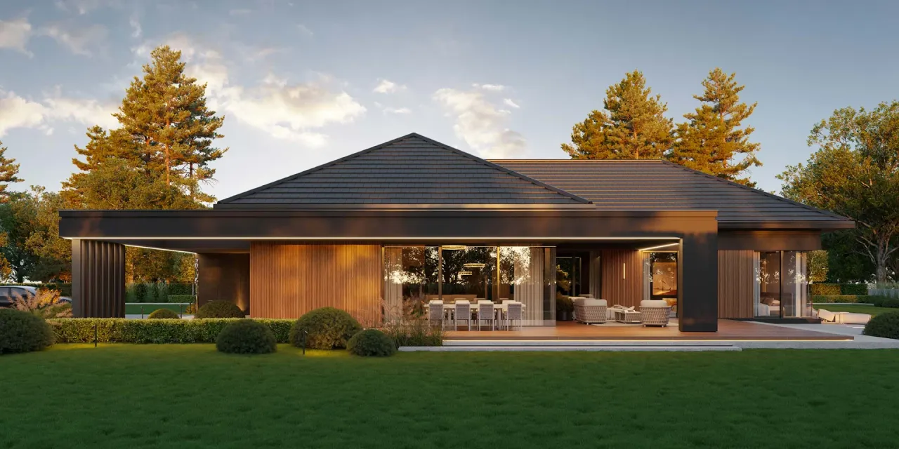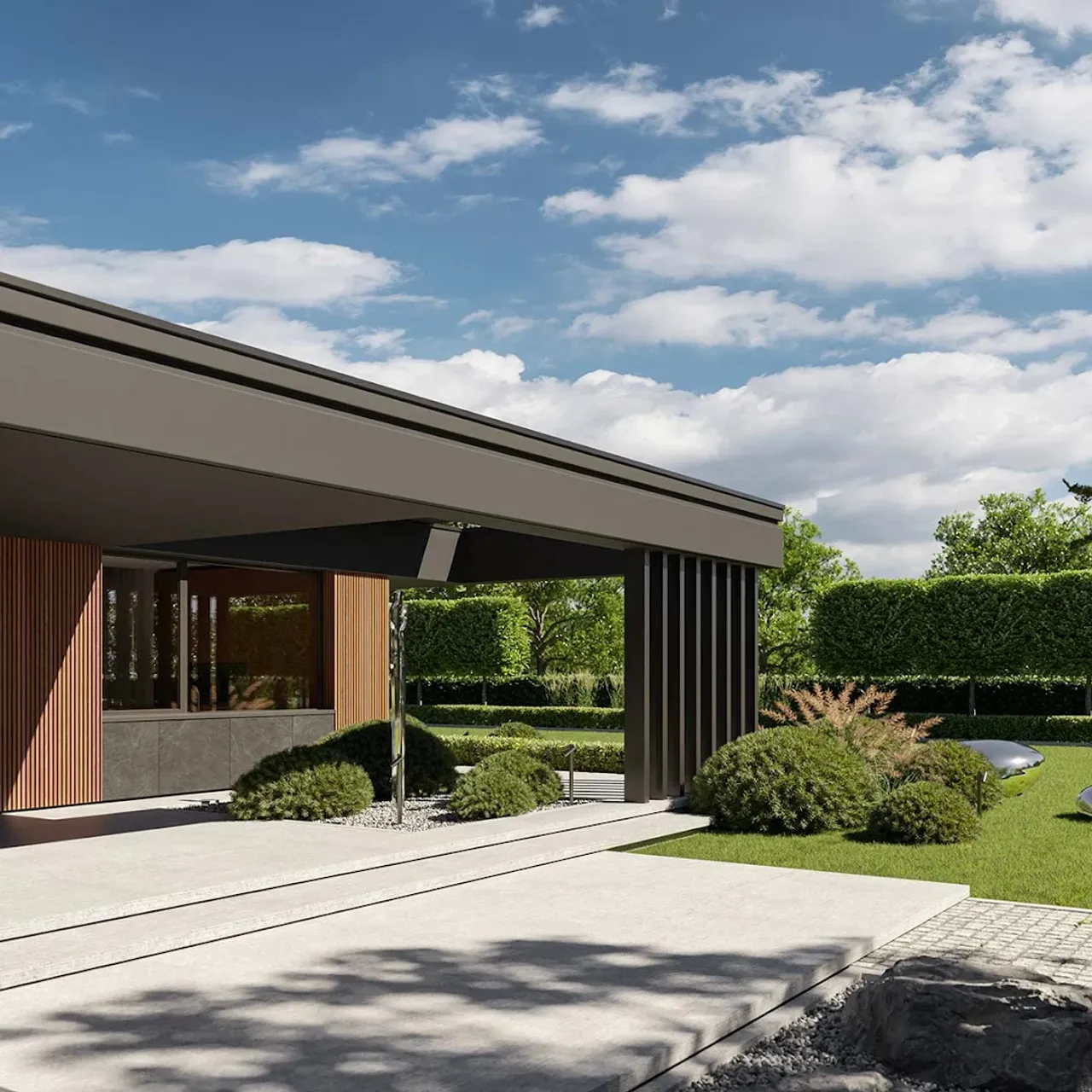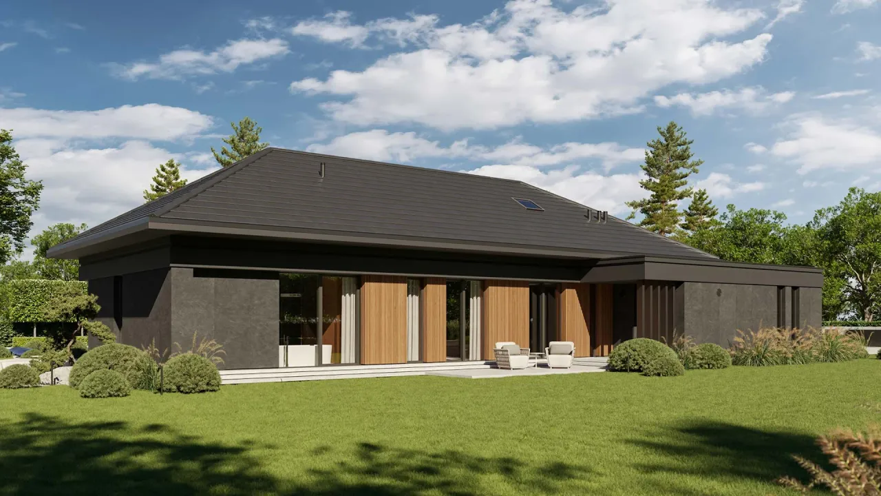 - Elewacja: tynk silikonowy połączony z deskami elewacyjnymi lamelowymi oraz spiekiem kwarcowym.