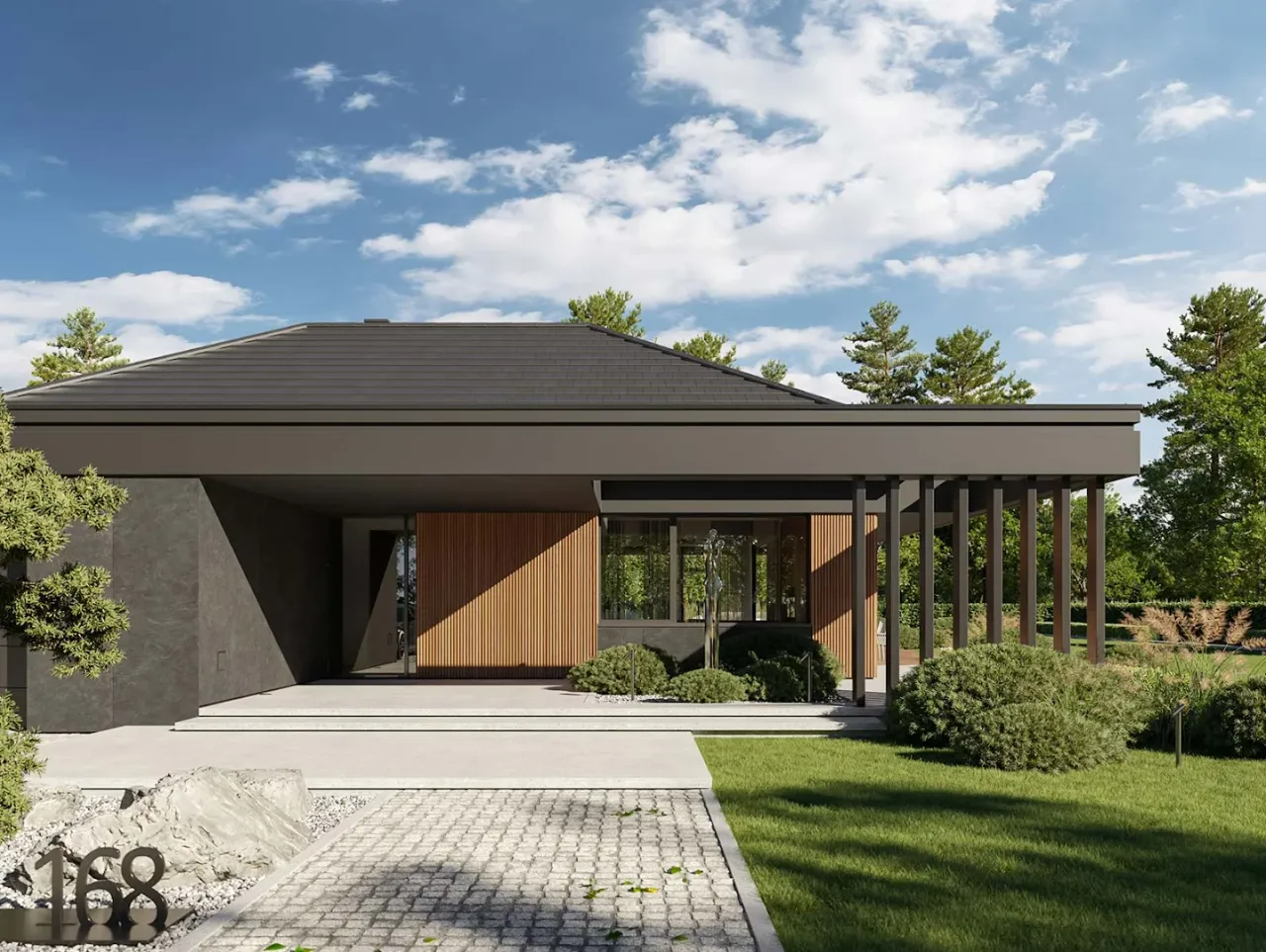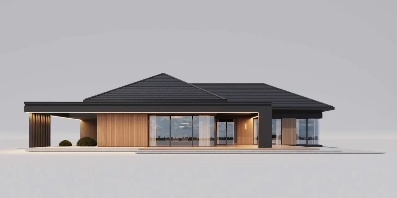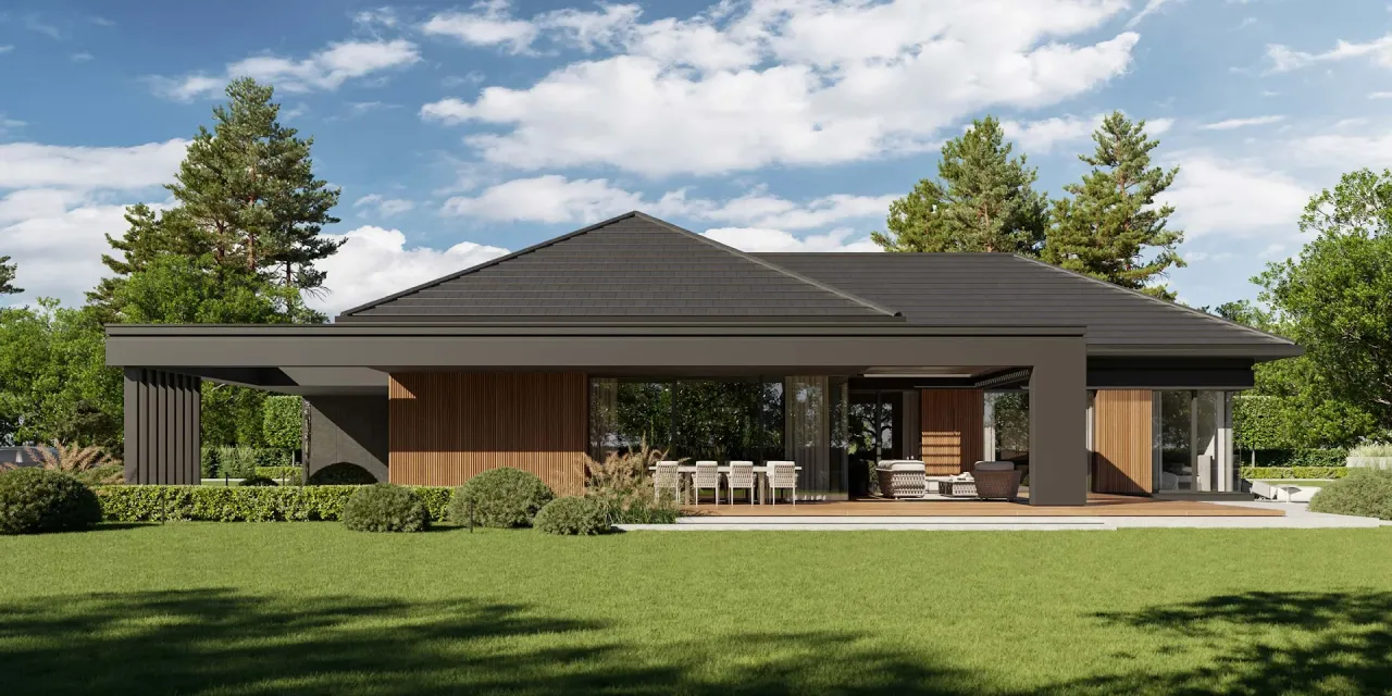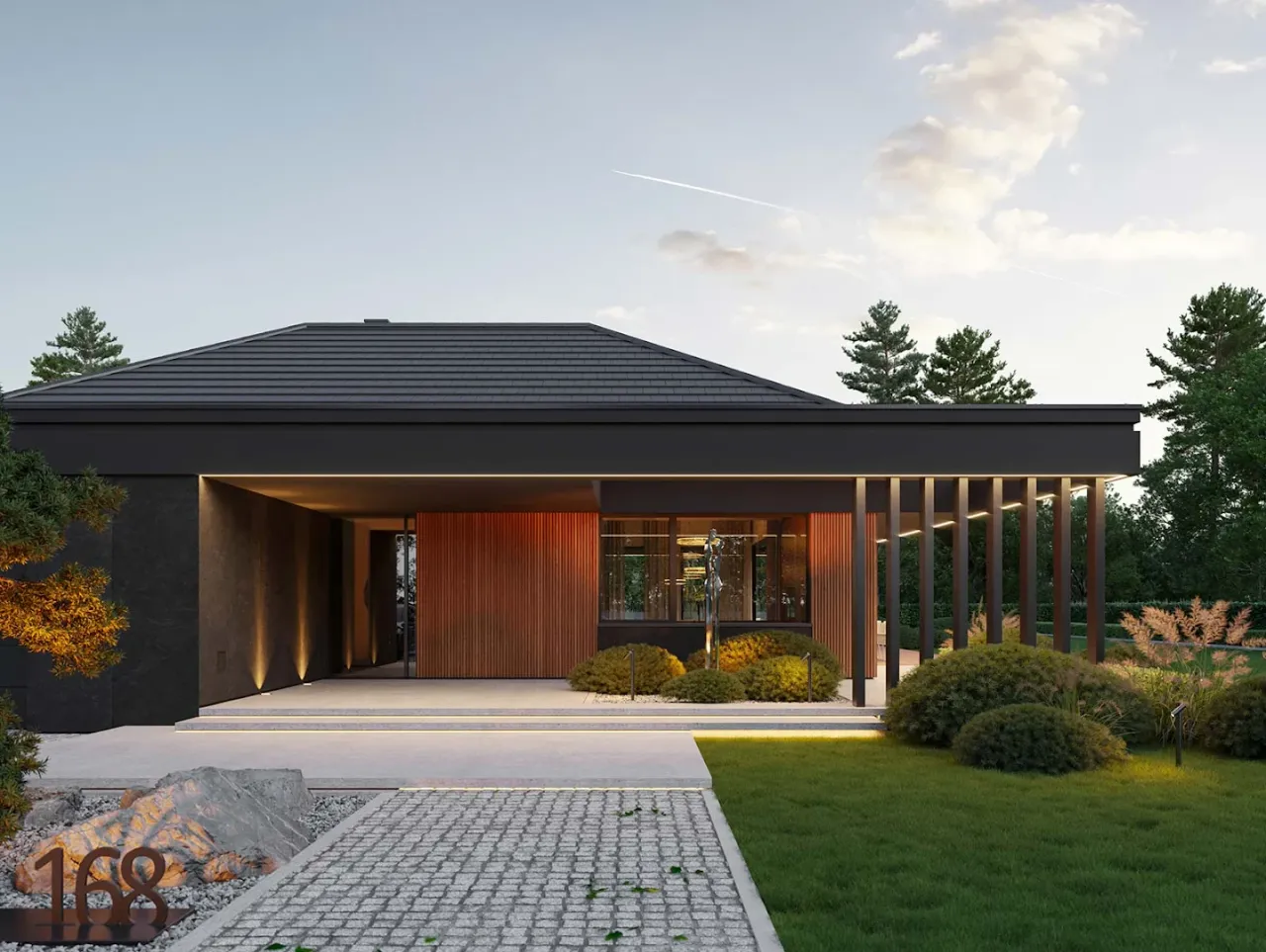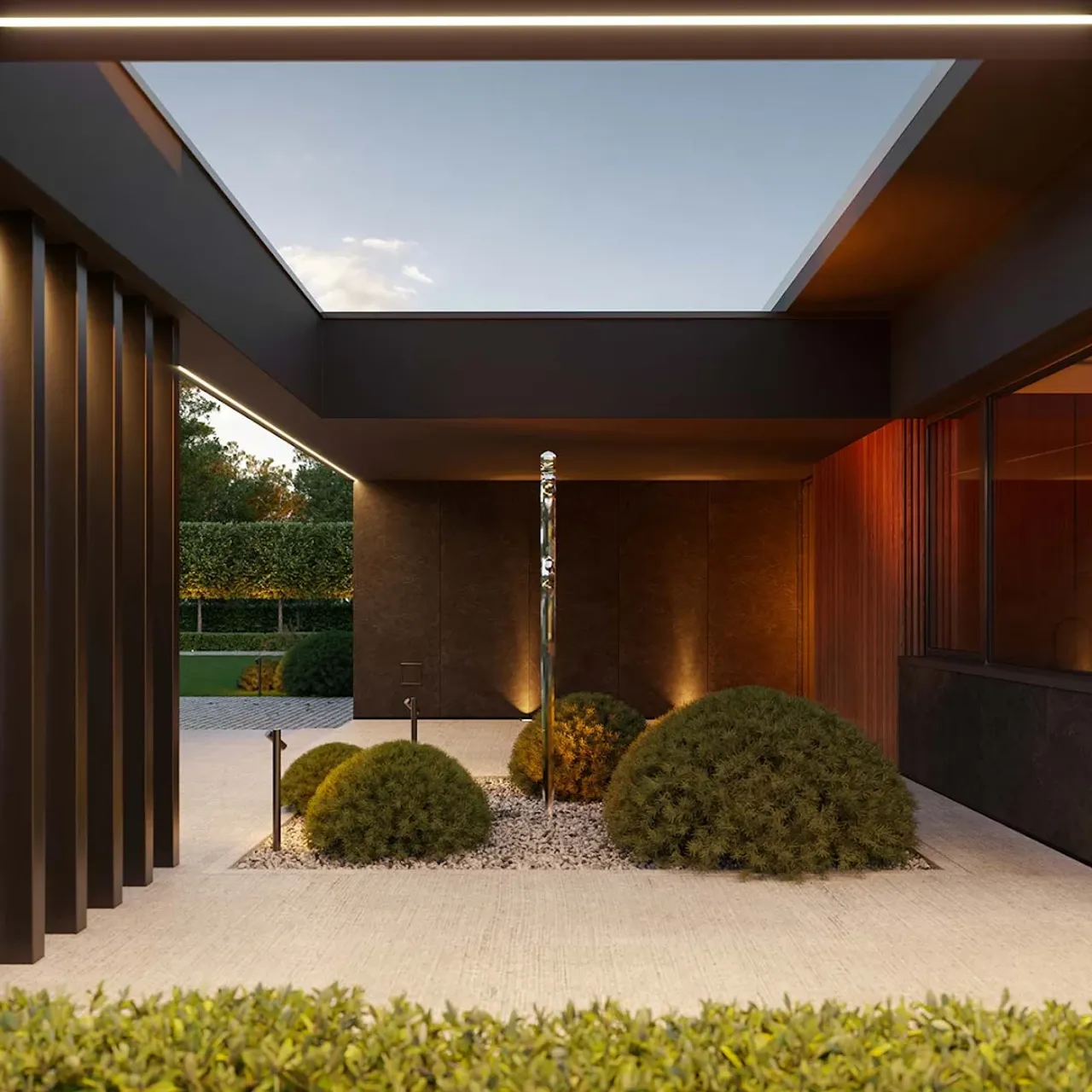 - Elewacja: tynk silikonowy połączony z deskami elewacyjnymi lamelowymi oraz spiekiem kwarcowym.