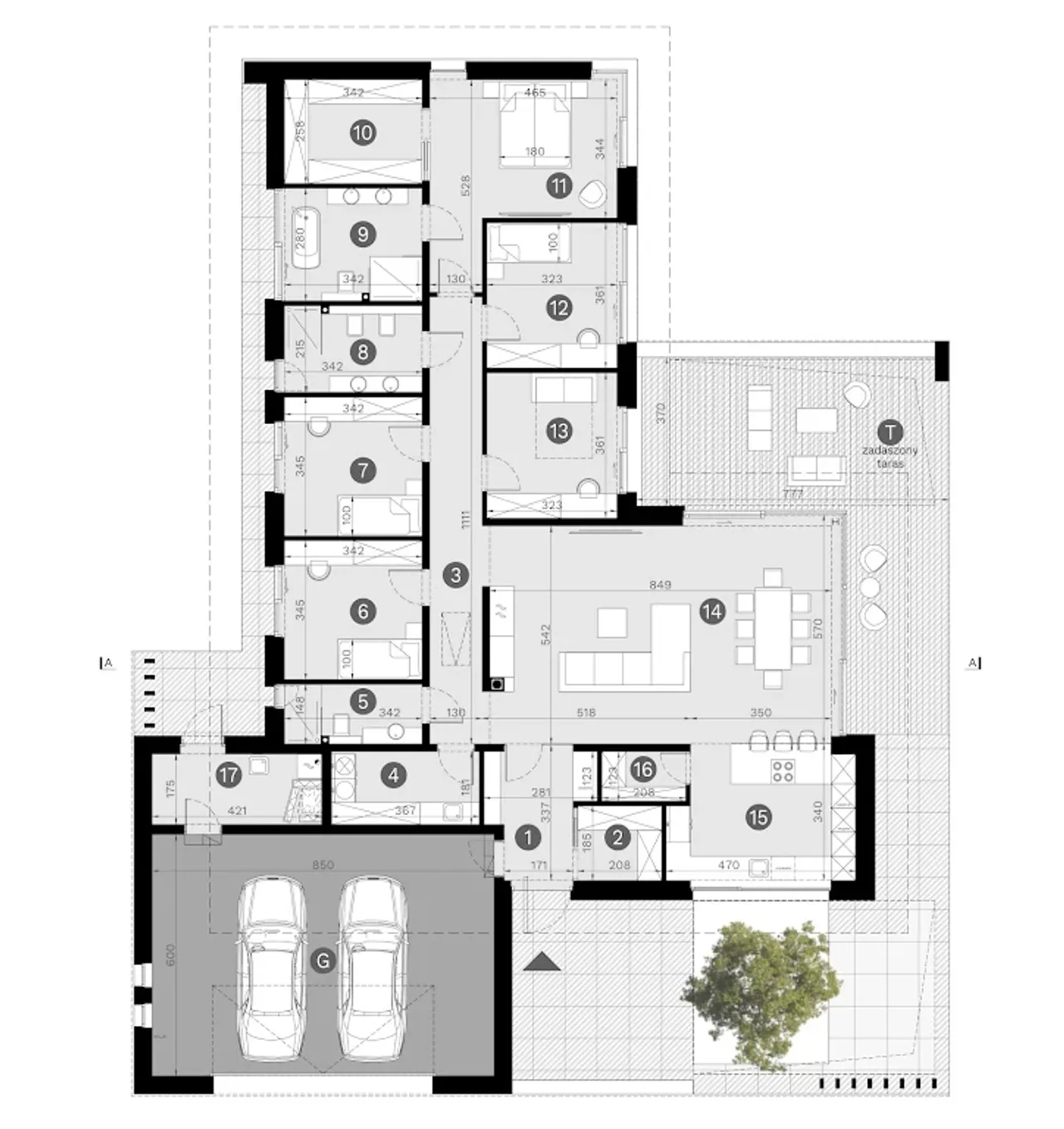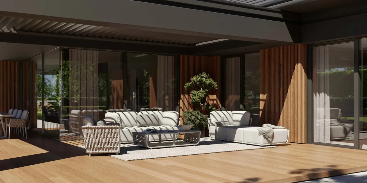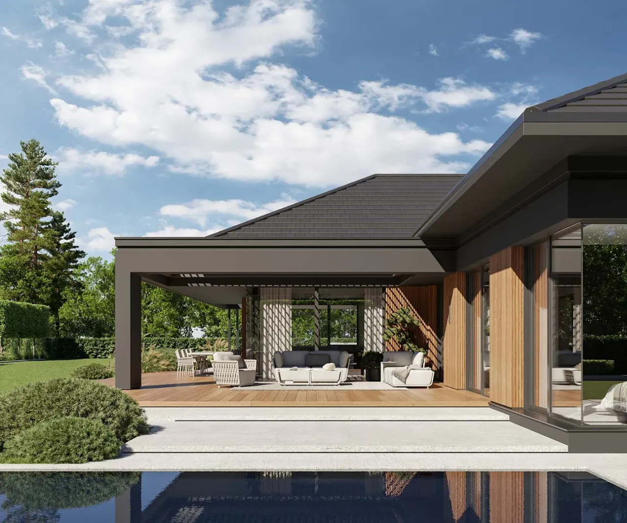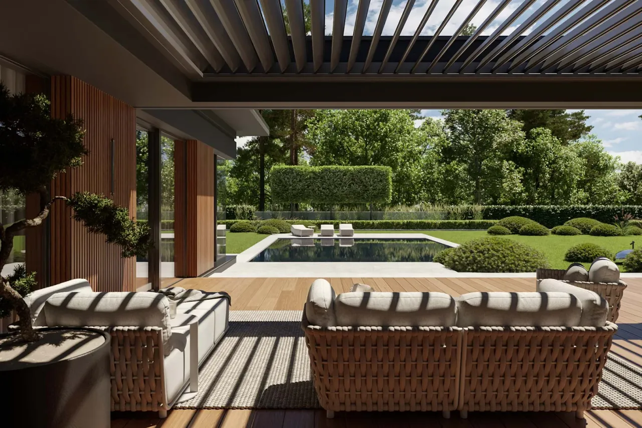 - Elewacja: tynk silikonowy połączony z deskami elewacyjnymi lamelowymi oraz spiekiem kwarcowym.