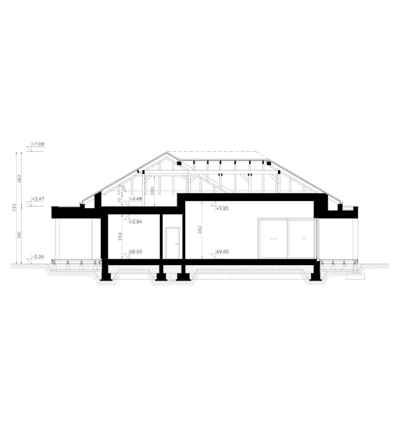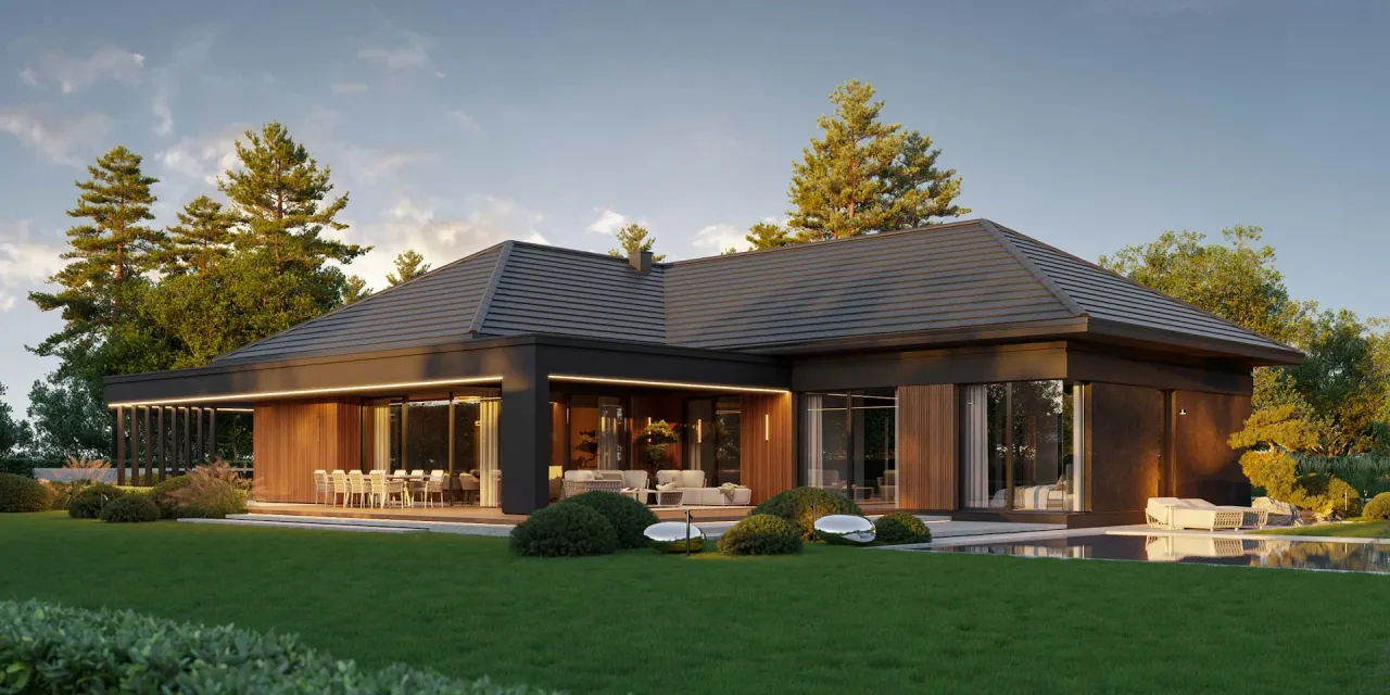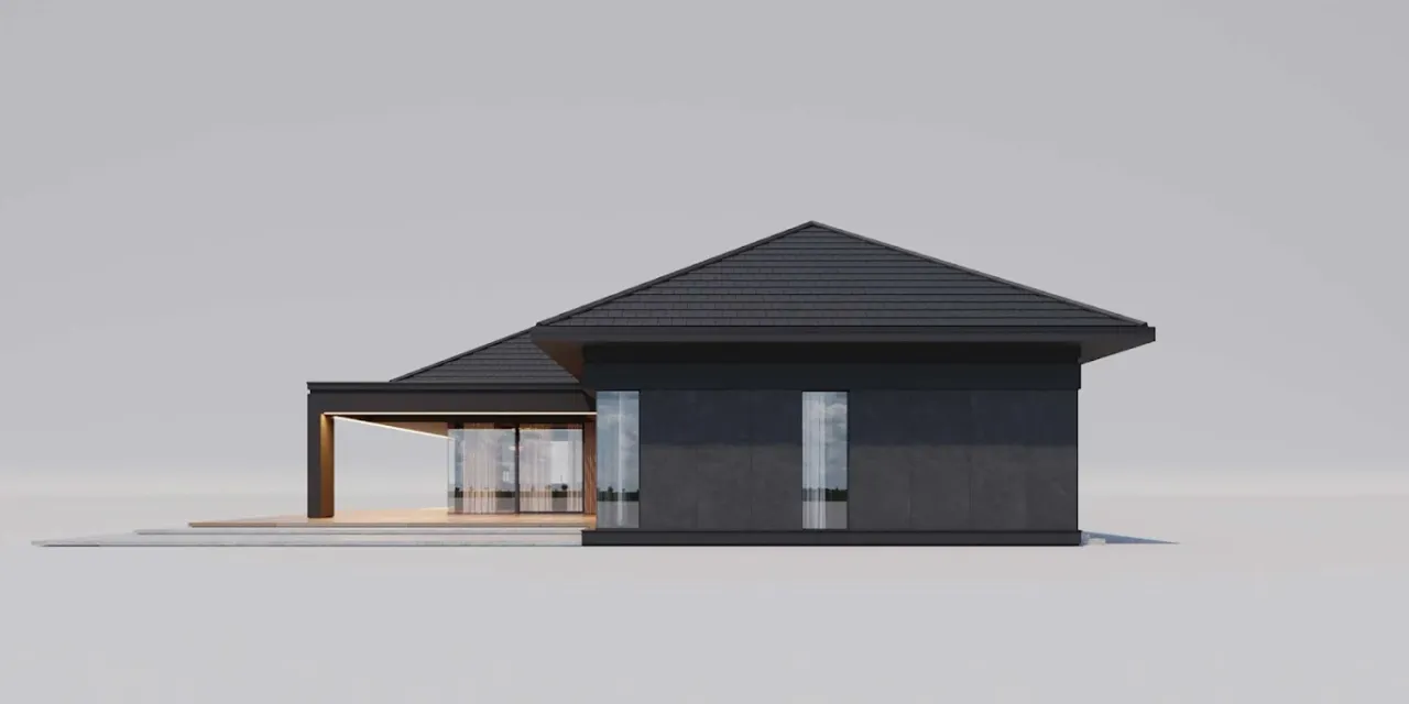- Dach: czterospadowy kryty dachówką ceramiczną lub cementową swissporTON, stropodach pełny kryty membraną EPDM.