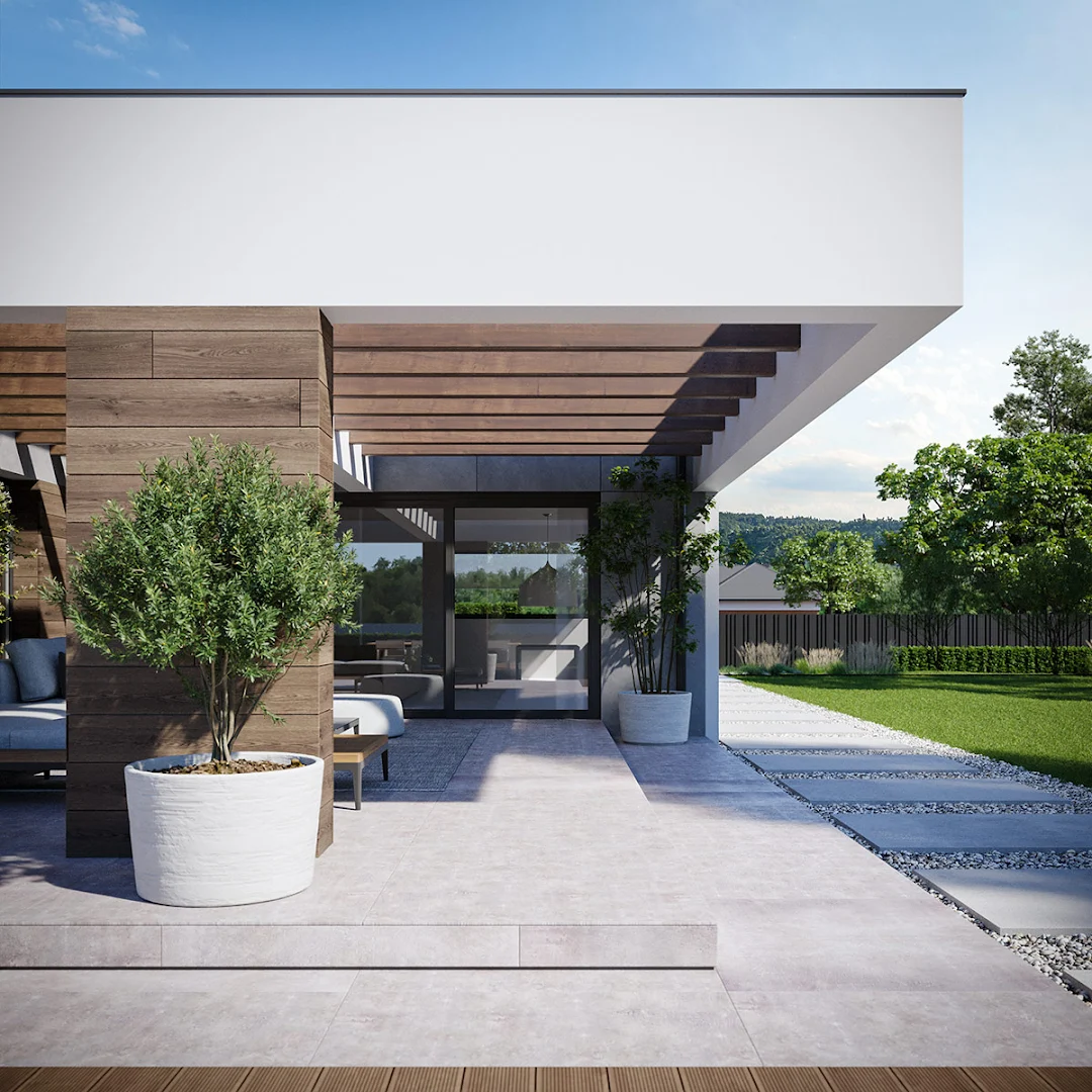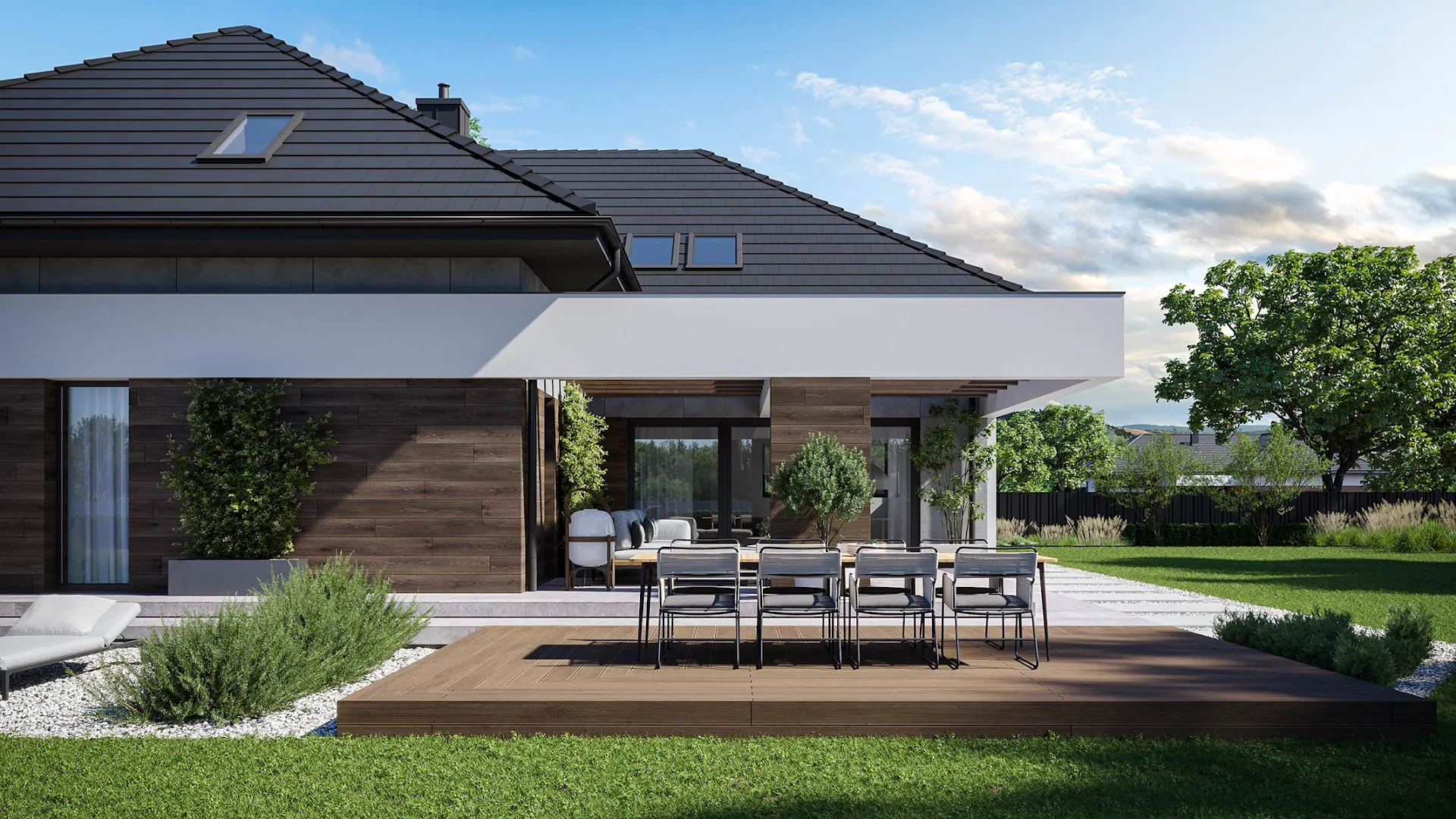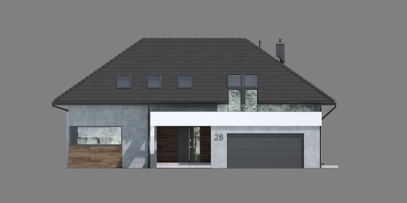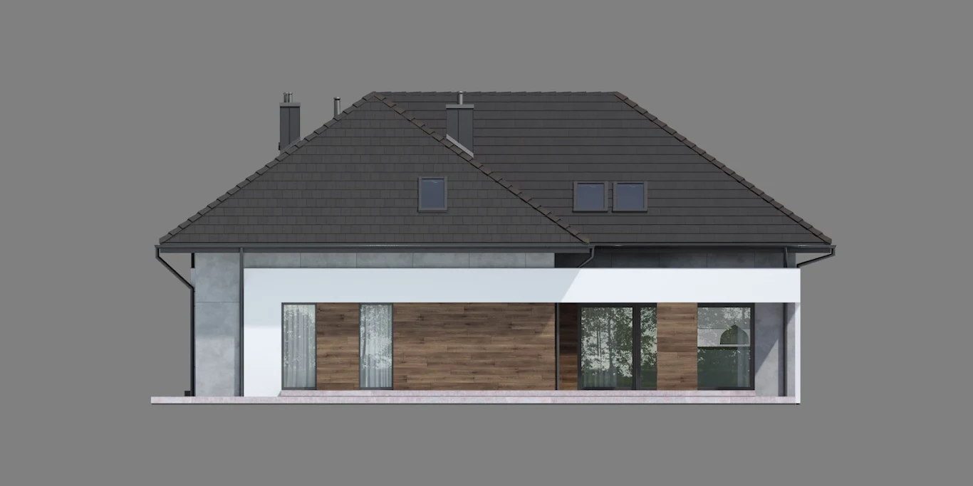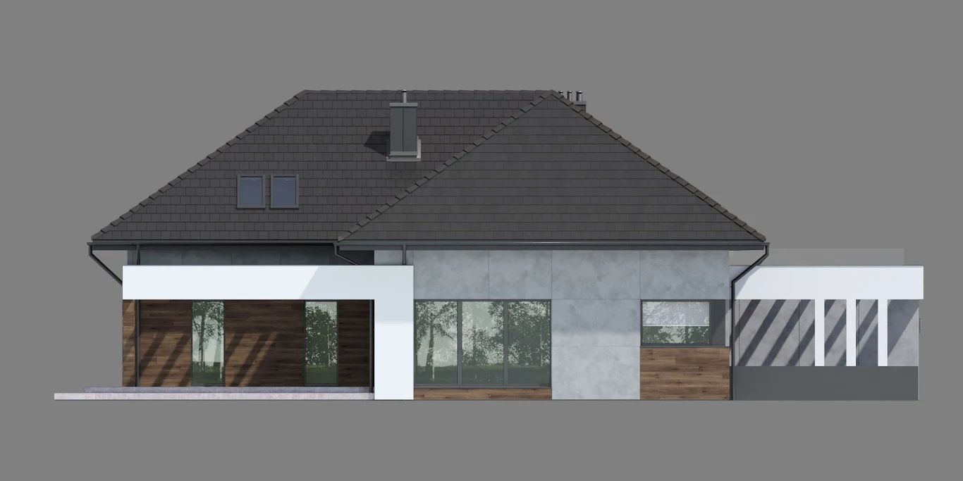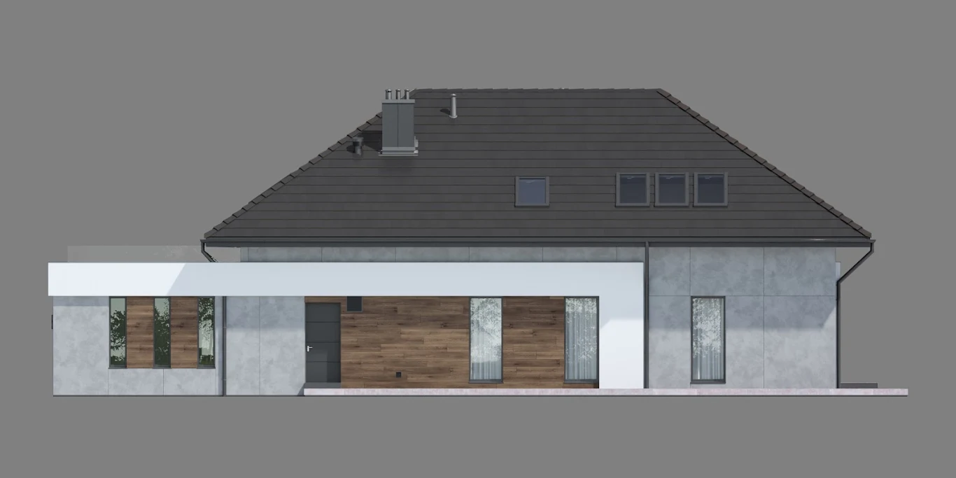 - Elewacja: betonowe płyty elewacyjne połączone z tynkiem i drewnem elewacyjnym Thermory thermo jesion amerykański firmy Komplex Market.