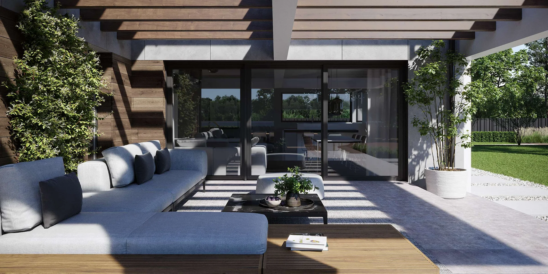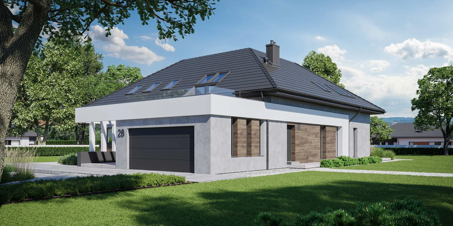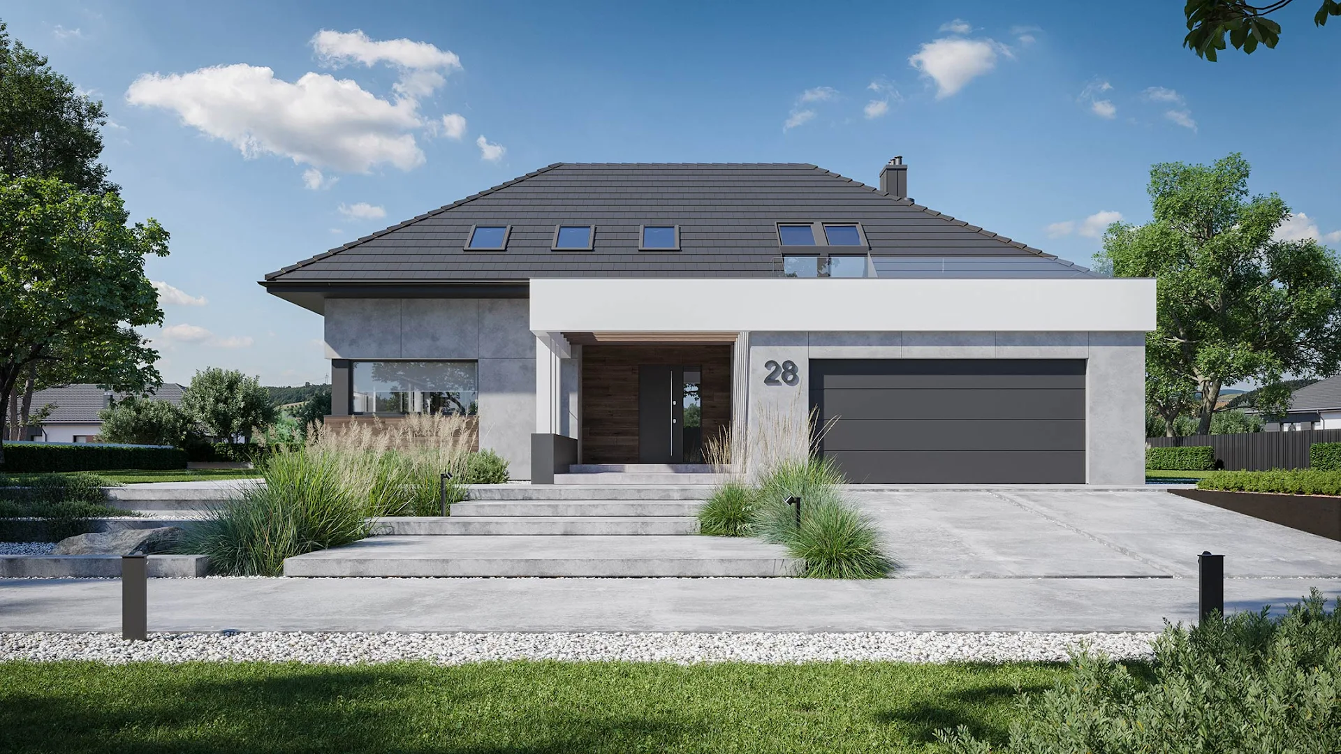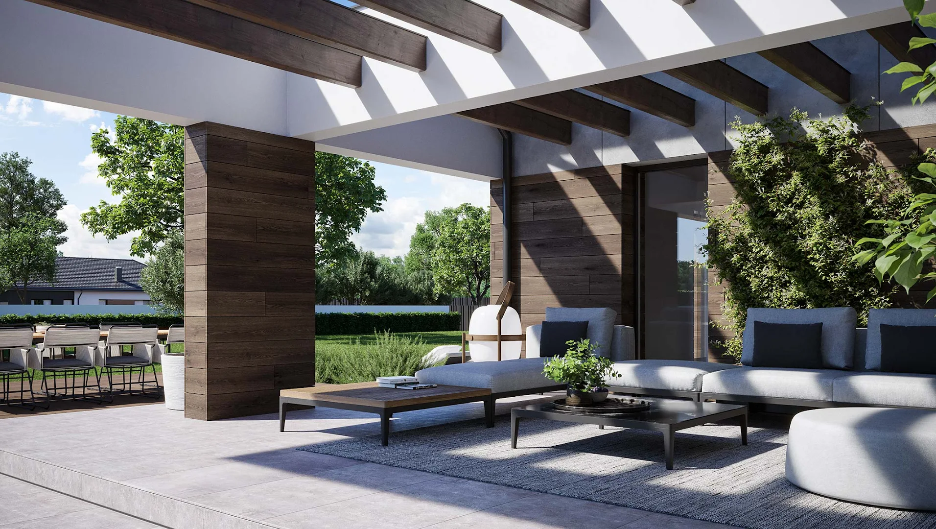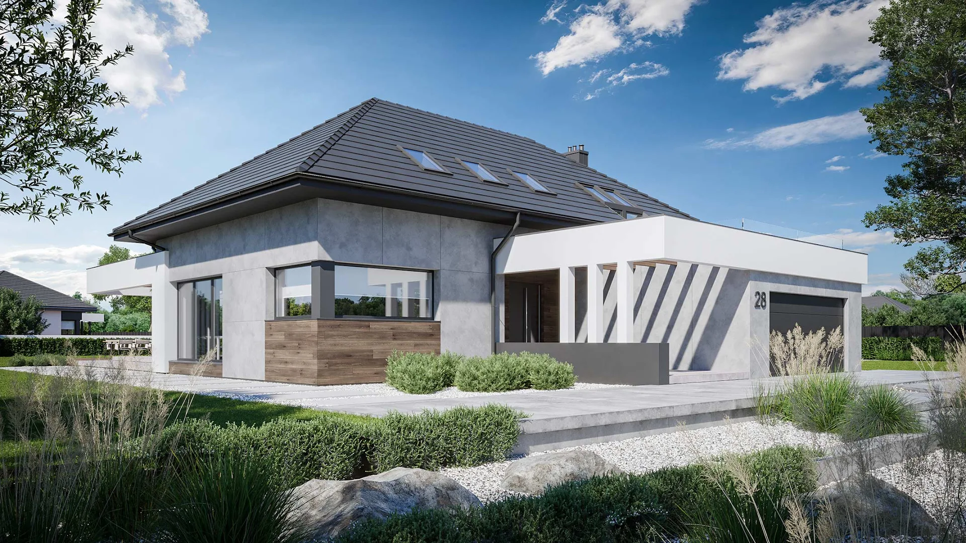 - Elewacja: betonowe płyty elewacyjne połączone z tynkiem i drewnem elewacyjnym Thermory thermo jesion amerykański firmy Komplex Market.