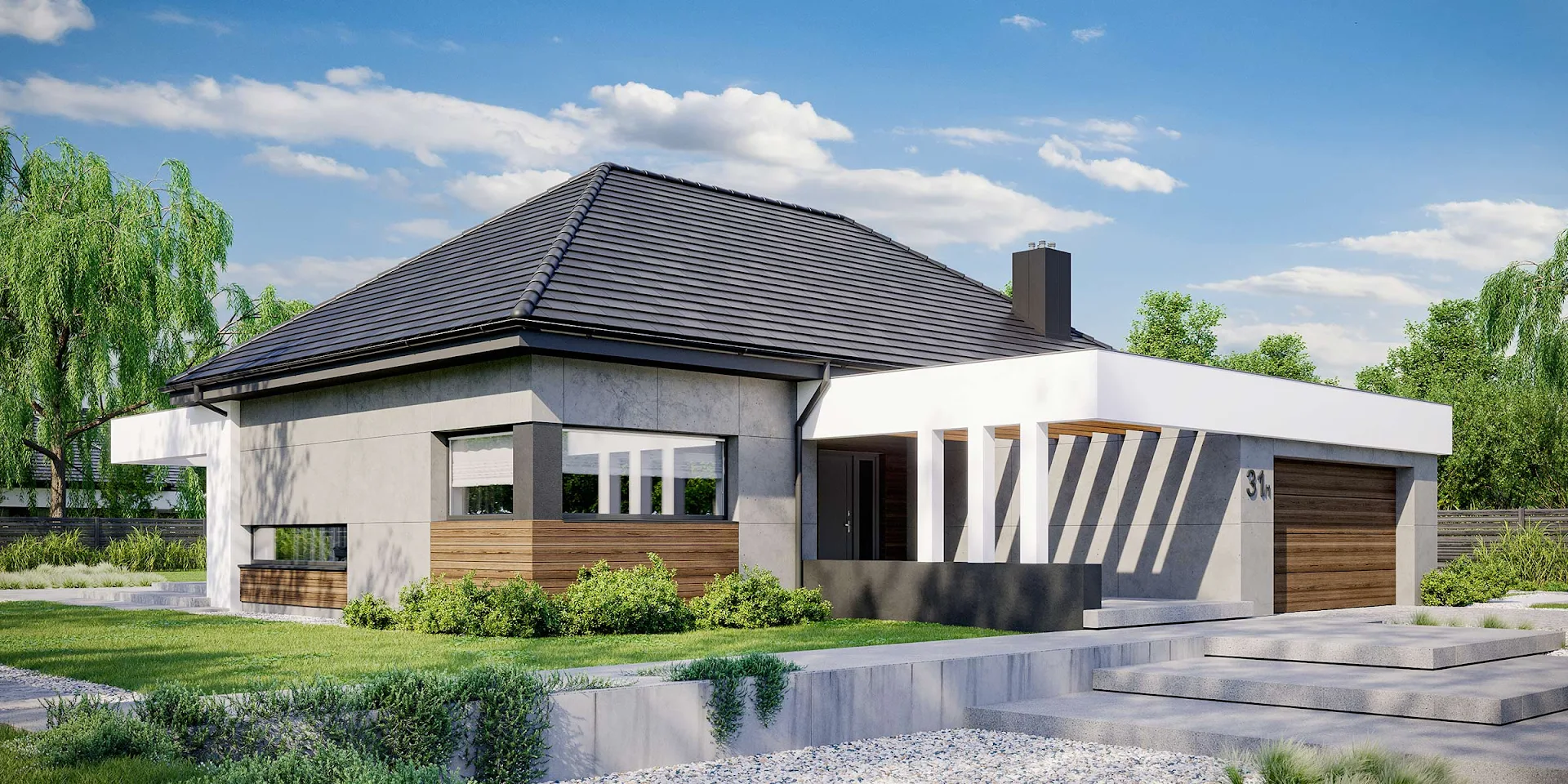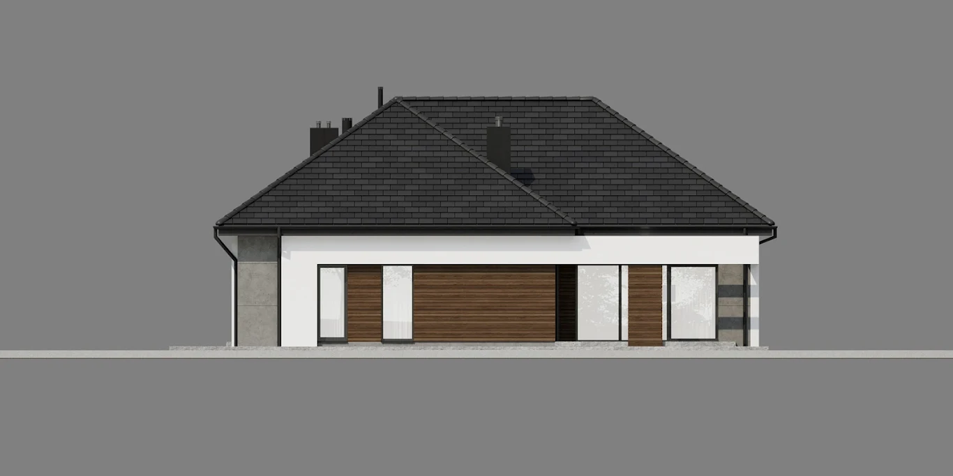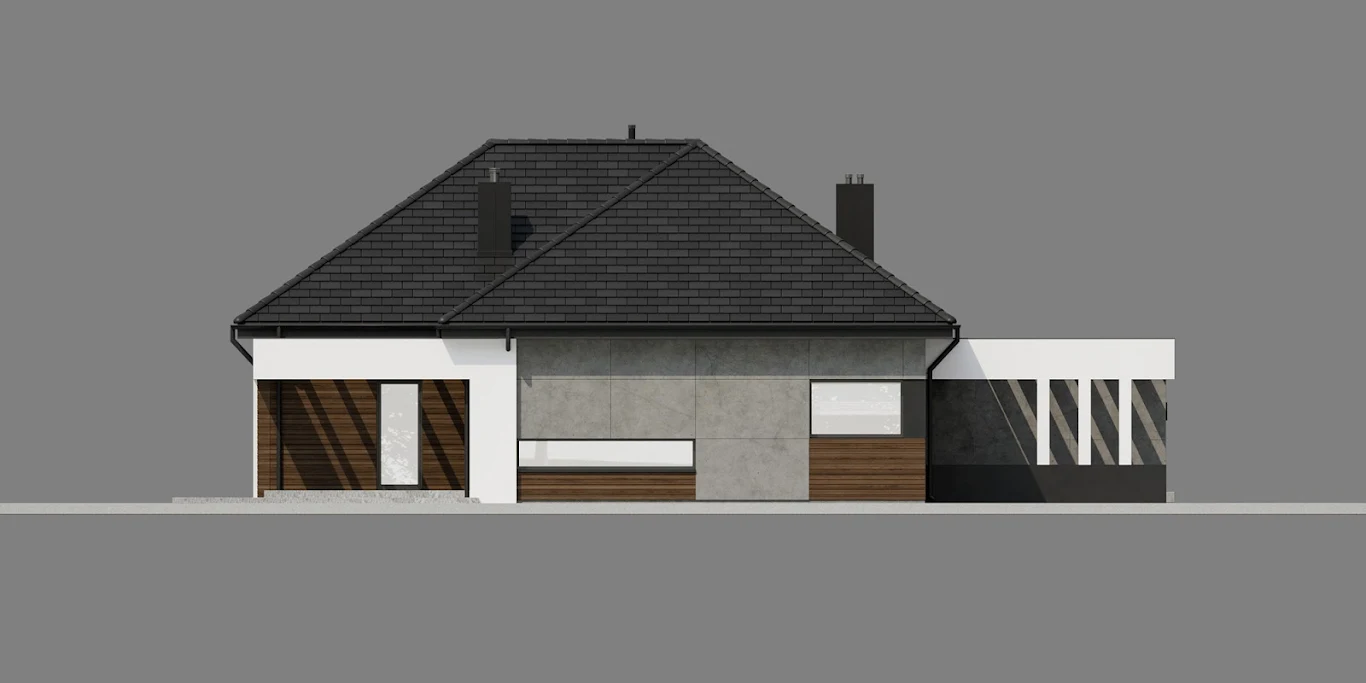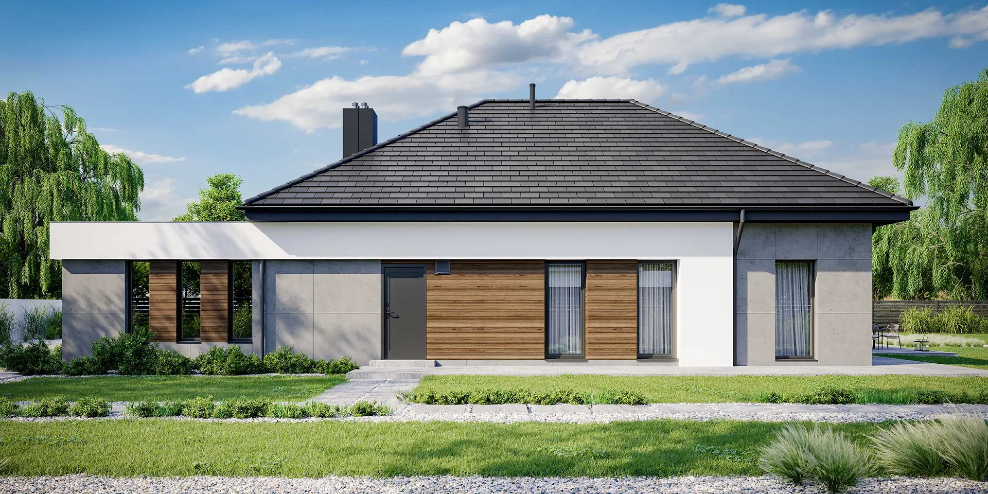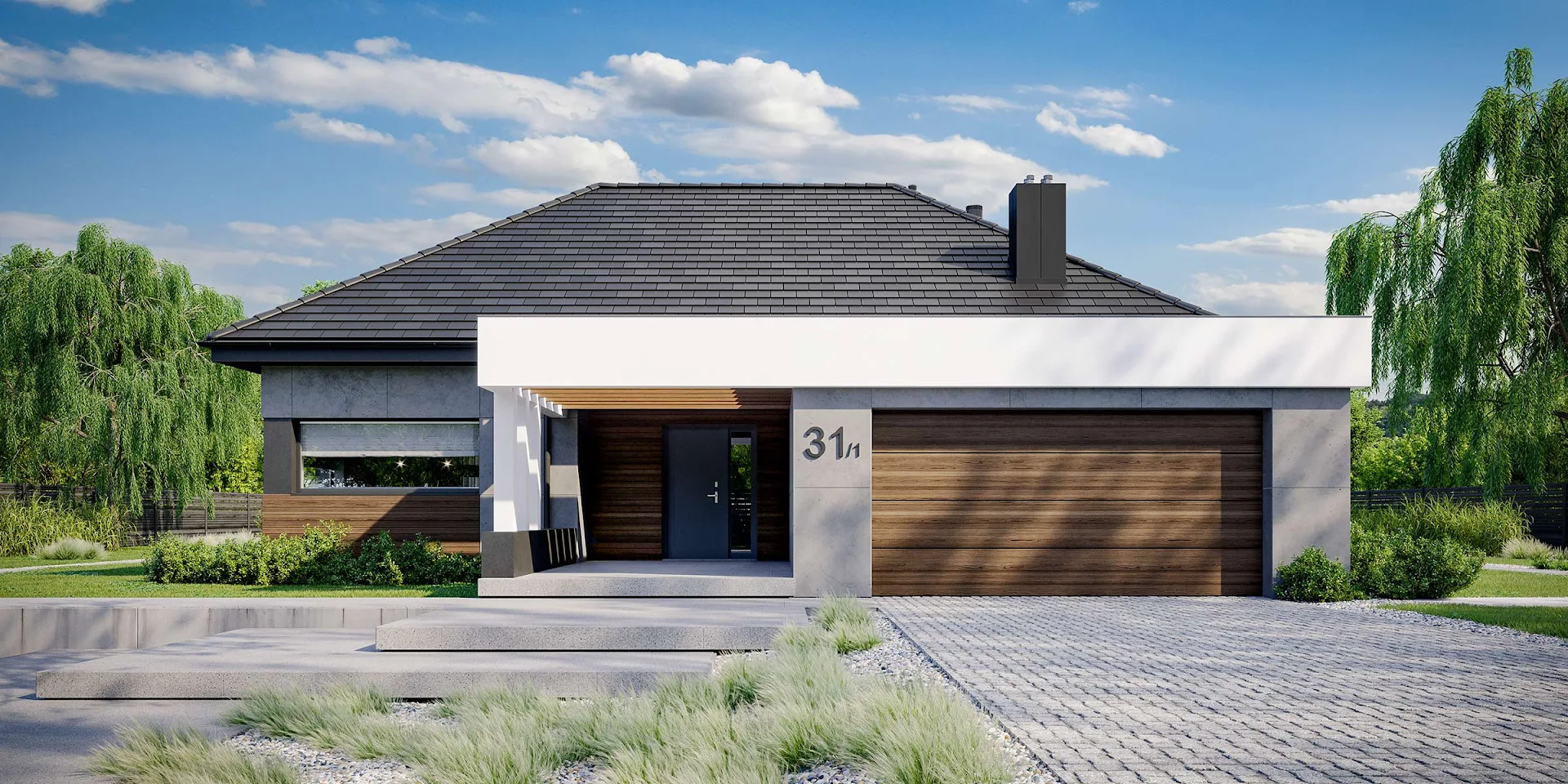 • Elewacja: betonowe płyty elewacyjne połączone z tynkiem i drewnem elewacyjnym Thermory thermo jesion amerykański firmy Komplex Market.
