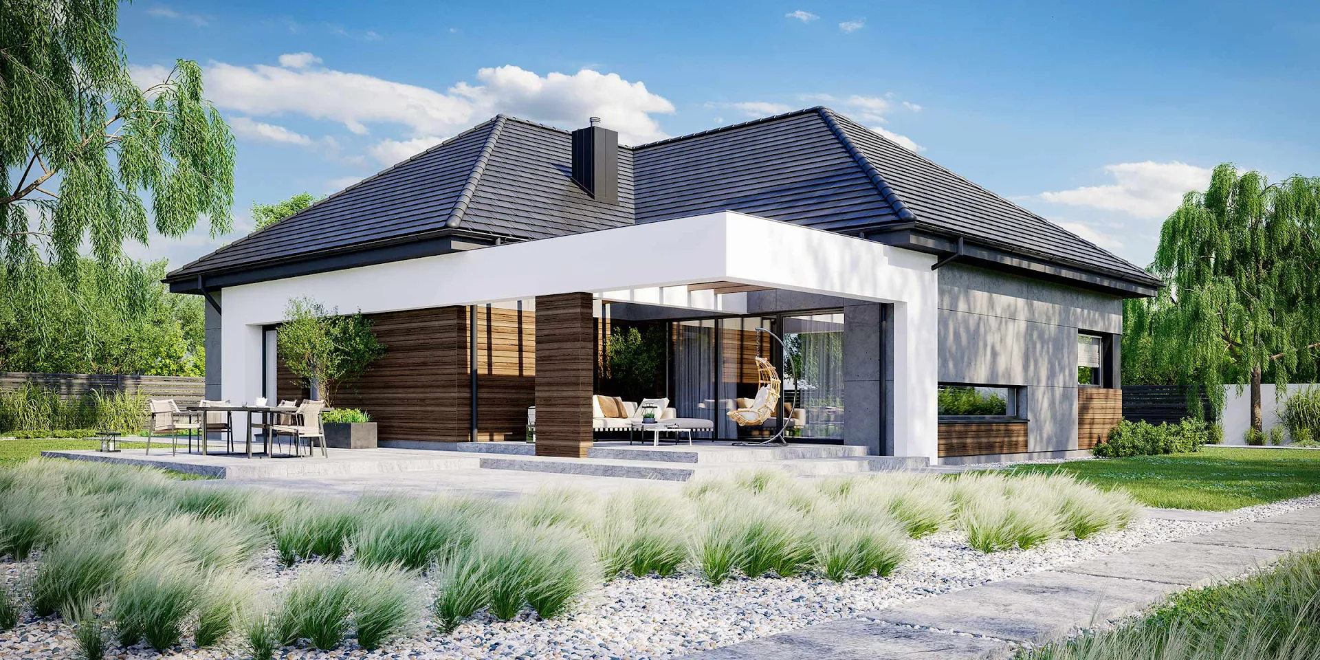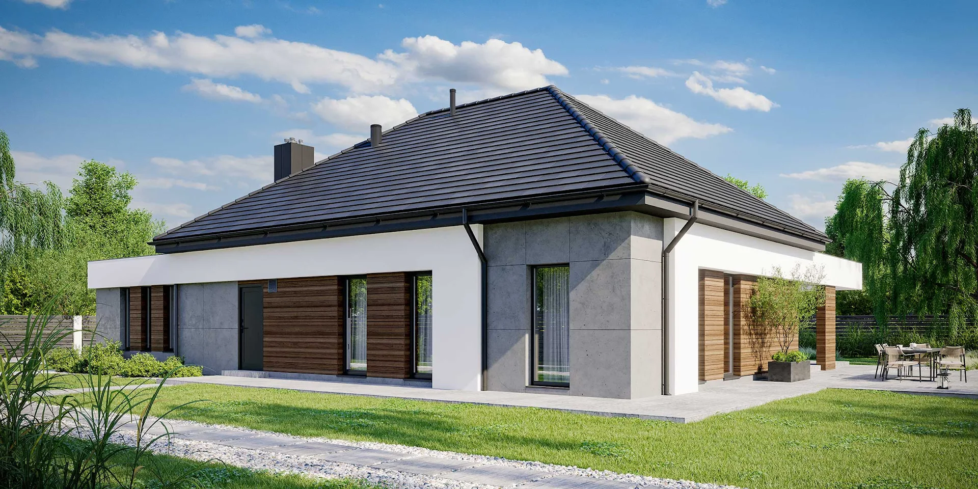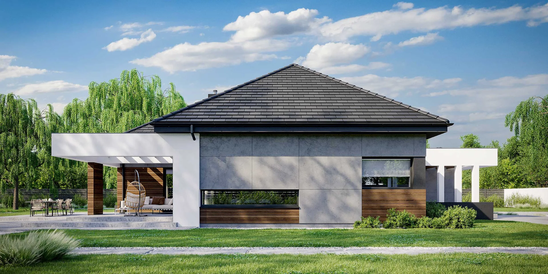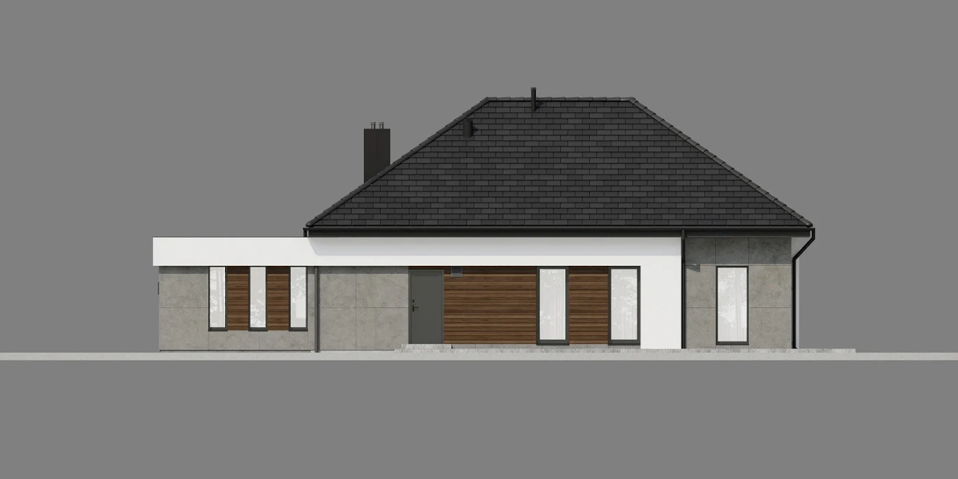 • Elewacja: betonowe płyty elewacyjne połączone z tynkiem i drewnem elewacyjnym Thermory thermo jesion amerykański firmy Komplex Market.