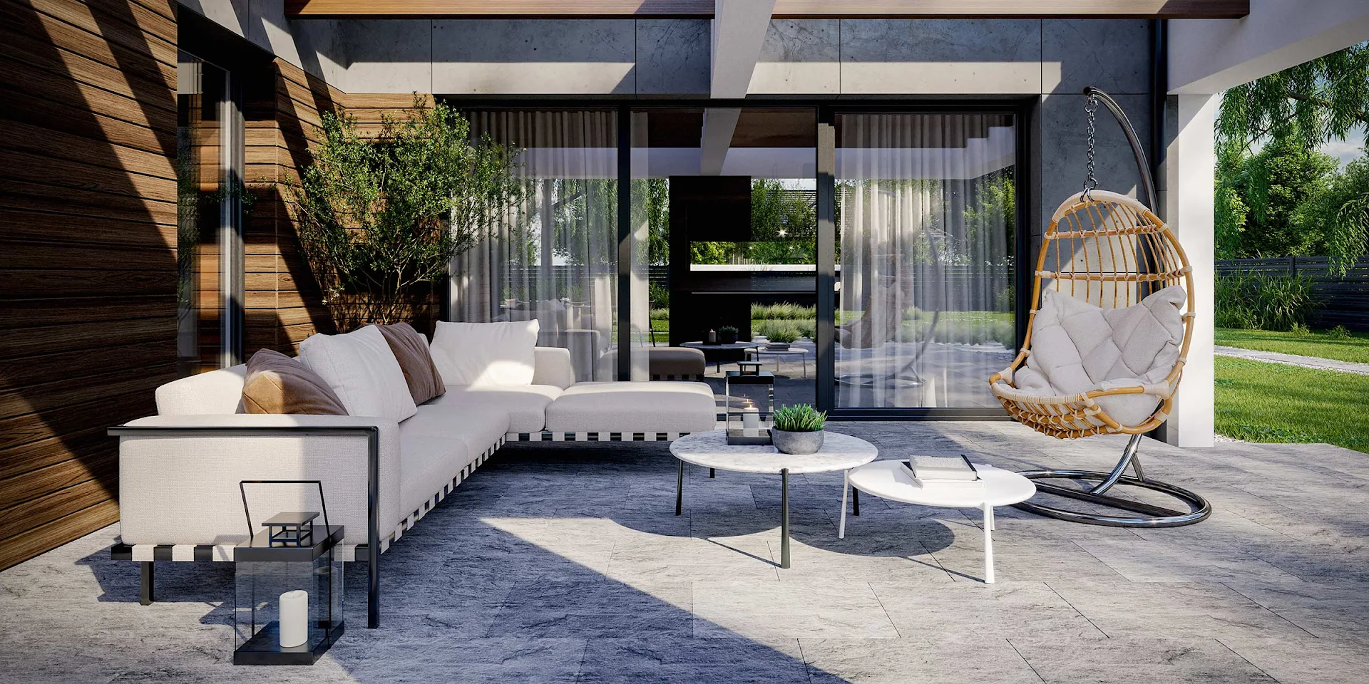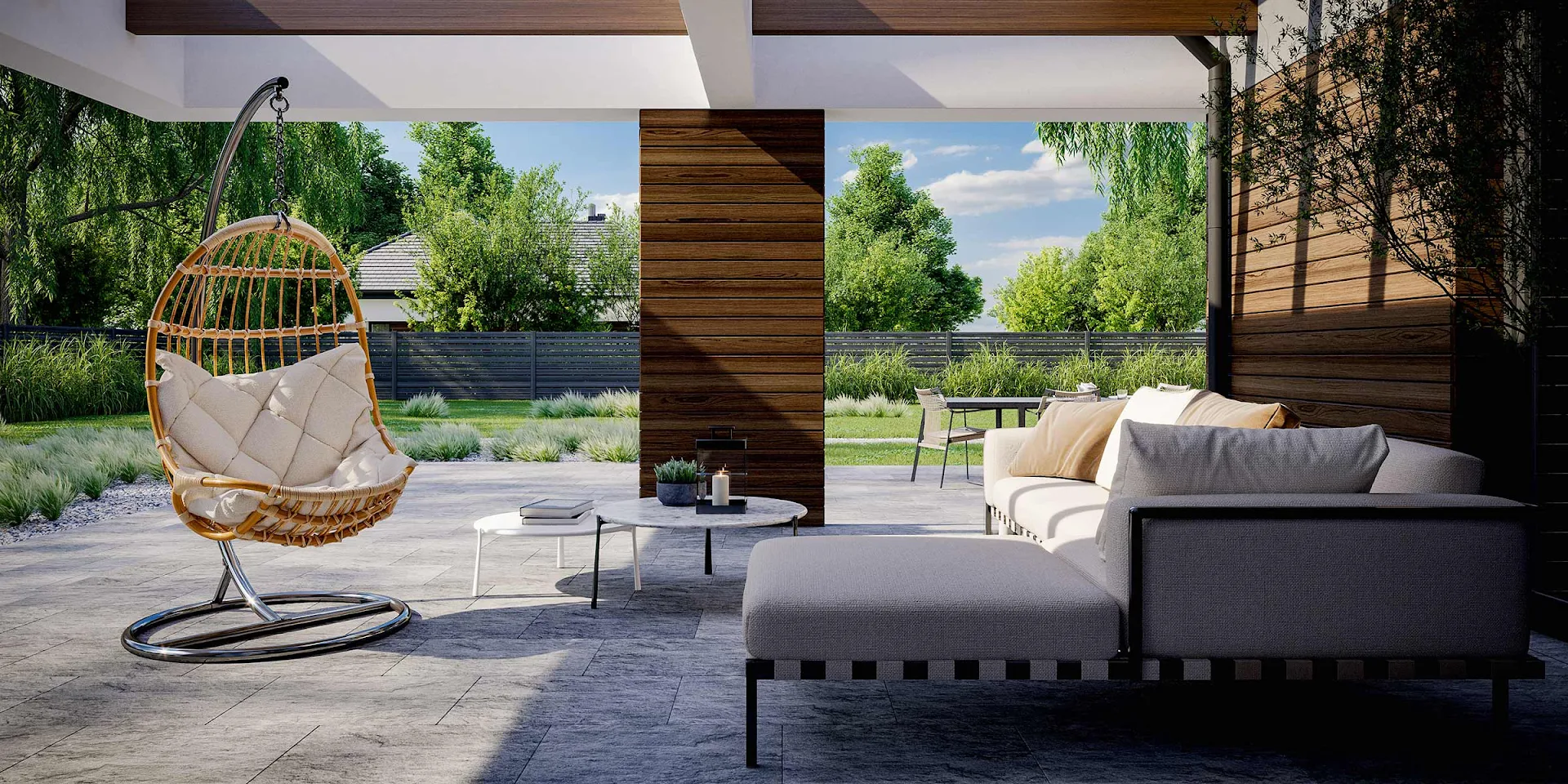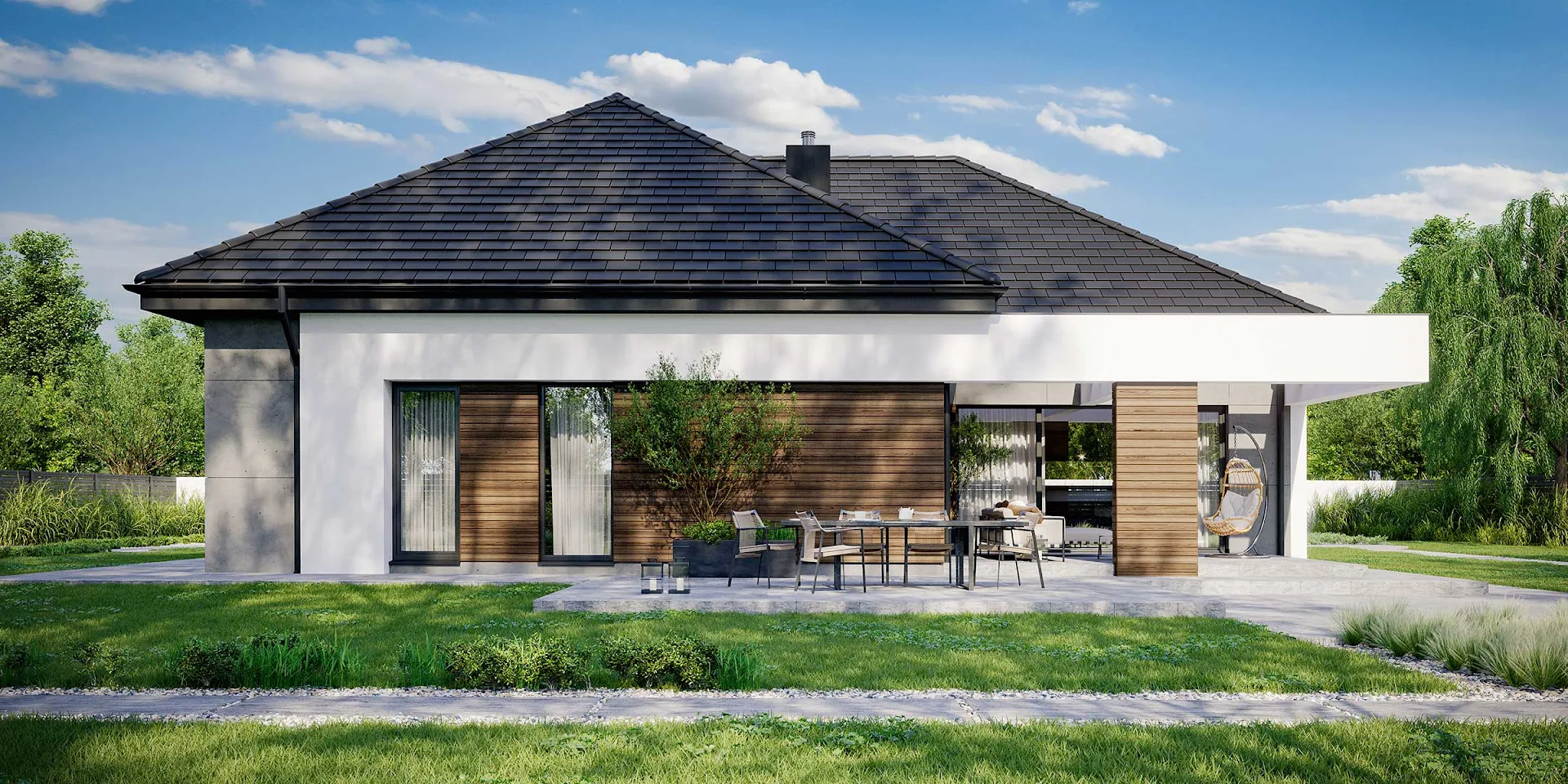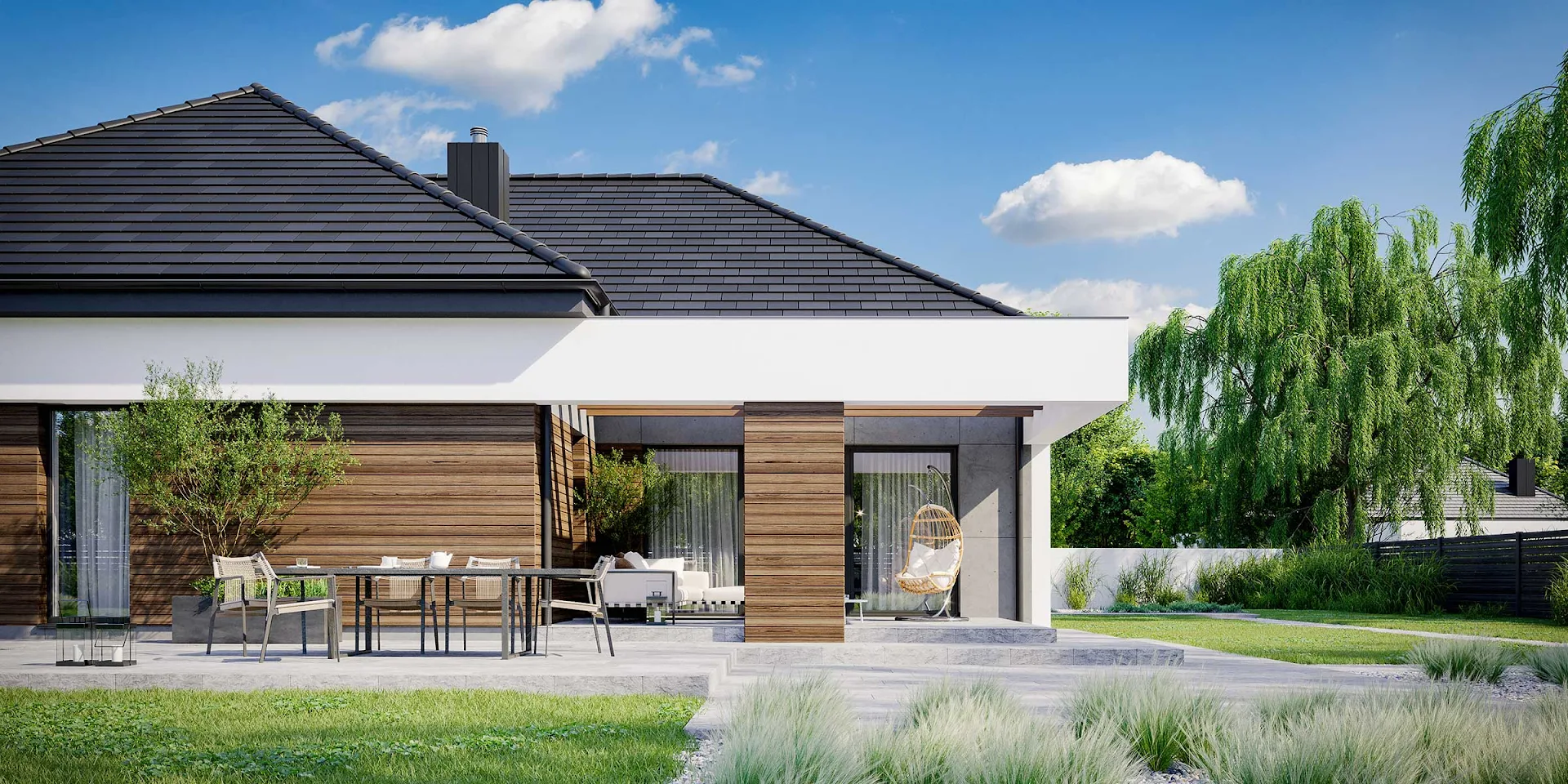 • Elewacja: betonowe płyty elewacyjne połączone z tynkiem i drewnem elewacyjnym Thermory thermo jesion amerykański firmy Komplex Market.