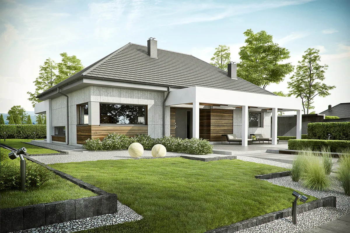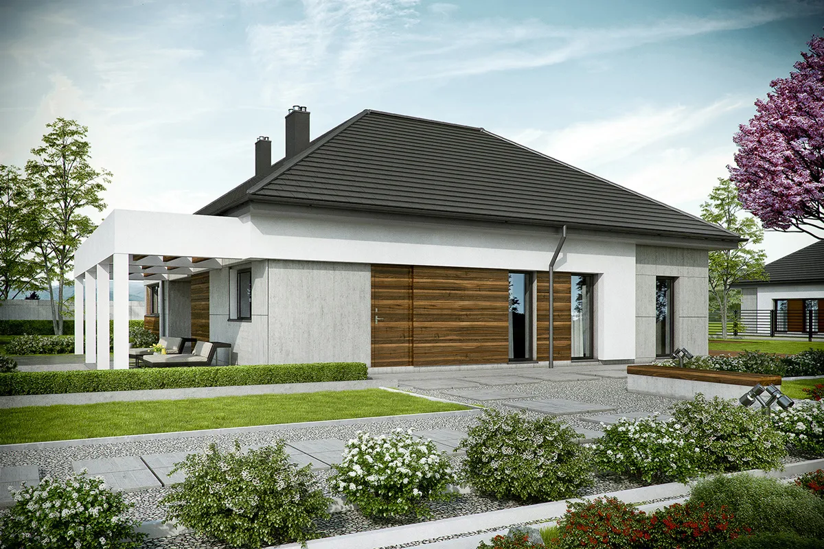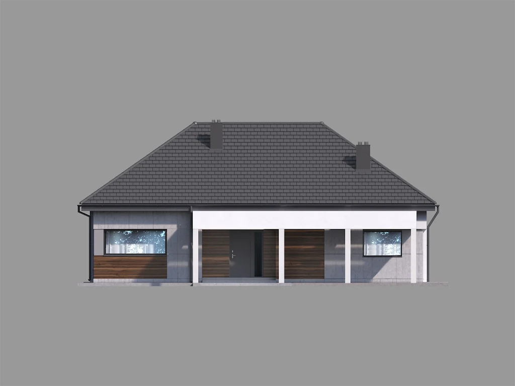 - Elewacja: deski elewacyjne połączone z betonem elewacyjnym i tynkiem.