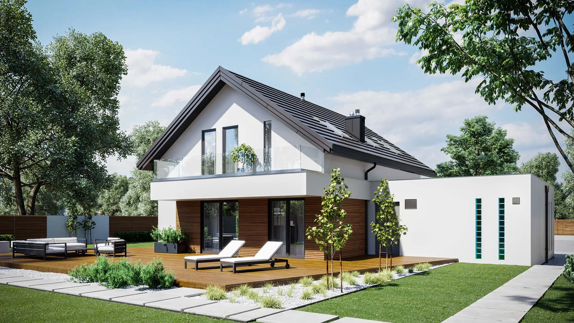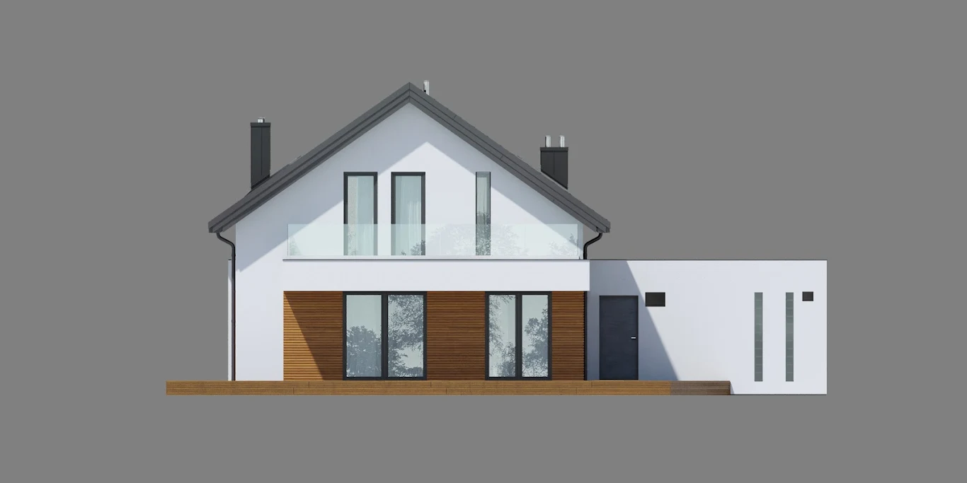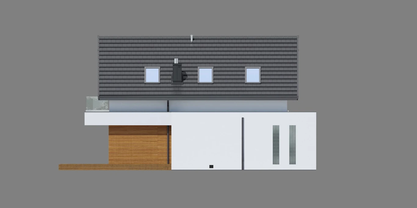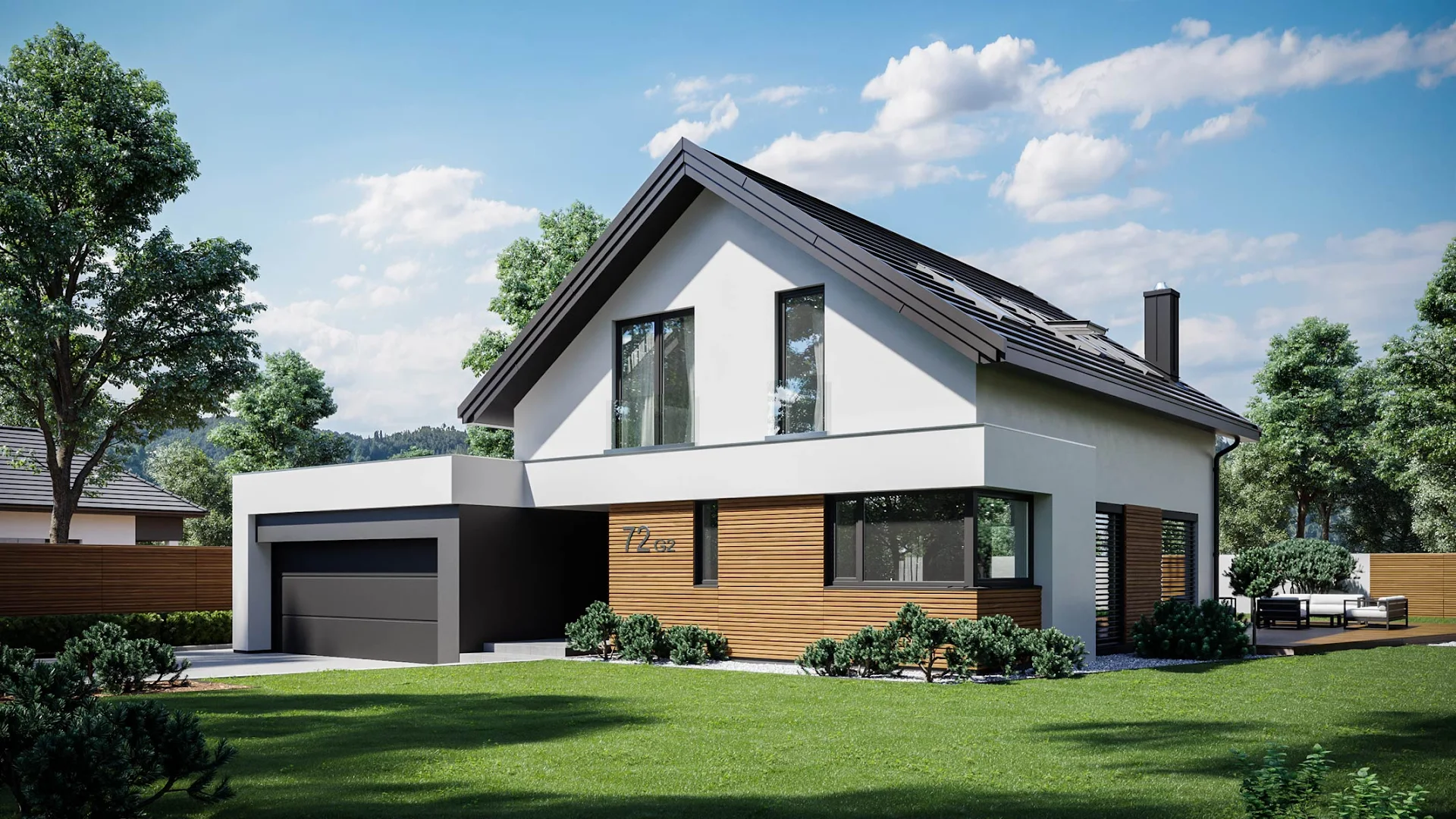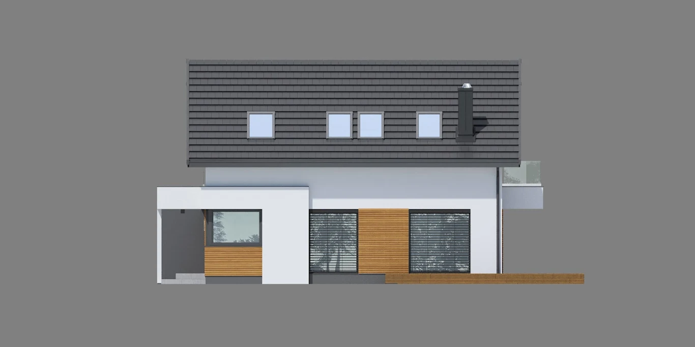 - Elewacja: tynk silikonowy połączony z drewnem elewacyjnym Thermory thermo sosna bezsęczna firmy Komplex Market.