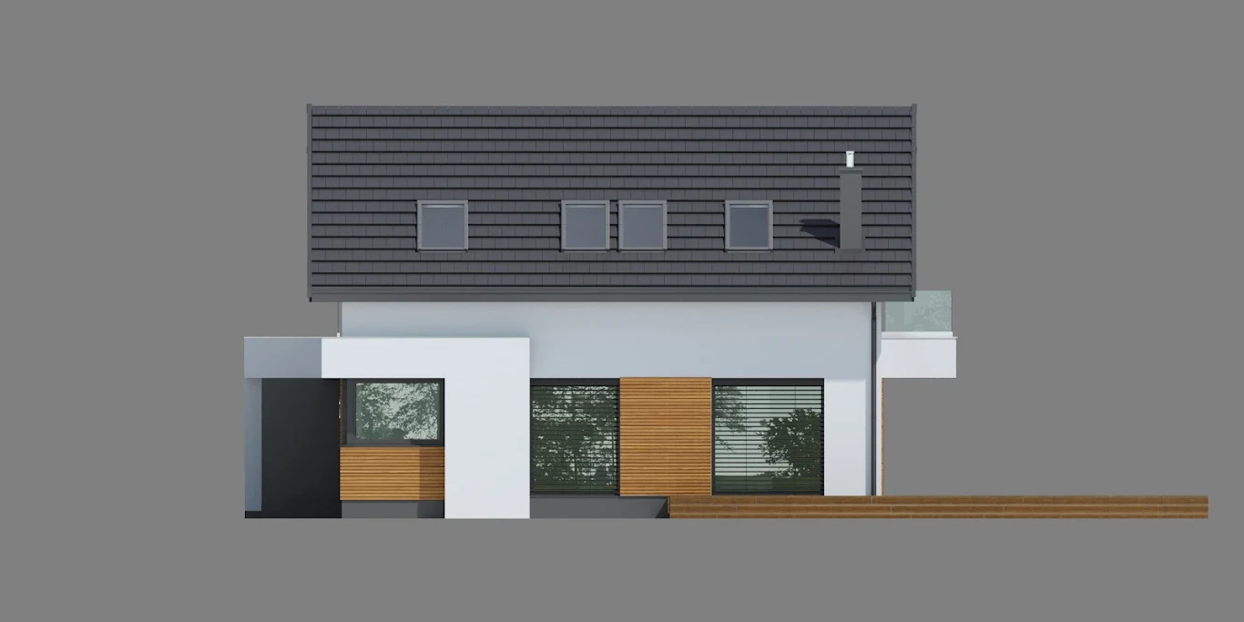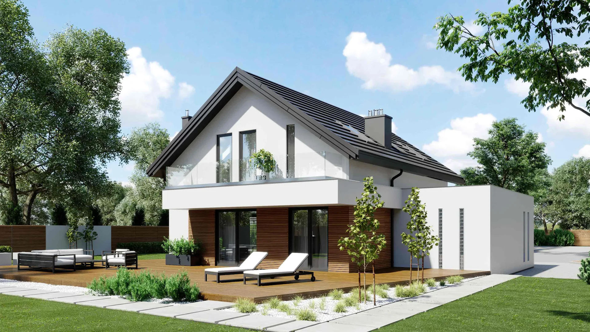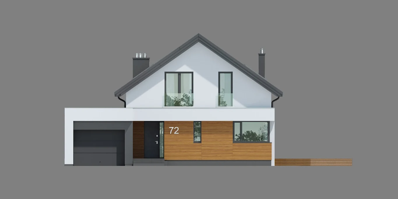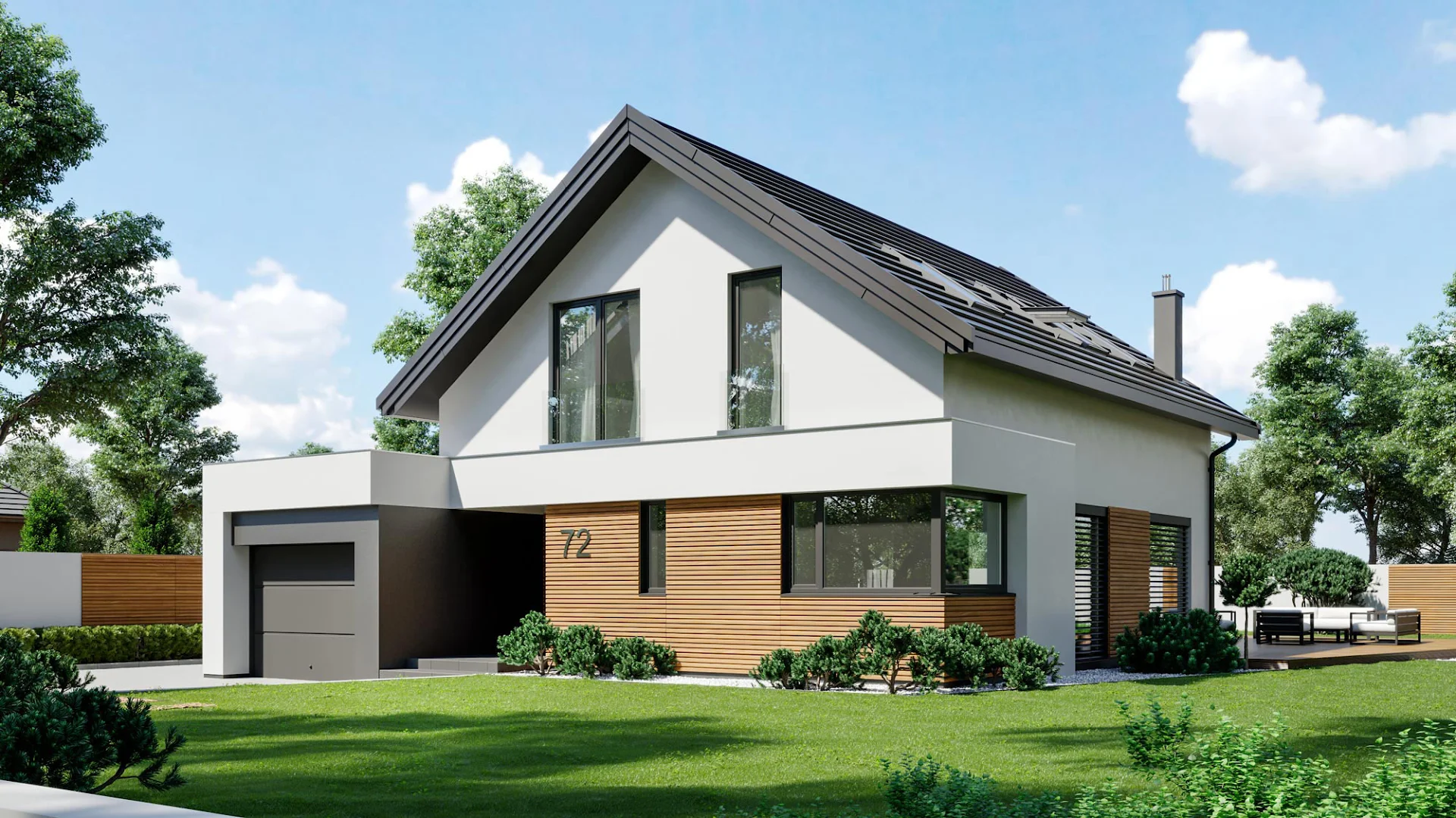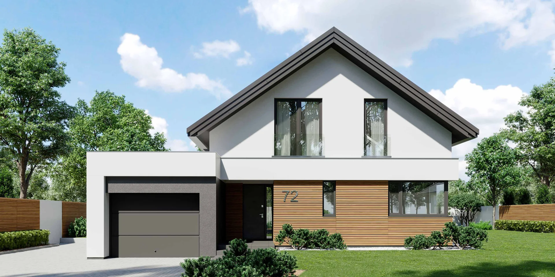 - Elewacja: tynk silikonowy połączony z drewnem elewacyjnym.
