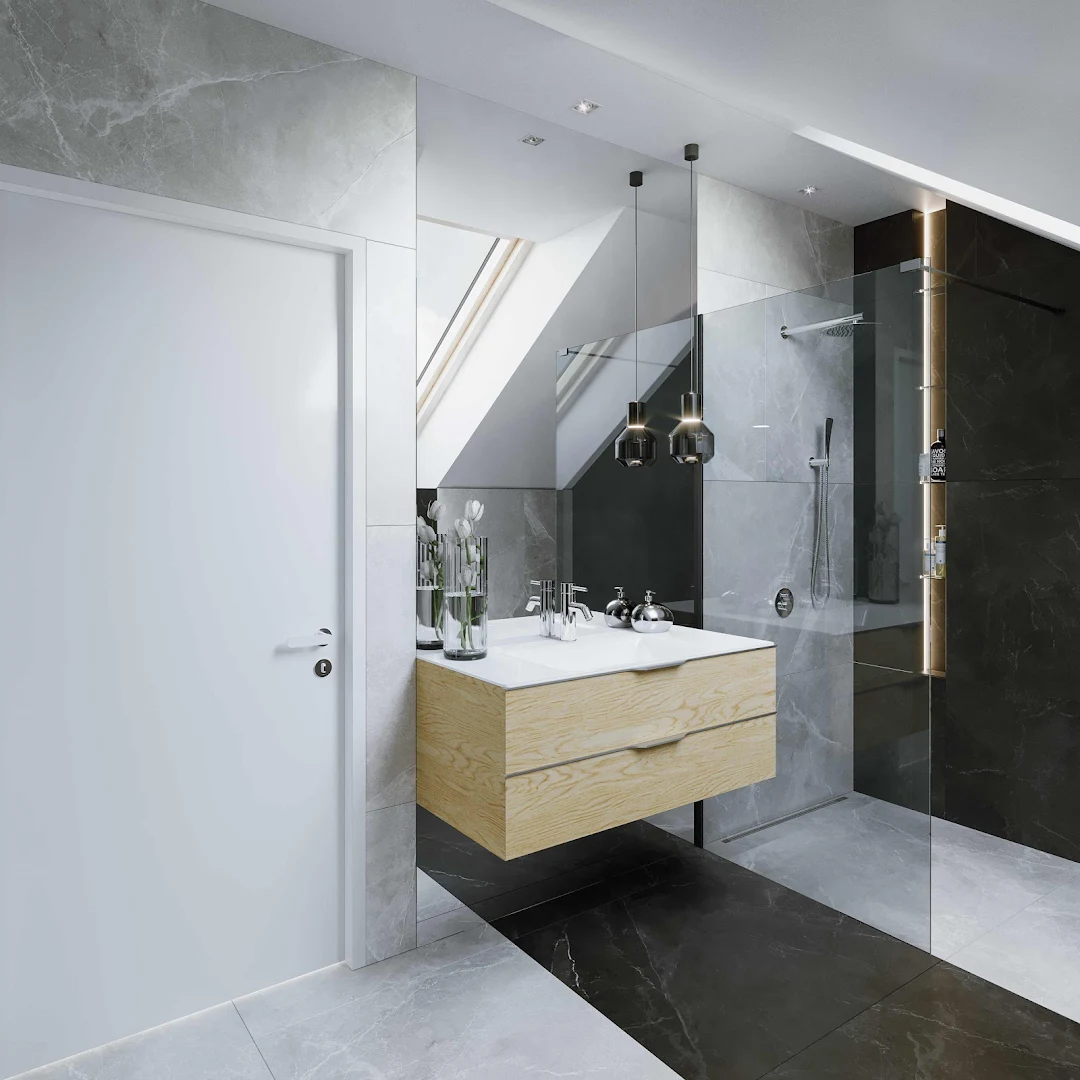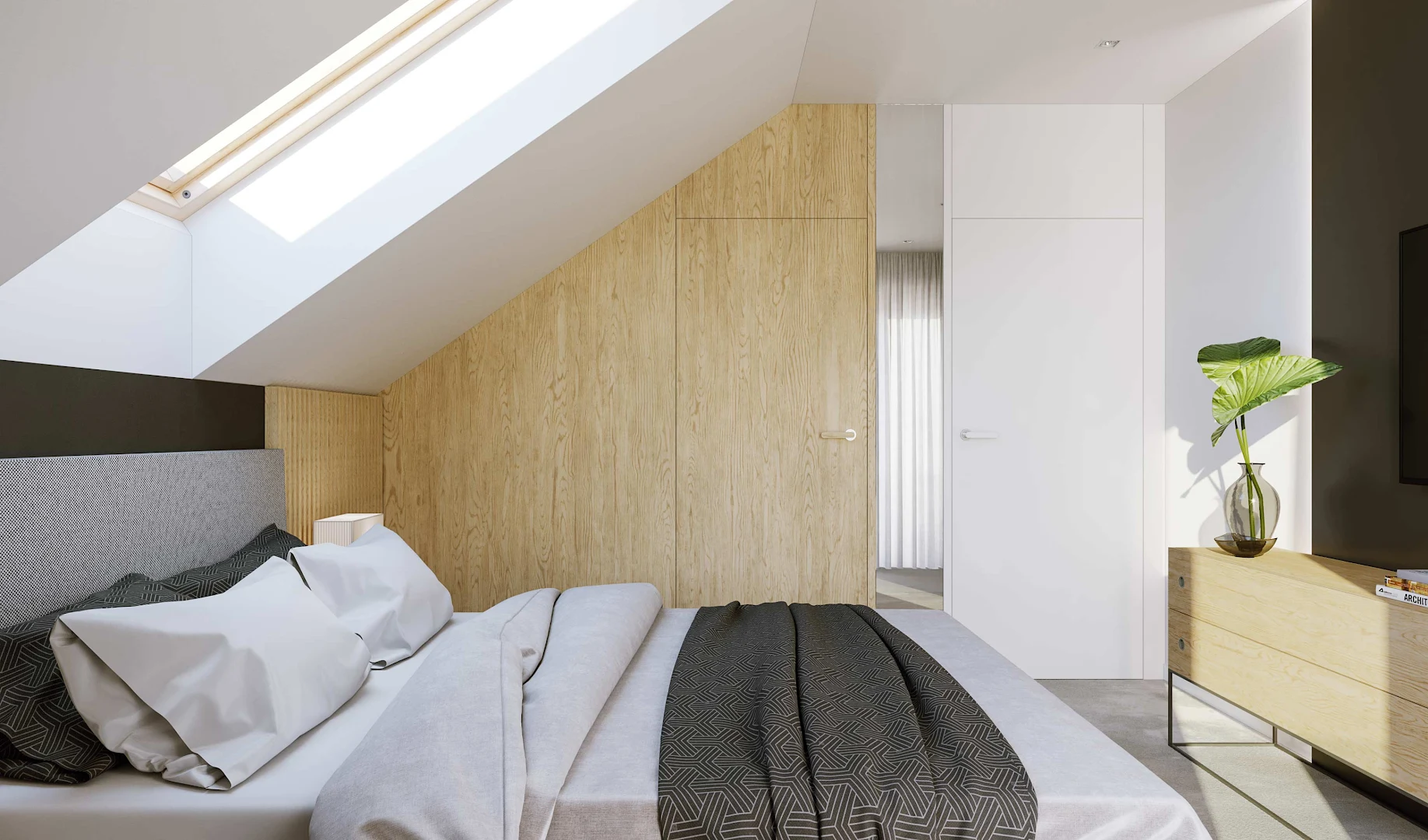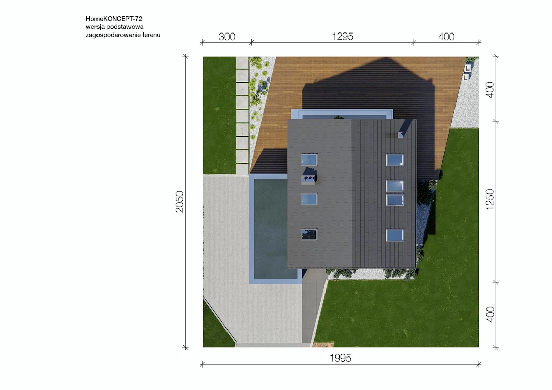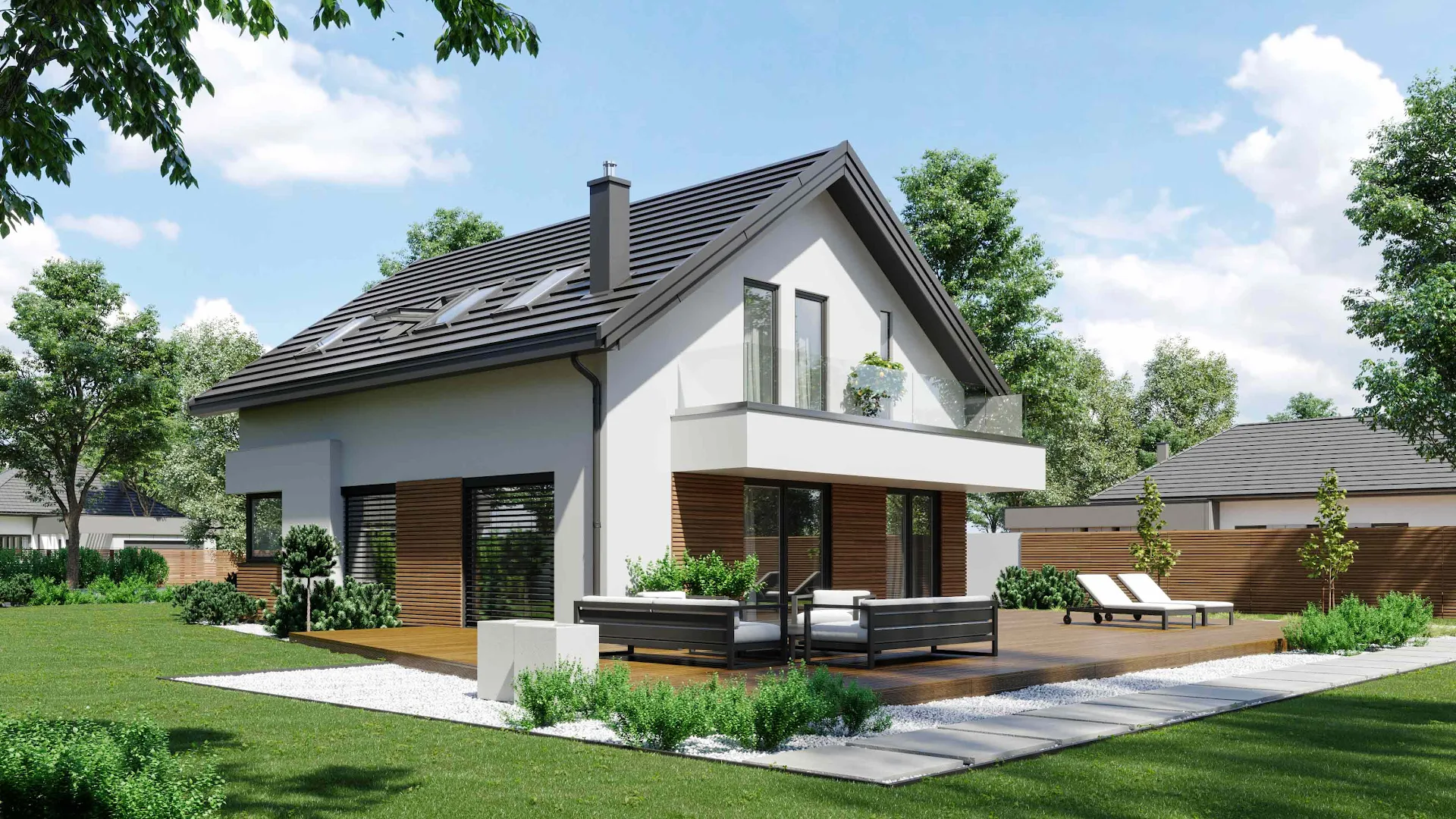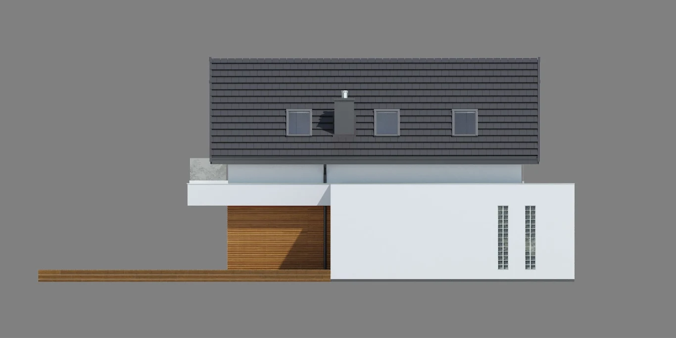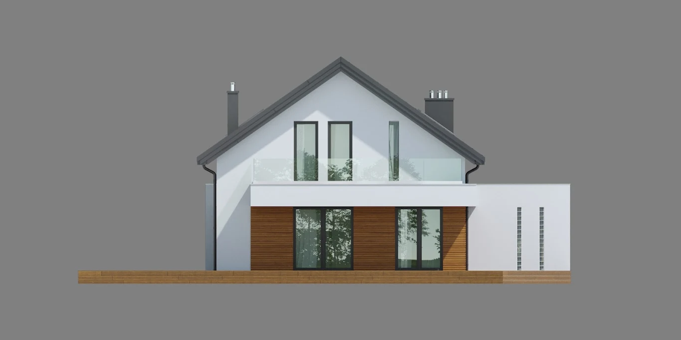 - Elewacja: tynk silikonowy połączony z drewnem elewacyjnym.