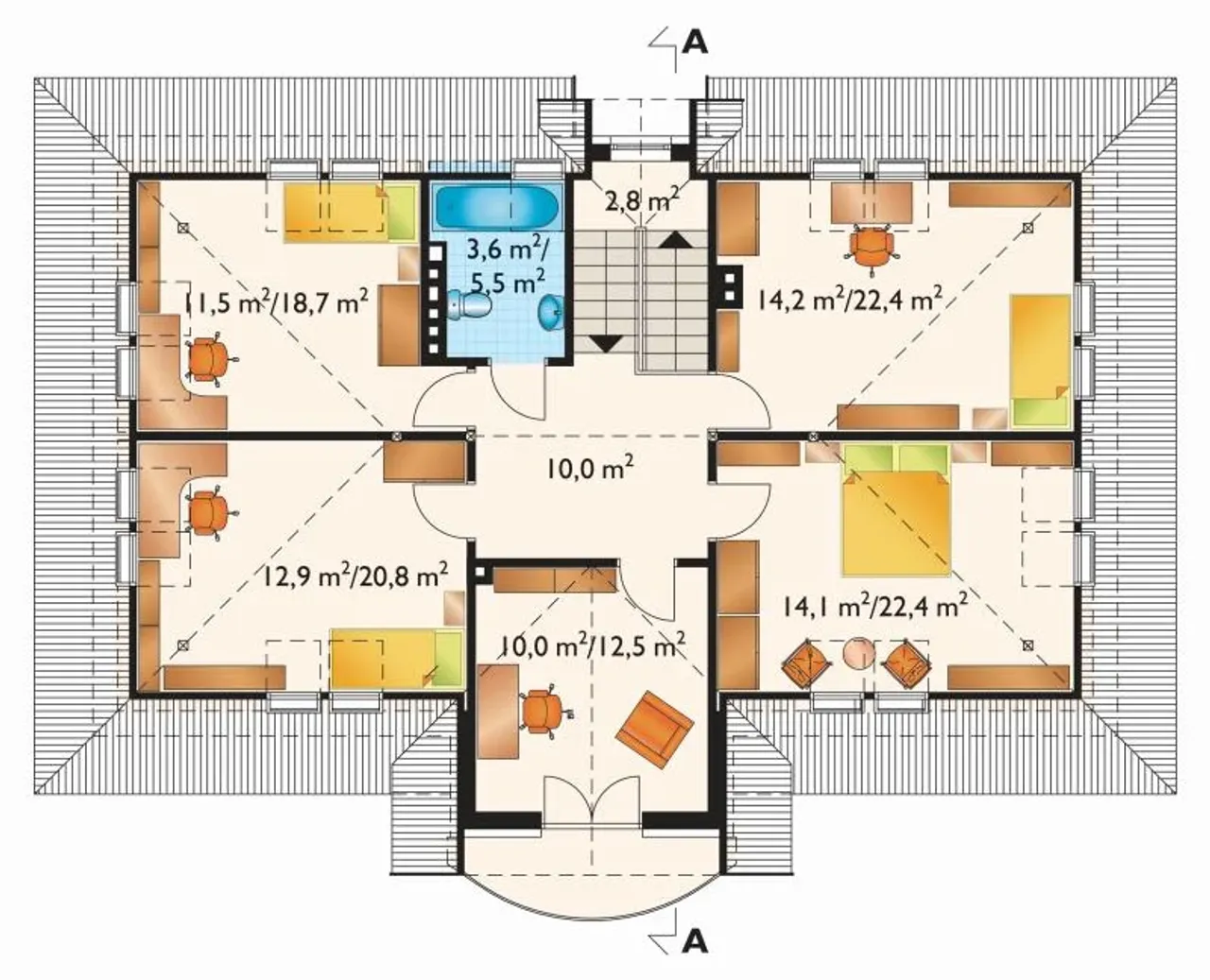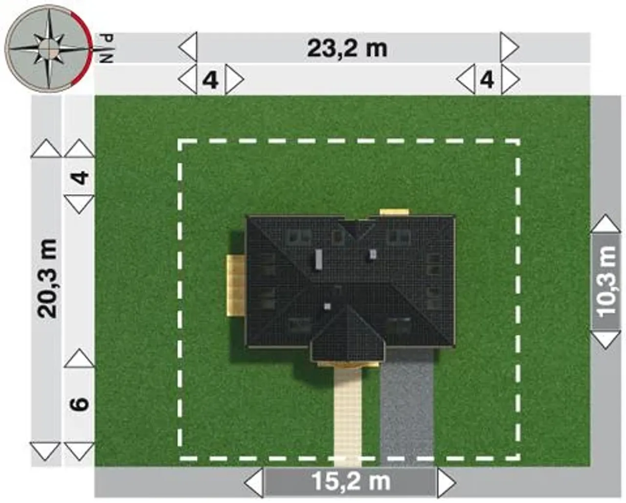 - rzut dachu - ukazuje jego kształt, wymiary, kąt nachylenia połaci, rozmieszczenie okien połaciowych, lukarn, świetlików i rur spustowych, pokazuje rozmieszczenie kominów i informuje o sposobie odwodnienia: rozmieszczeniu i rozmiarach rynien