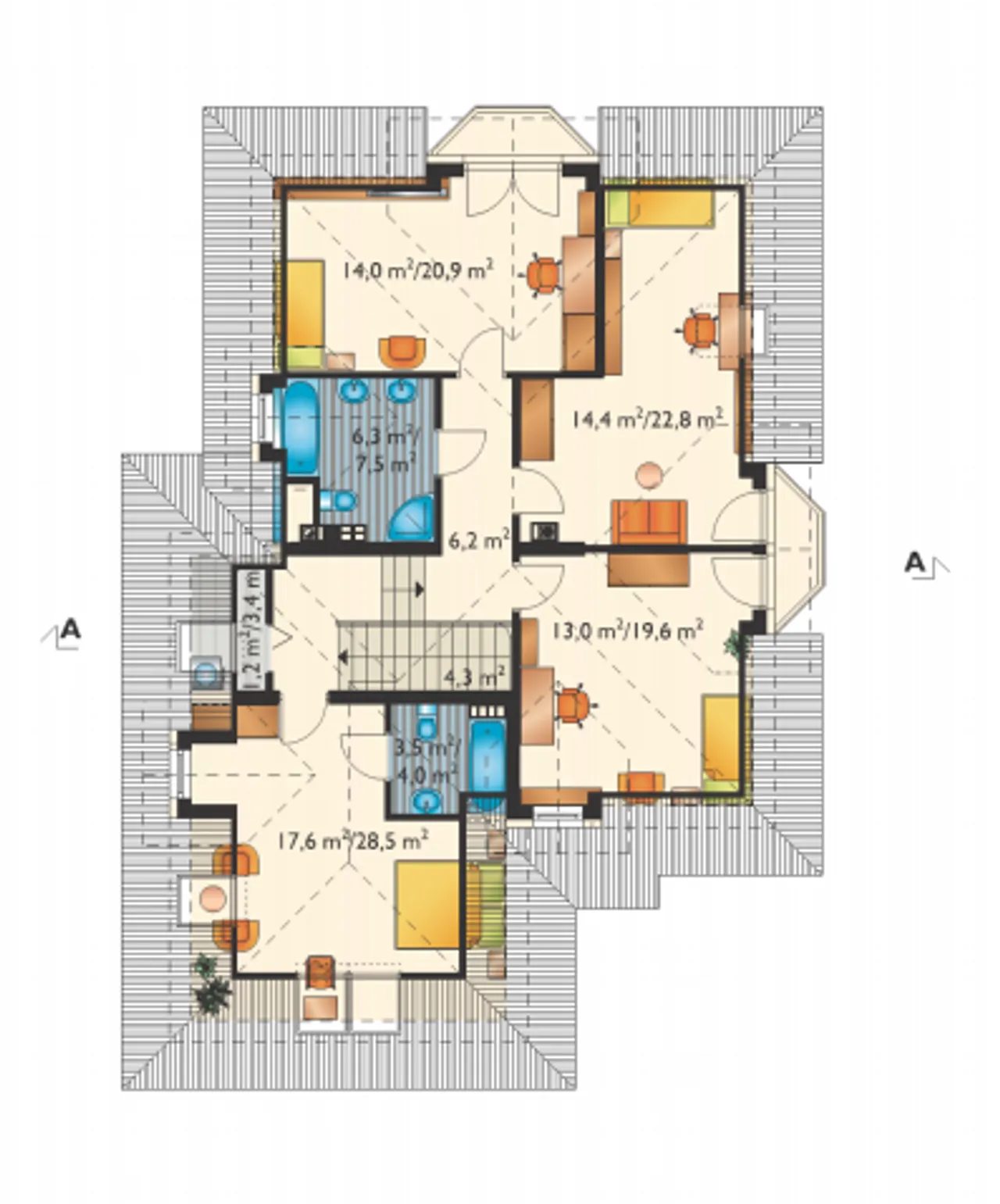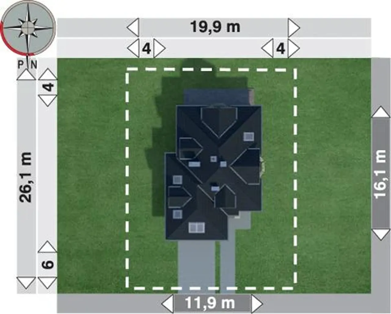 - rzut dachu - ukazuje jego kształt, wymiary, kąt nachylenia połaci, rozmieszczenie okien połaciowych, lukarn, świetlików i rur spustowych, pokazuje rozmieszczenie kominów i informuje o sposobie odwodnienia: rozmieszczeniu i rozmiarach rynien