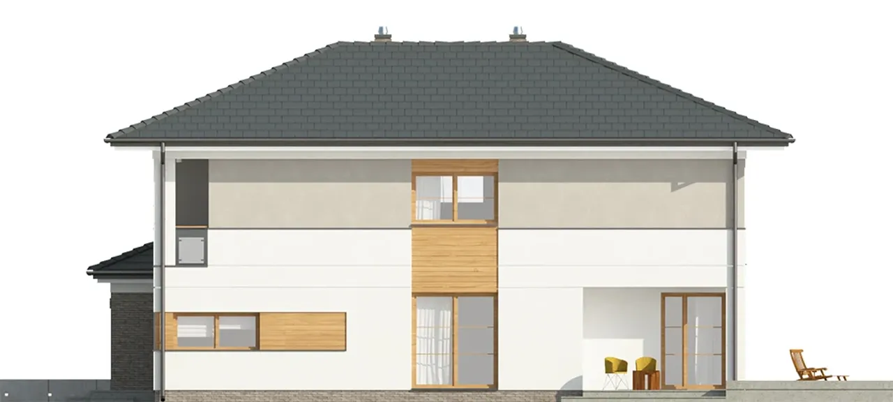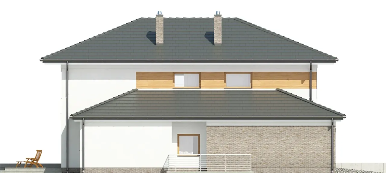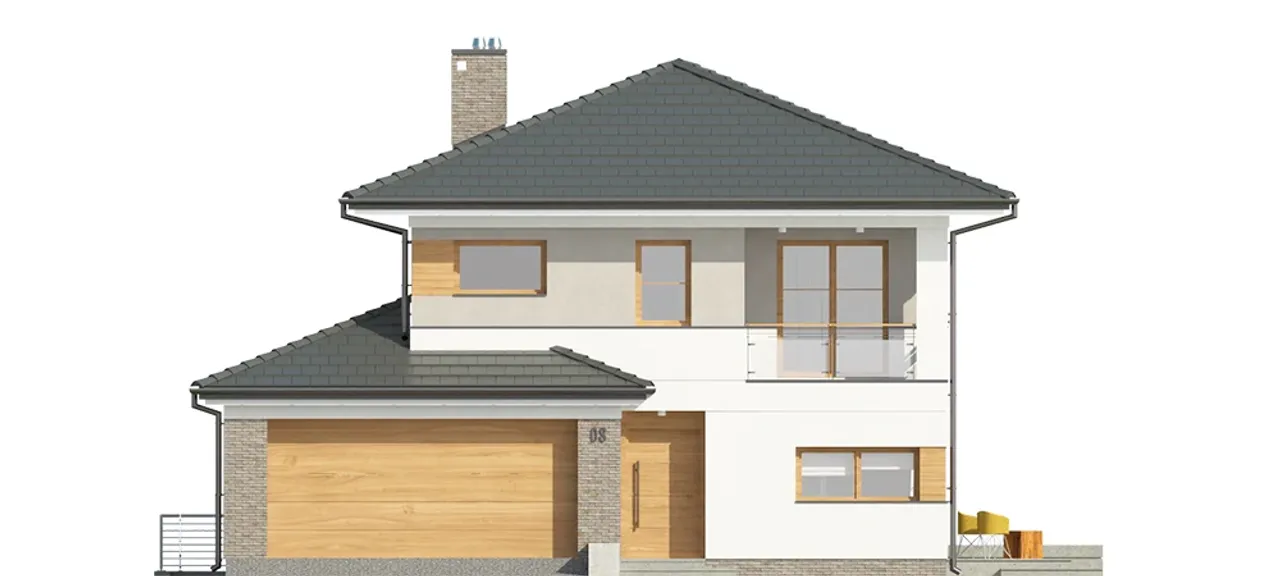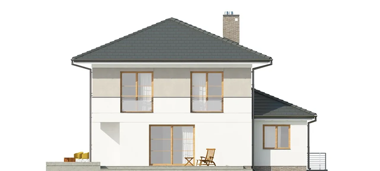 Stolarka okienna i drzwiowa wykonana z nowoczesnego PVC oraz rolety zewnętrzne tworzą wygodną i energooszczędną przestrzeń. Nowoczesny kominek w projekcie wprowadza wyjątkowy klimat w chłodne dni. Kalenica ustawiona prostopadle do drogi świetnie wpisze się w działki o różnych kształtach. Piwnica ułatwi przechowywanie oraz daje dodatkowe możliwości wykorzystania przestrzeni, np. na siłownię, pracownię lub pokój hobby.