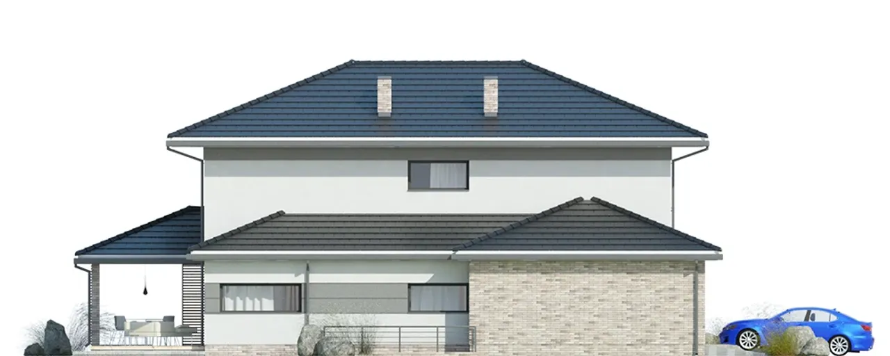 Nowoczesna sylwetka budynku z dachem wielospadowym i żelbetowym stropem sprawia, że projekt domu prezentuje się efektownie oraz harmonijnie wpisuje się w otoczenie. Przemyślane rozwiązania umożliwiają ekonomiczną eksploatację - możesz wybrać ogrzewanie gazowe lub na paliwo stałe, dopasowując system do własnych preferencji.