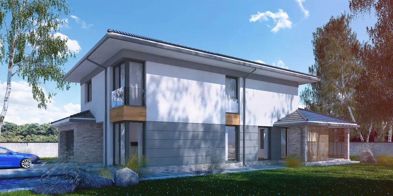 Nowoczesna bryła, przemyślane rozplanowanie wnętrz oraz pieczołowicie dobrane materiały pozwolą stworzyć miejsce sprzyjające relaksowi, domowej pracy i przyjmowaniu gości. Projekt domu wpisuje się w aktualne trendy architektoniczne i nadaje posesji indywidualny charakter.