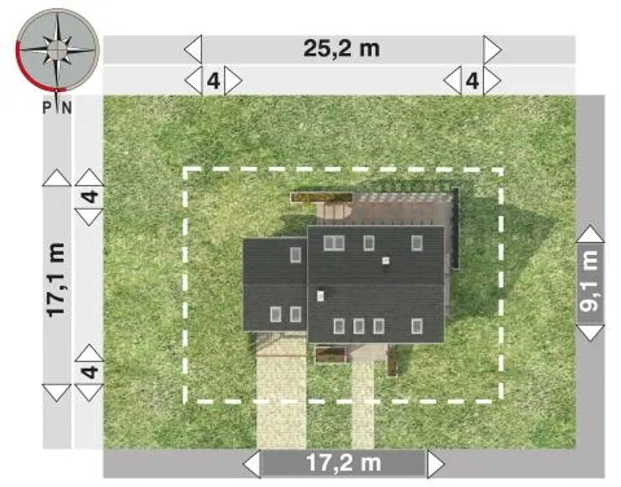 - rzut dachu - ukazuje jego kształt, wymiary, kąt nachylenia połaci, rozmieszczenie okien połaciowych, lukarn, świetlików i rur spustowych, pokazuje rozmieszczenie kominów i informuje o sposobie odwodnienia: rozmieszczeniu i rozmiarach rynien