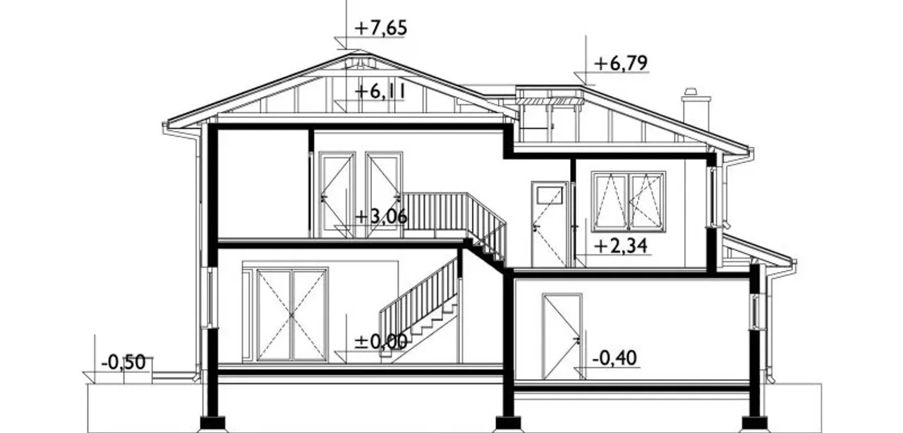 - przekroje - pokazują wszystkie elementy budynku po przecięciu go wzdłuż lub w poprzek od dachu do fundamentów tj. warstwy podłogi, stropów i dachu