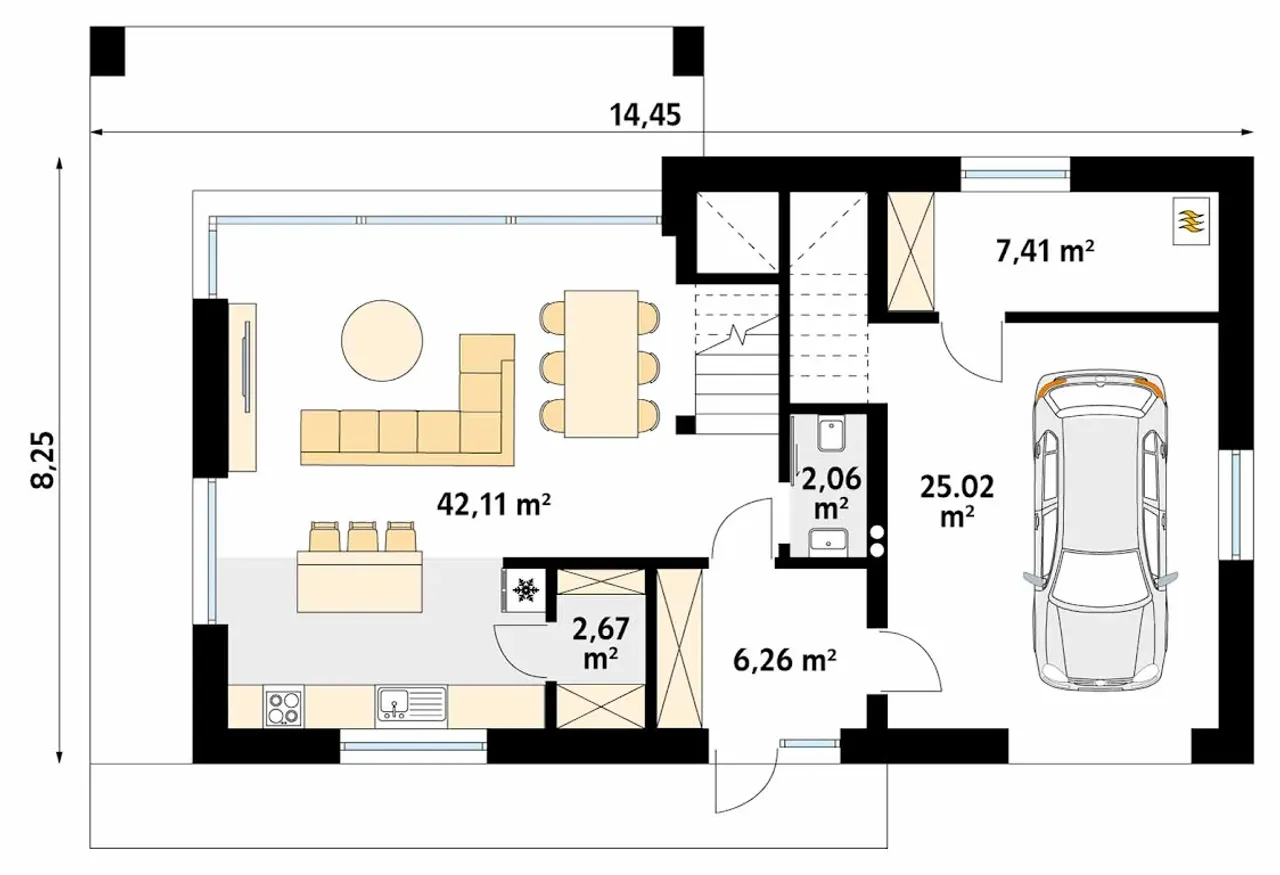 2. Salon + jadalnia + kuchnia | 42,11 m² |