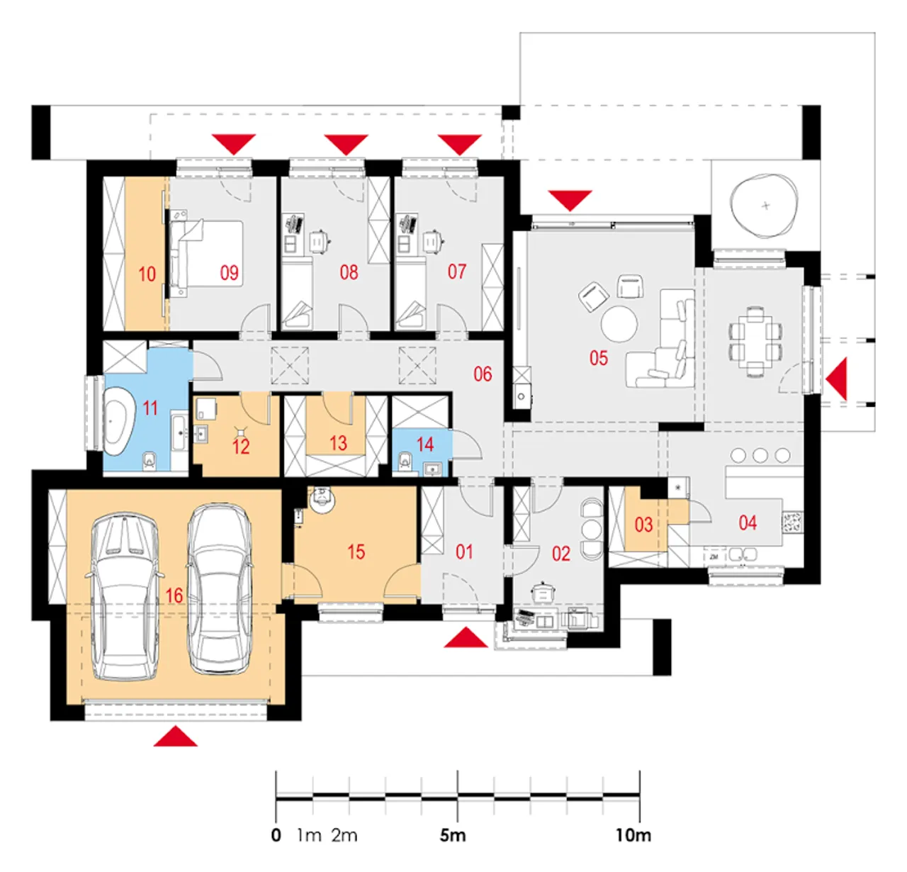 Strefa wypoczynkowa otwiera się na taras z zadaszeniami w postaci stylowej pergoli drewnianej lub trwałego żelbetowego rozwiązania. Garaż ulokowany od strony frontowej zapewnia bezproblemowy dostęp, a rolę kotłowni pełni nowocześnie zaplanowane pomieszczenie - ogrzewanie może być gazowe lub na paliwo stałe, w zależności od Twoich preferencji.