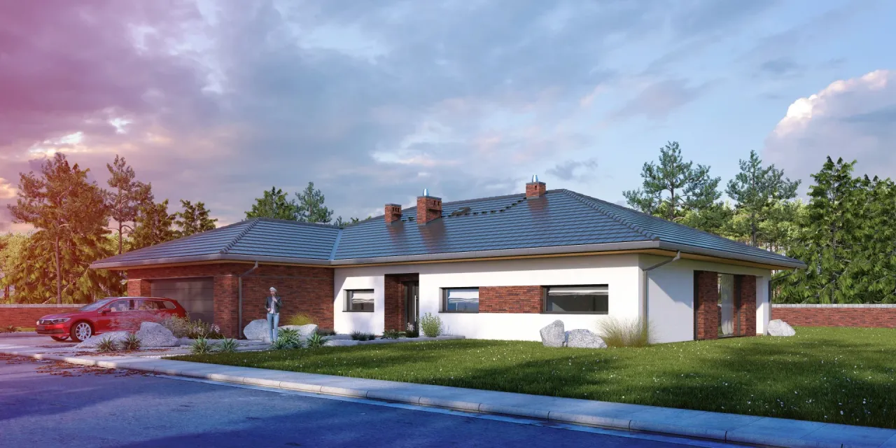 Parterowy układ umożliwia komfortowe życie bez uciążliwych schodów. Solidny drewniany strop w połączeniu z przemyślaną konstrukcją nośną gwarantuje długowieczność budynku. Starannie dobrane okna i drzwi PVC skutecznie chronią przed chłodem, a żaluzje zewnętrzne podnoszą wygodę oraz bezpieczeństwo mieszkańców. Segmentowa brama garażowa usprawnia wjazd i wyjazd nawet większym samochodem.