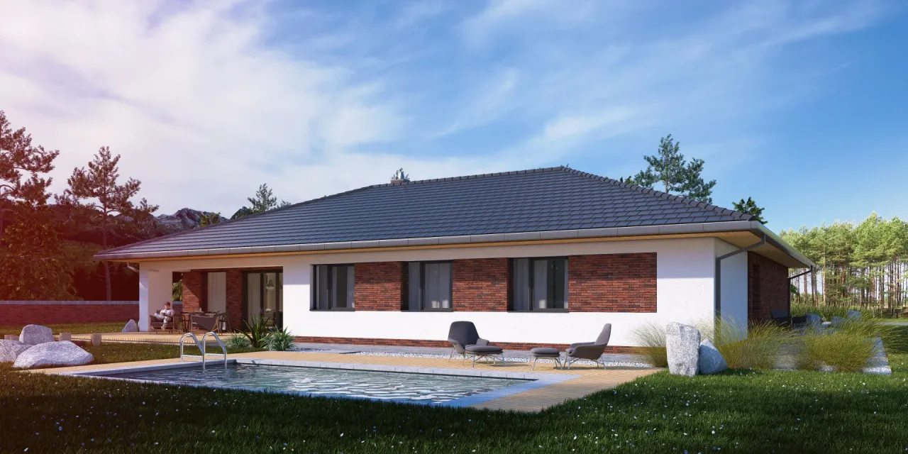 W projekcie zastosowano ściany z pustaka ceramicznego Porotherm (gr. 25 cm), dodatkowo ocieplone styropianem Termo Organika (20 cm). Taka kombinacja skutecznie izoluje wnętrza zarówno zimą, jak i podczas upałów. Dach wielospadowy, wykonany w konstrukcji drewnianych wiązarów prefabrykowanych, pokryty jest wysokogatunkową dachówką ceramiczną, a dodatkowa warstwa wełny mineralnej Rockwool zapewnia ochronę przed stratami ciepła.