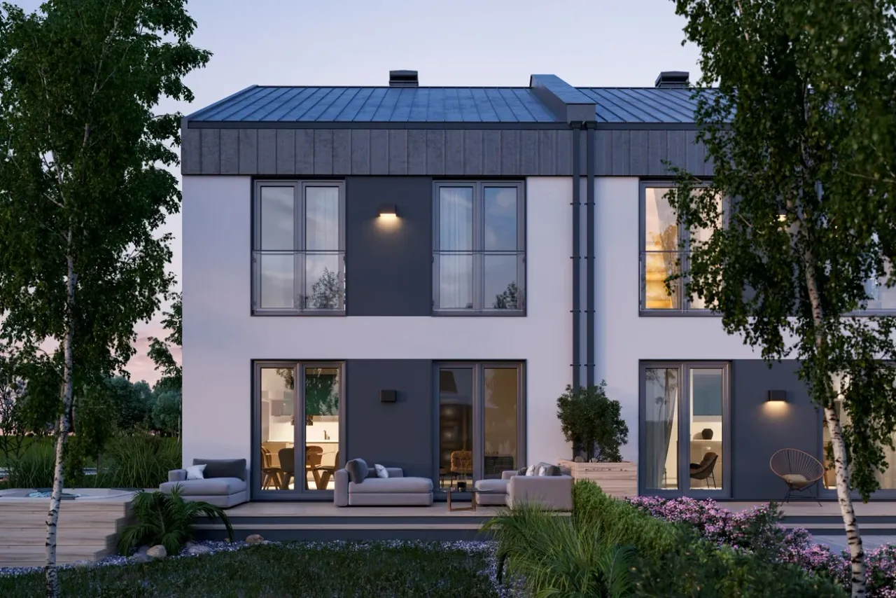 piętrowy Projekt domu Iryda Nano Duo to ciekawa propozycja dla rodziny poszukującej nowoczesnego i funkcjonalnego rozwiązania. Dom wyróżnia się kompaktowym układem pomieszczeń, co sprzyja praktyczności i wygodzie użytkowania. Otwarta przestrzeń dzienna doskonale integruje kuchnię, jadalnię i salon, co sprzyja wspólnemu spędzaniu czasu. Dobrze doświetlone wnętrza dzięki dużym przeszkleniom tworzą przyjemną atmosferę. Dodatkowym atutem jest taras, który stanowi idealne miejsce do relaksu. Projekt uwzględnia także miejsce na parkowanie, co jest niezwykle wygodne w codziennym użytkowaniu.