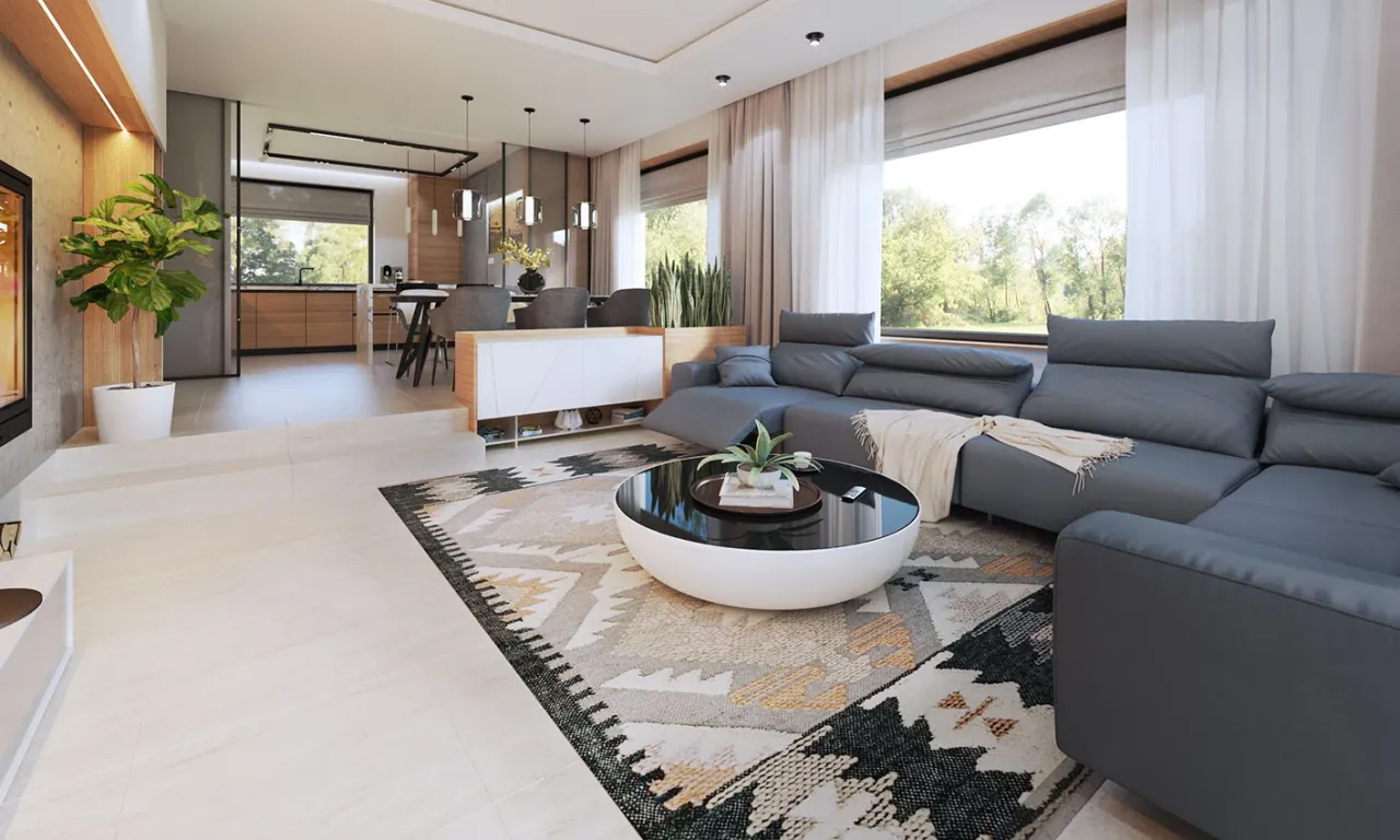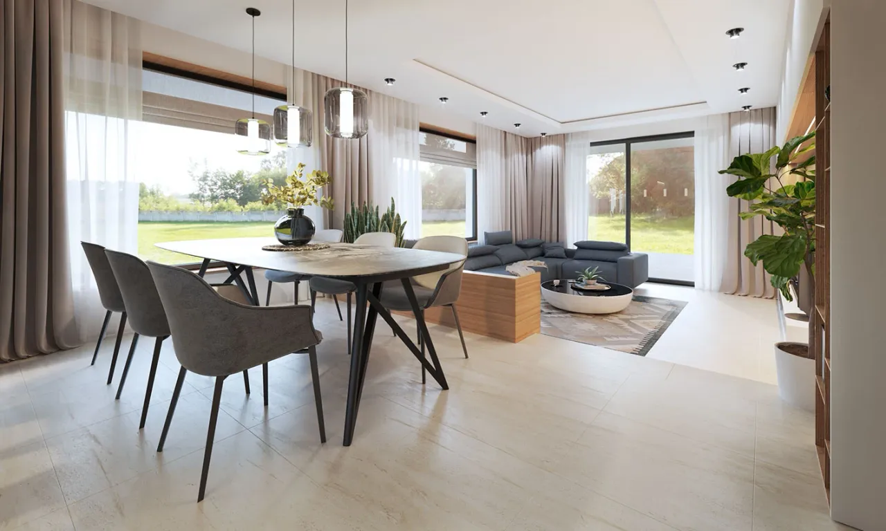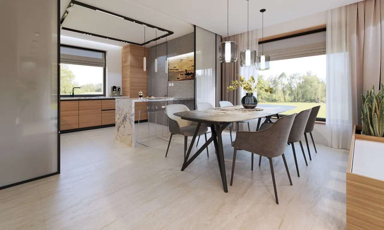 Przestronny parter z pięcioma pokojami daje dużą swobodę aranżacji - domownicy zyskują zarówno prywatność, jak i wygodę wspólnego spędzania czasu. Duży salon otwiera się na taras, tworząc idealne miejsce na relaks i spotkania w gronie bliskich. Dodatkowe pomieszczenia użytkowe, takie jak pralnia i spiżarnia, ułatwiają codzienną organizację. Z przodu budynku znajduje się praktyczny garaż dwustanowiskowy - to bezpieczna przystań dla aut oraz wygoda w każdych warunkach pogodowych.