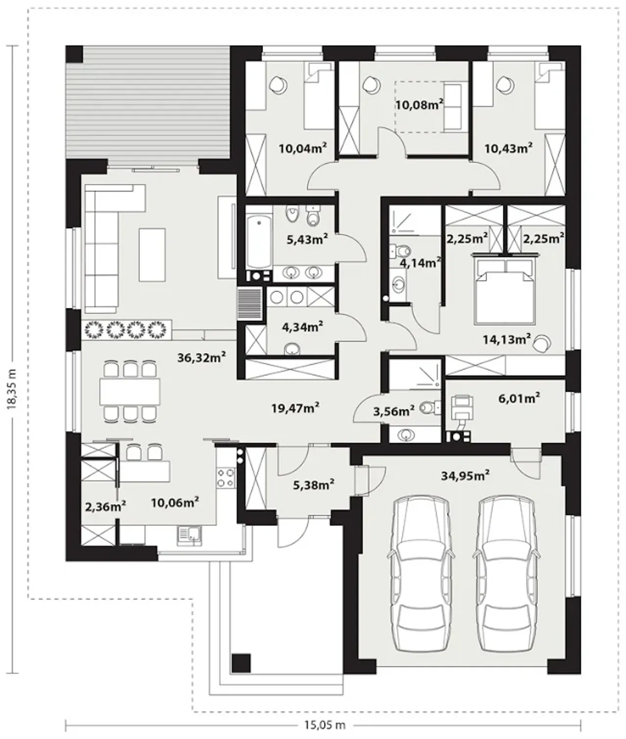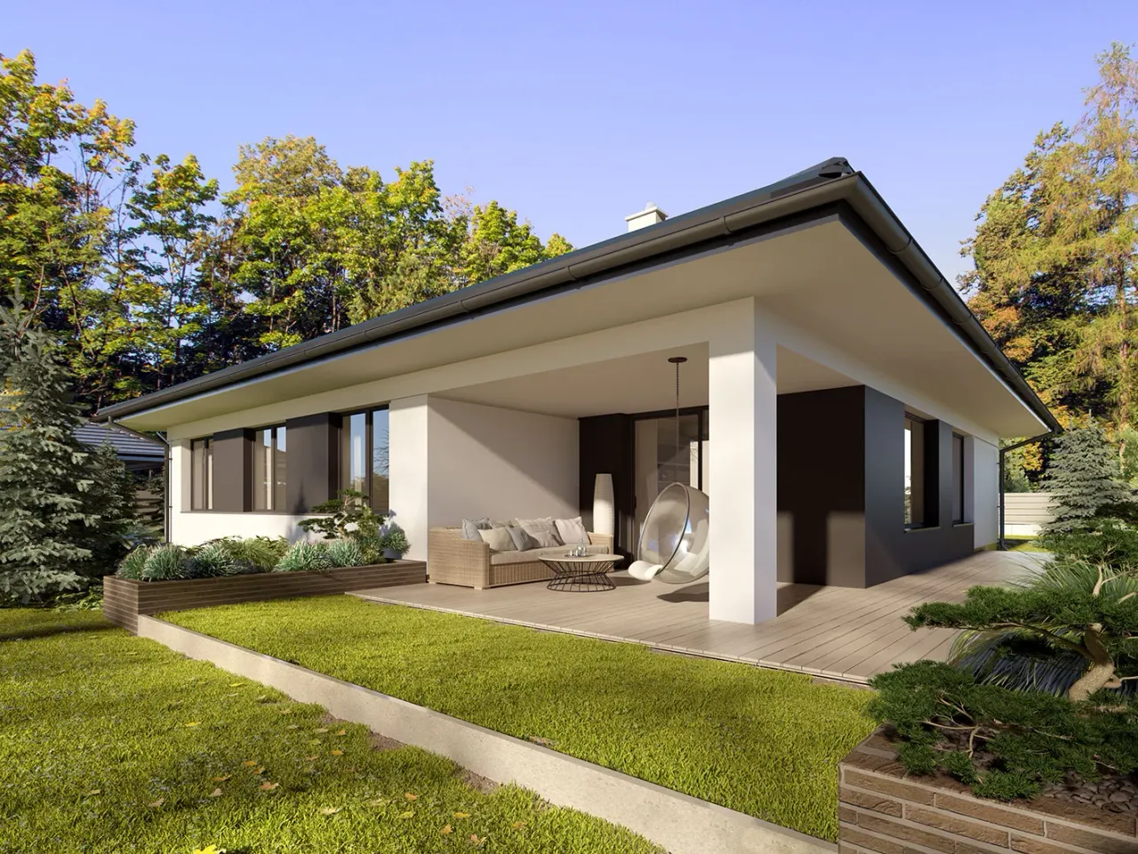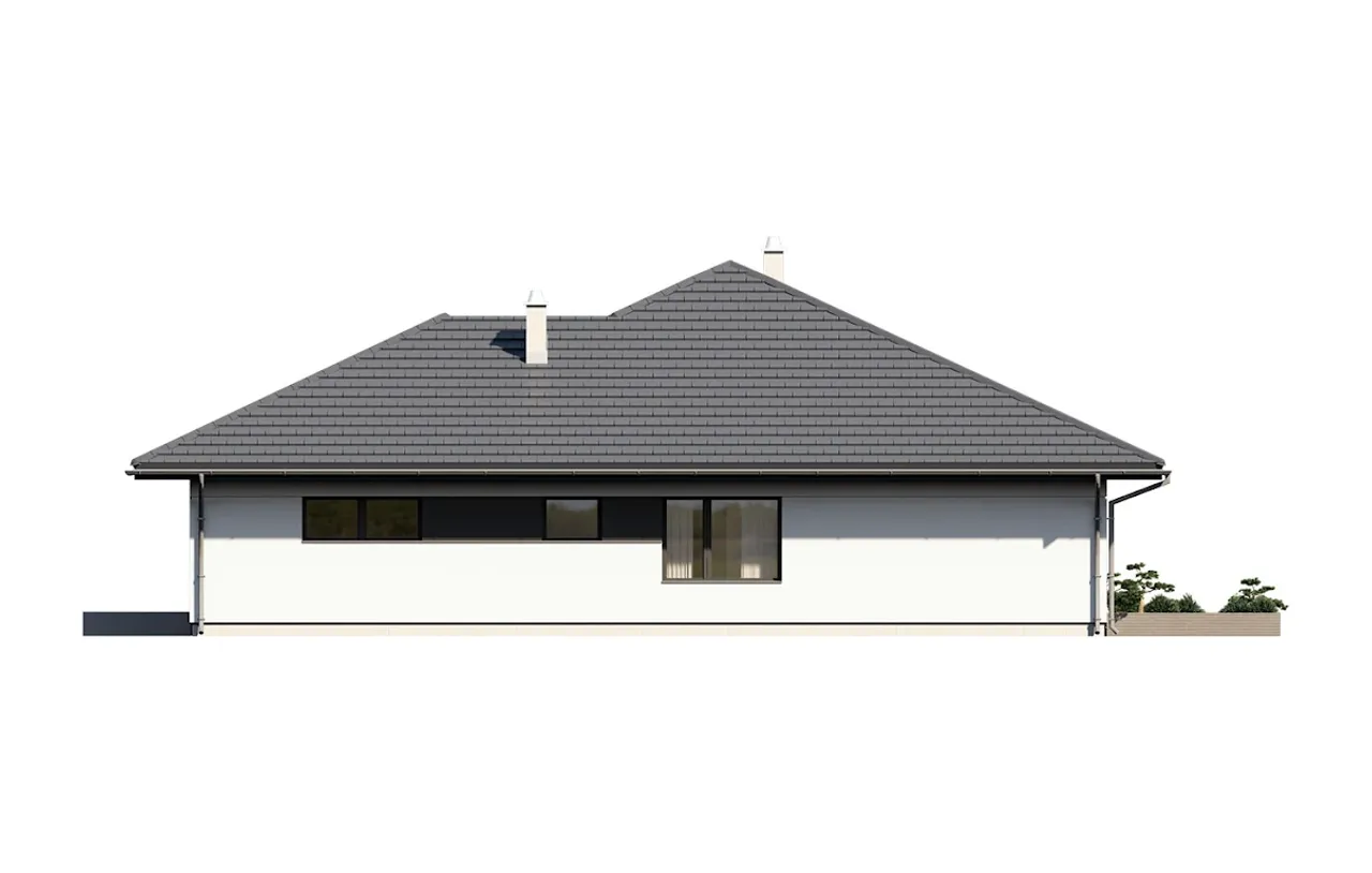 Projekt domu Irysek 7 to idealna propozycja dla osób ceniących przestrzeń, funkcjonalność i tradycyjny styl architektury. Dom z komfortowym garażem na dwa auta, dużą kotłownią i kominkiem został zaprojektowany z myślą o rodzinach poszukujących wygodnych, całorocznych rozwiązań. Przemyślana forma na planie litery T pozwala optymalnie wykorzystać działkę, a przestronny taras doskonale łączy wnętrze z otaczającą zielenią.
